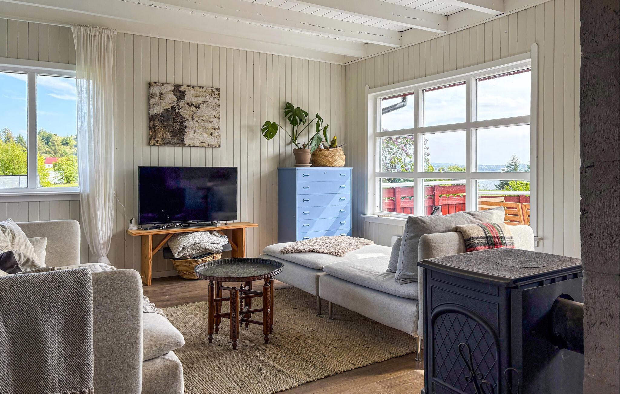 Dieses liebevoll eingerichtete Ferienhaus heißt Sie mit einer hellen und freundlichen Atmosphäre willkommen, in der Sie sich vom ersten Tag an wohlfühlen werden. Zaubern Sie sich hier leckere Mahlzeiten am einladenden Esstisch. Entfachen Sie den Kaminofen, lassen Sie bei einem heißen Tee den Blick über den Fjord schweifen und nutzen Sie die gemeinsame Zeit mit Ihren Liebsten für harmonische Spieleabende oder gemütliche Lesestunden auf dem Sofa.