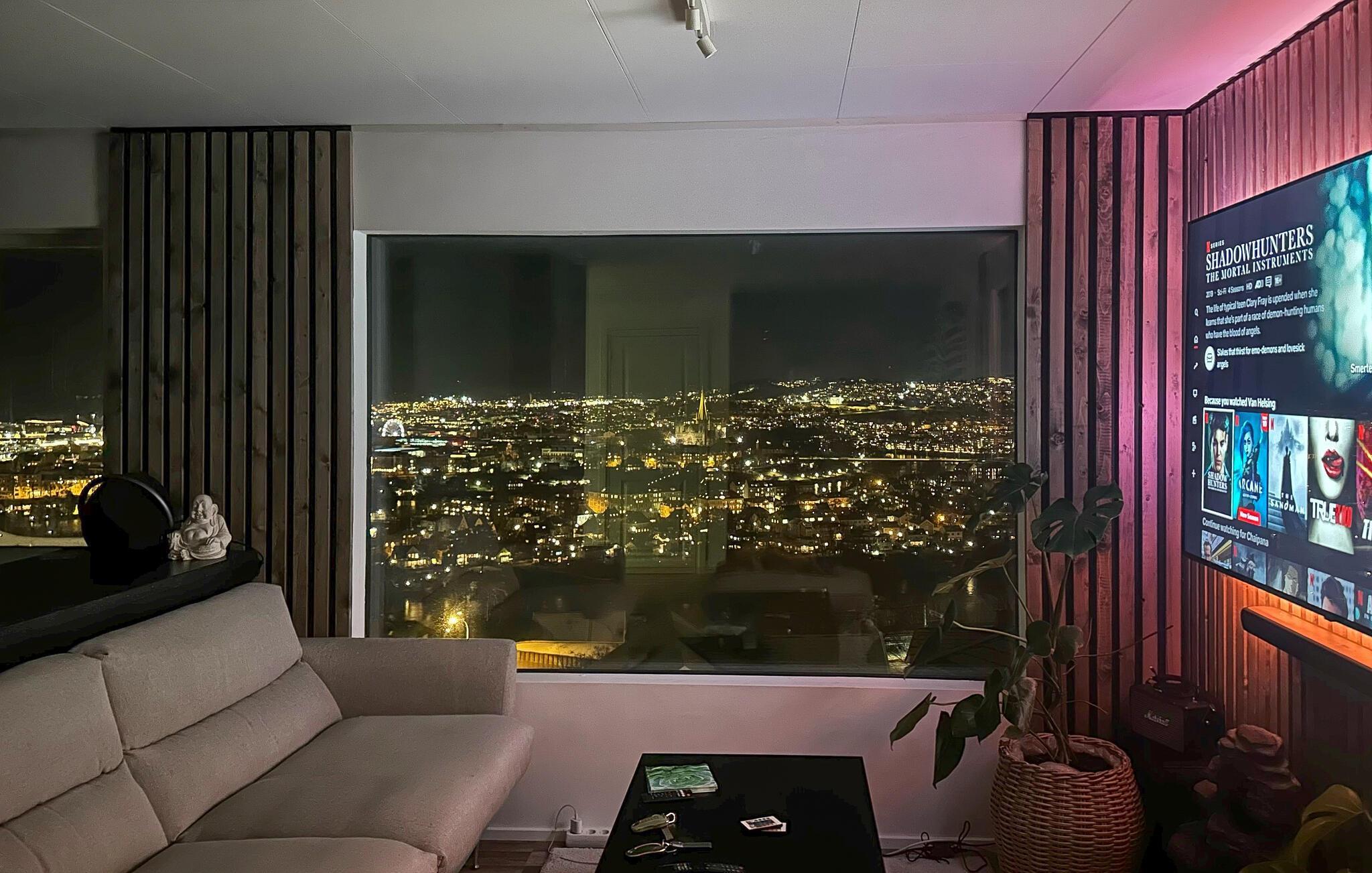 Packen Sie Ihre Koffer und erleben Sie Trondheim von seiner besten Seite. Ihre stilvolle Ferienwohnung besticht mit ihrer guten Lage und einer atemberaubenden Aussicht über die Stadt. Genießen Sie den Panoramablick aus den großen Fenstern, der Ihnen sowohl tagsüber als auch abends ein einzigartiges Erlebnis bietet. Die gemütliche Couch im Wohnzimmer lädt dazu ein, den Ausblick zu bewundern oder sich bei einem Film zu entspannen. Starten Sie den Tag mit einem leckeren Frühstück am Esstisch. Die moderne Küche ist mit hochwertigen Geräten ausgestattet, sodass Sie Ihre Mahlzeiten bequem zubereiten können. Dank der klaren Linien und der geschmackvollen Einrichtung strahlt die Wohnung eine harmonische Atmosphäre aus, die zum Wohlfühlen einlädt.