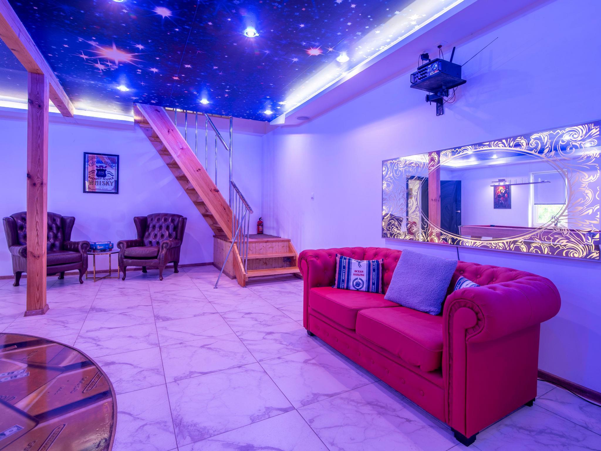 6-room house 500 m2 on 2 levels. Living/dining room with 1 sofabed, open-hearth fireplace, Scandinavian wood stove, satellite TV, radio and hi-fi system. Exit to the garden, to the terrace. 1 room with 1 french bed. Playroom. Open kitchen (oven, dishwasher, 4 ceramic glass hob hotplates, microwave, freezer). Shower/WC. Upper floor: 1 room with 1 french bed. 1 room with 3 beds. 1 room with 3 beds. Bath/WC. Gas heating. Terrace. Terrace furniture, barbecue, deck chairs. Facilities: sauna, logs (free). Internet (WiFi, free). Parking. Please note: maximum 3 pets/ dogs allowed. Smoke alarm. Playroom: 50 m2 billiard room with karaoke machines on the ground floor. On request: car for 5 pax (50euro/day + fuel). Motorboat (extra paid 200 EUR/day). TV with DE channels.