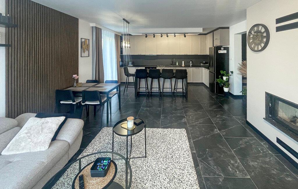Moderne Linien, geschmackvolles Interieur und warme Erdtöne kennzeichnen dieses attraktive Haus, das Sie im Kurort Kamien Pomorski erwartet. Die Materialien und das Dekor lassen den offenen Wohnraum elegant und gemütlich zugleich wirken. Jung und Alt werden sich hier wohlfühlen. Schwingen Sie den Kochlöffel in der großen Küche zusammen, die Mahlzeiten können an warmen Sommertagen auf der Terrasse eingenommen werden.