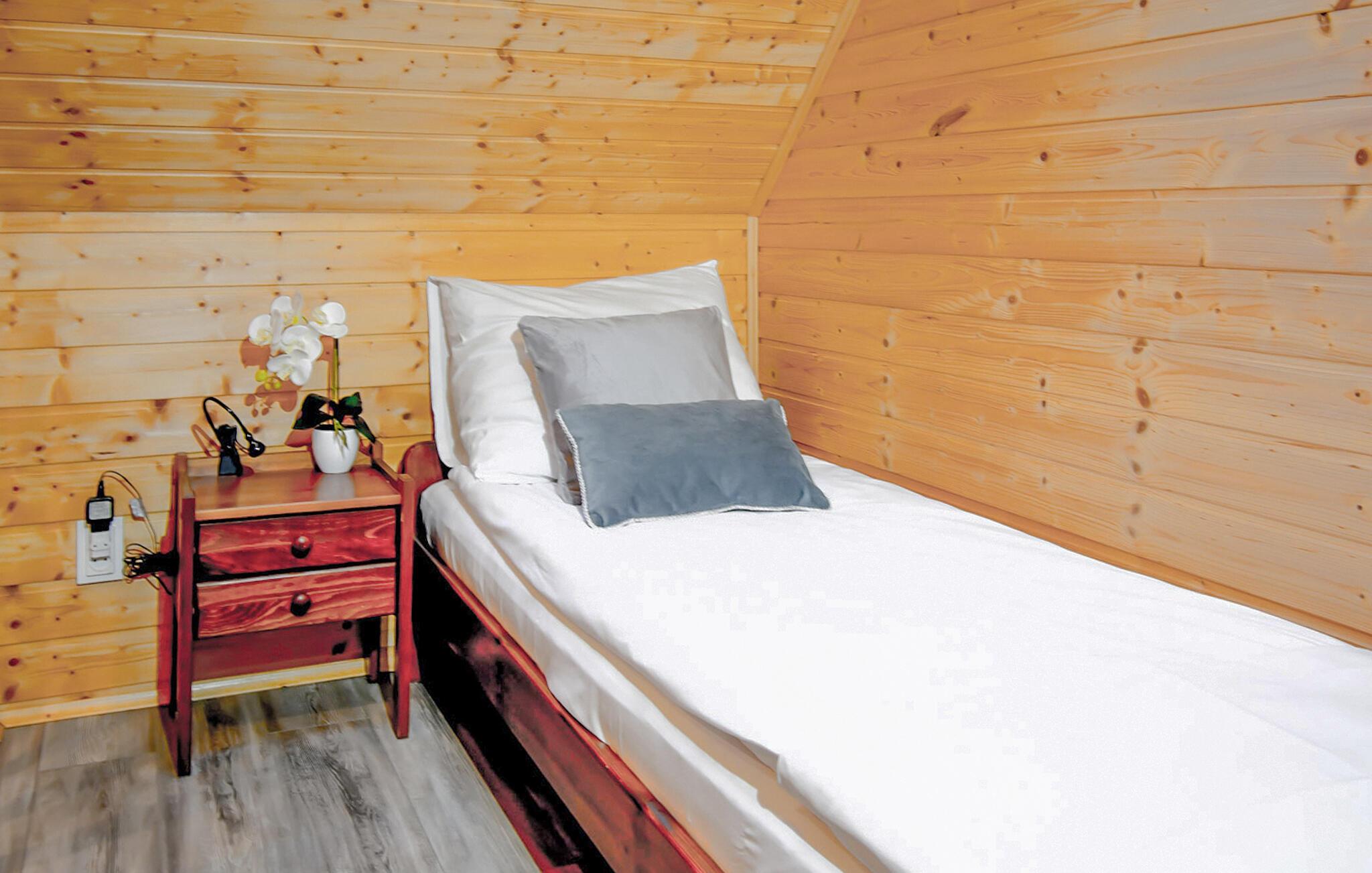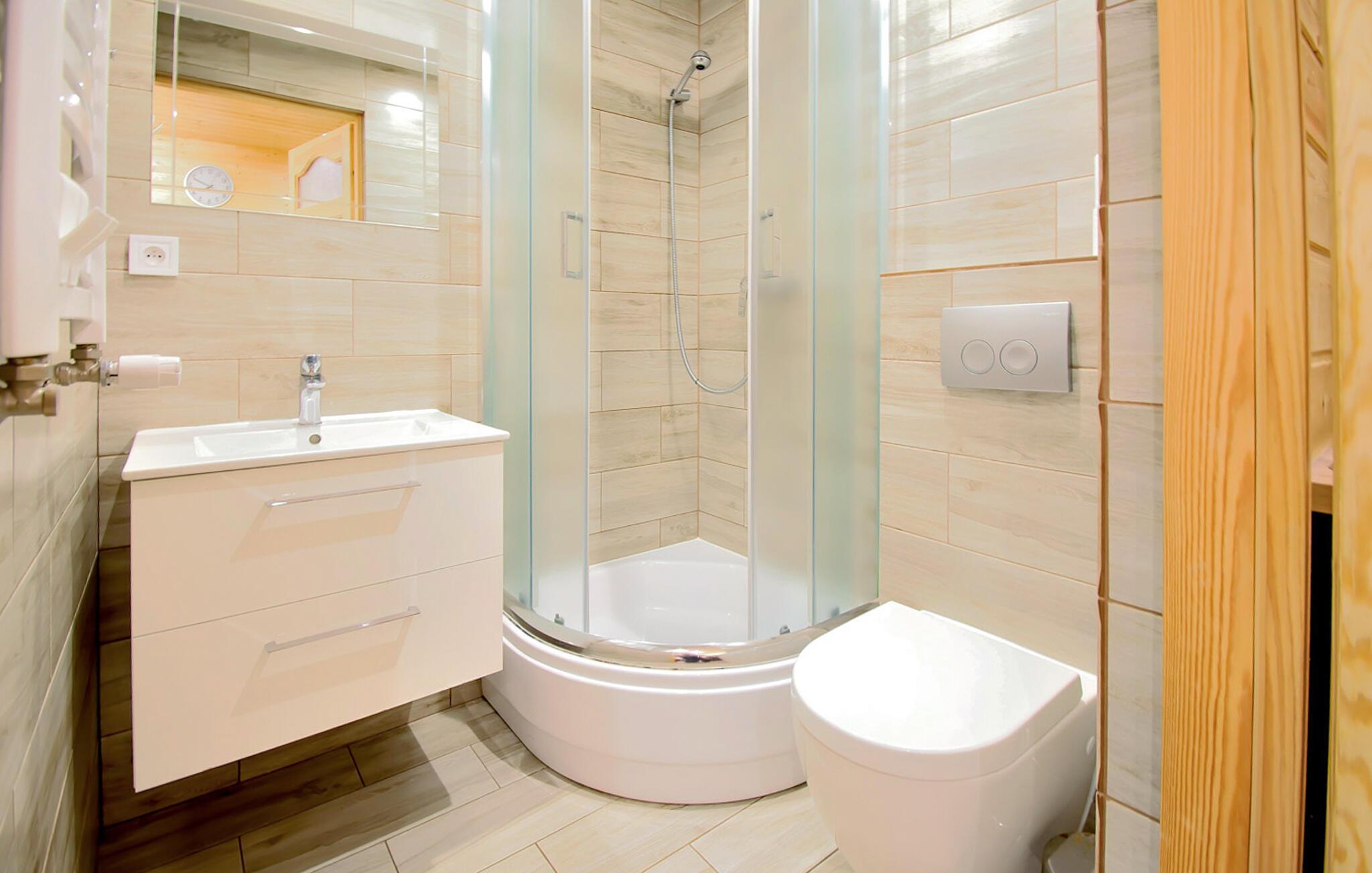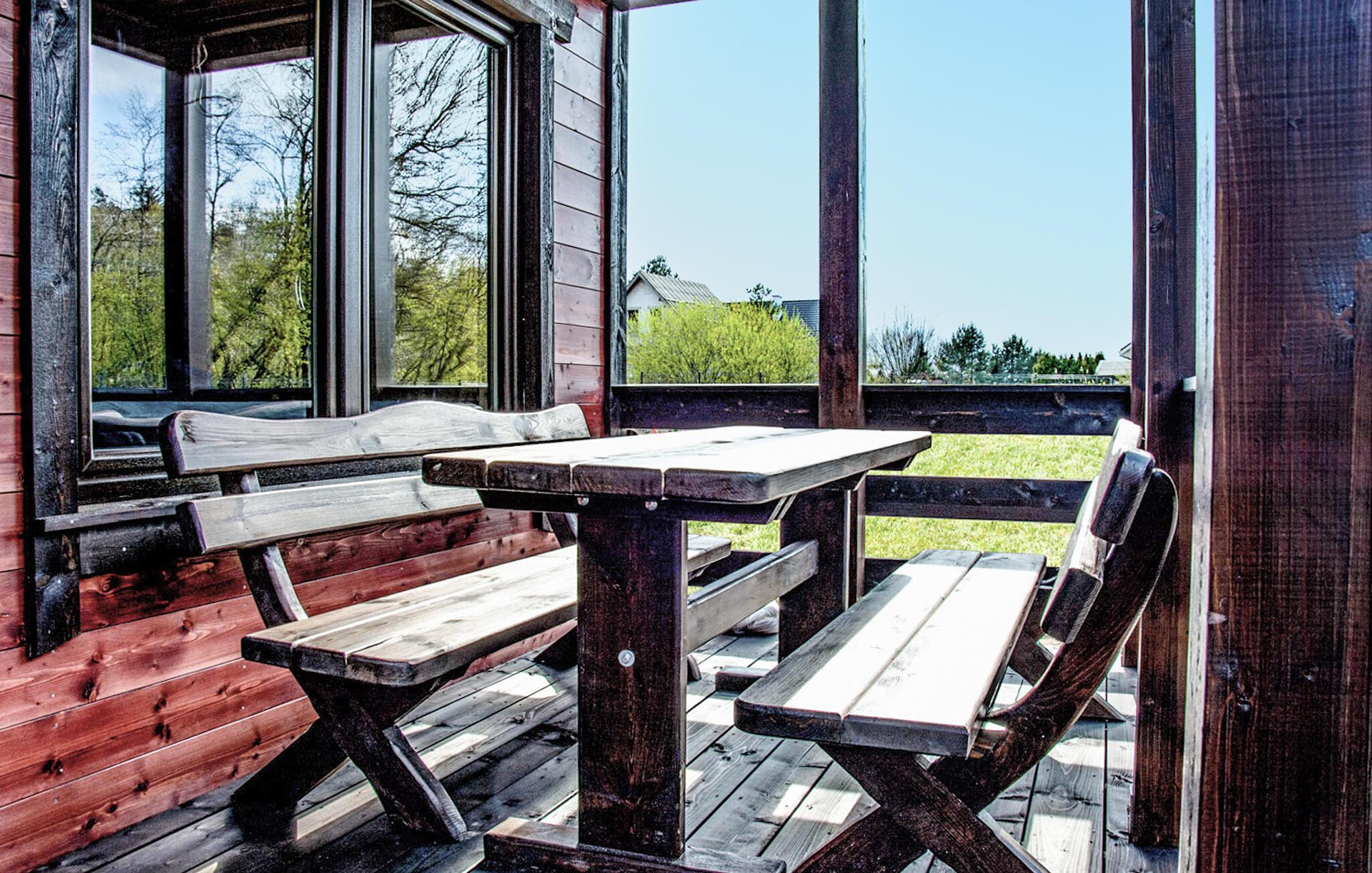 Dieses gemütliche Ferienhaus in Mielenko vereint rustikalen Charme und moderne Ausstattung. Die Veranda lädt Sie ein, die frische Luft zu genießen, während die Kinder sich auf den zahlreichen Spielgeräten oder dem Volleyballfeld austoben. Drinnen finden Sie eine warme, behagliche Atmosphäre mit allem Komfort für einen sorgenfreien Aufenthalt. Die offene Wohnküche ist ideal für gesellige Familienabende, und draußen verspricht die Feuerstelle unvergessliche Abende unter dem Sternenhimmel.