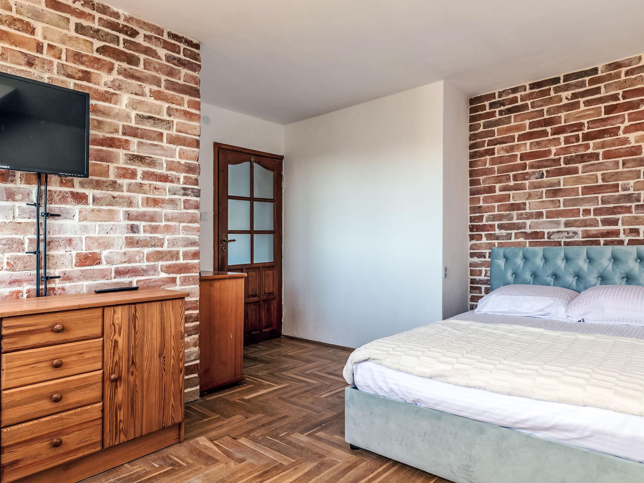 5-room terraced house 100 m2. Partly with sloping ceilings: living/dining room with 2 double sofabeds and TV. Exit to the balcony. 1 room with 1 double bed (140 cm, length 200 cm). Open kitchen (oven, dishwasher, 4 ceramic glass hob hotplates, microwave, freezer, electric coffee machine). Shower/WC. Upper floor: living/dining room. Open gallery with 1 double bed (160 cm, length 200 cm). 1 room with 1 double bed (140 cm, length 200 cm). 1 room with 1 double bed (140 cm, length 200 cm). Shower/WC. Oil heating. Large balcony. Balcony furniture. Facilities: iron. Internet (WiFi). Instead of an enclosed bedroom, some sleeping areas are located in an open-plan area (gallery, alcove, etc.).