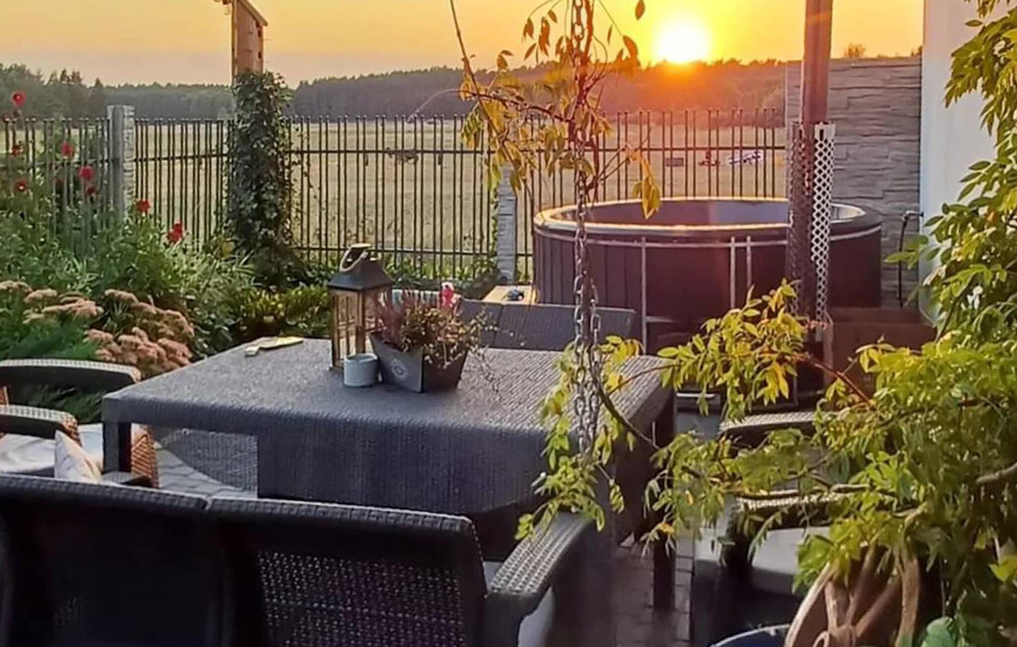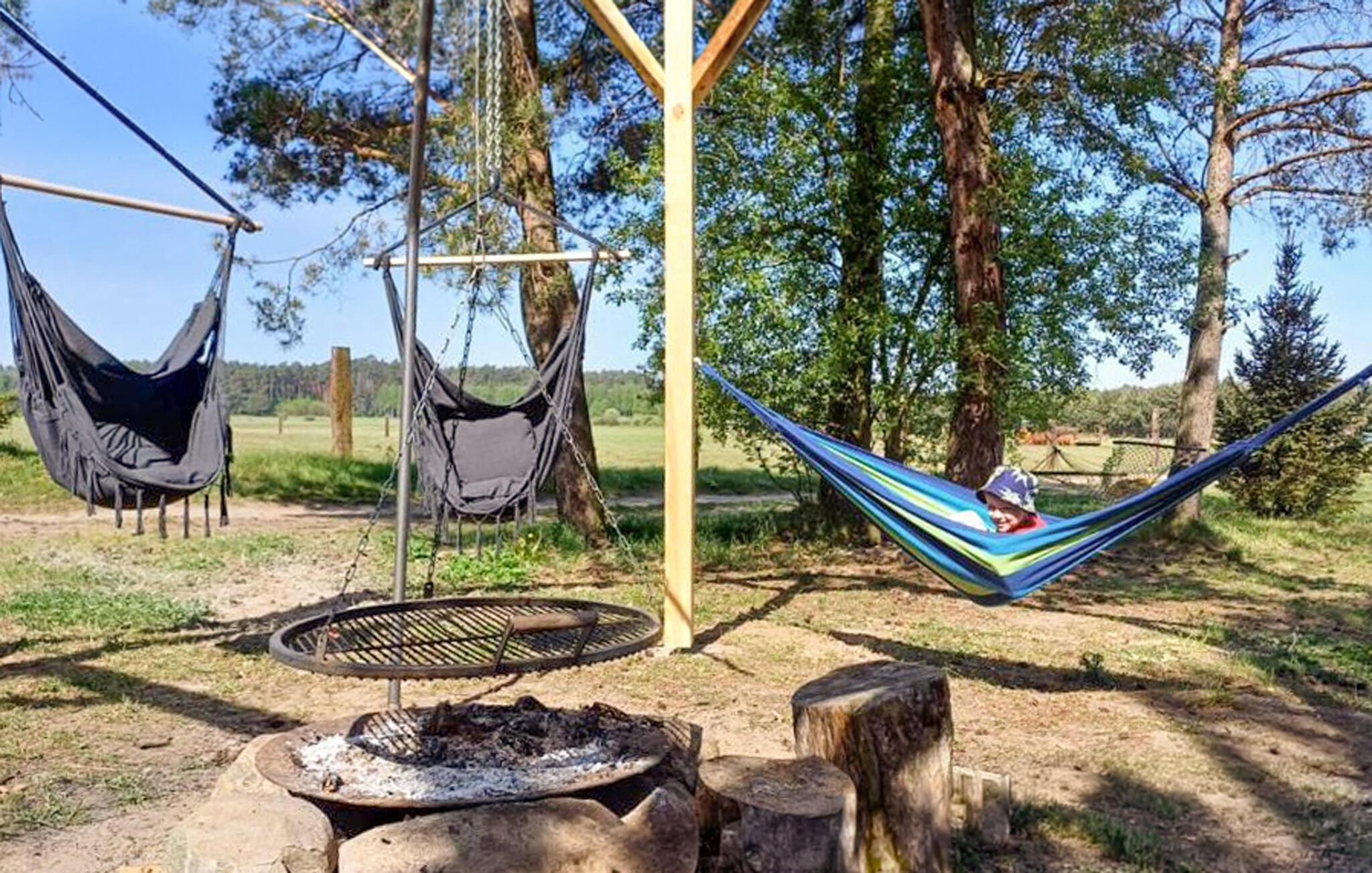 Das liebevoll gestaltete Grundstück grenzt direkt an offene Felder. Starten Sie den Tag mit einem Kaffee auf der Terrasse und genießen Sie die Ruhe und die frische Luft. Am Abend entspannen Sie in einer der Hängematten zwischen den Bäumen oder verbringen gemütliche Stunden am Lagerfeuer.