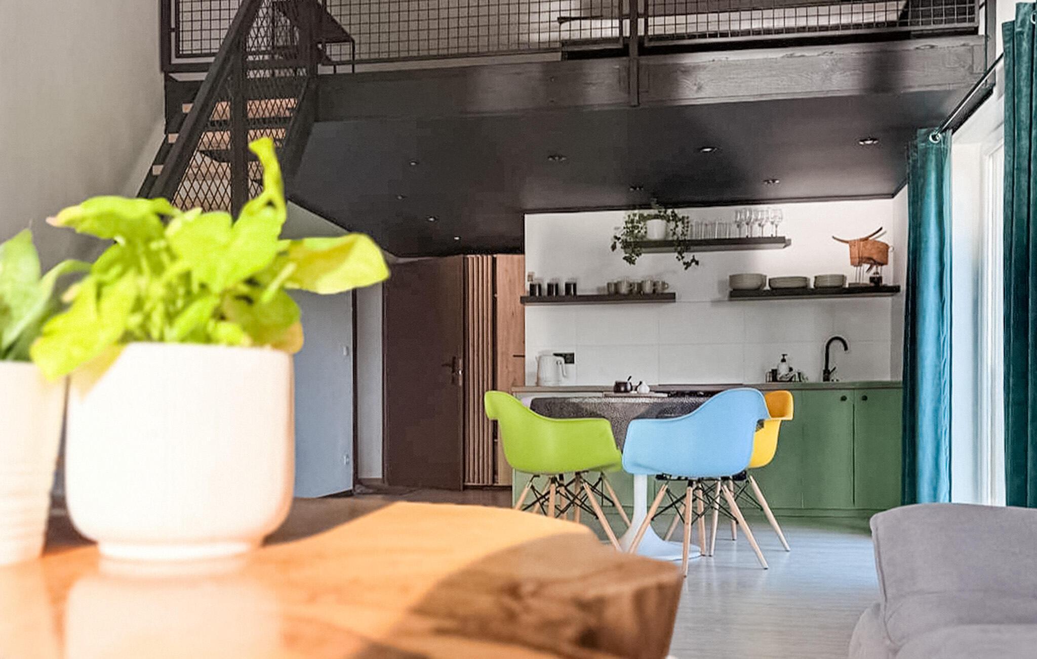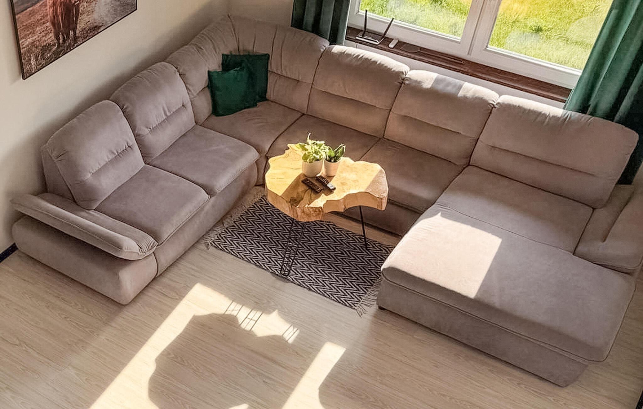 Genießen Sie erholsame Tage in Ihrer komfortablen Ferienwohnung mit wunderschönem, freiem Blick über die weiten Felder. Der ideale Ort, um zur Ruhe zu kommen und neue Energie zu tanken. Der helle, offen gestaltete Wohnbereich begeistert mit großen Fenstern, die viel Tageslicht hereinlassen und einen herrlichen Blick auf die umliegenden Wiesen bieten. Das gemütliche Ecksofa lädt nach einem aktiven Tag zum Entspannen ein. In der modernen, voll integrierten Küche können Sie Ihre Lieblingsgerichte ganz bequem zubereiten. Der Esstisch ist ideal für gemeinsame Mahlzeiten und gesellige Abende. Eine offene Galerie sowie hohe Decken unterstreichen das großzügige Raumgefühl.