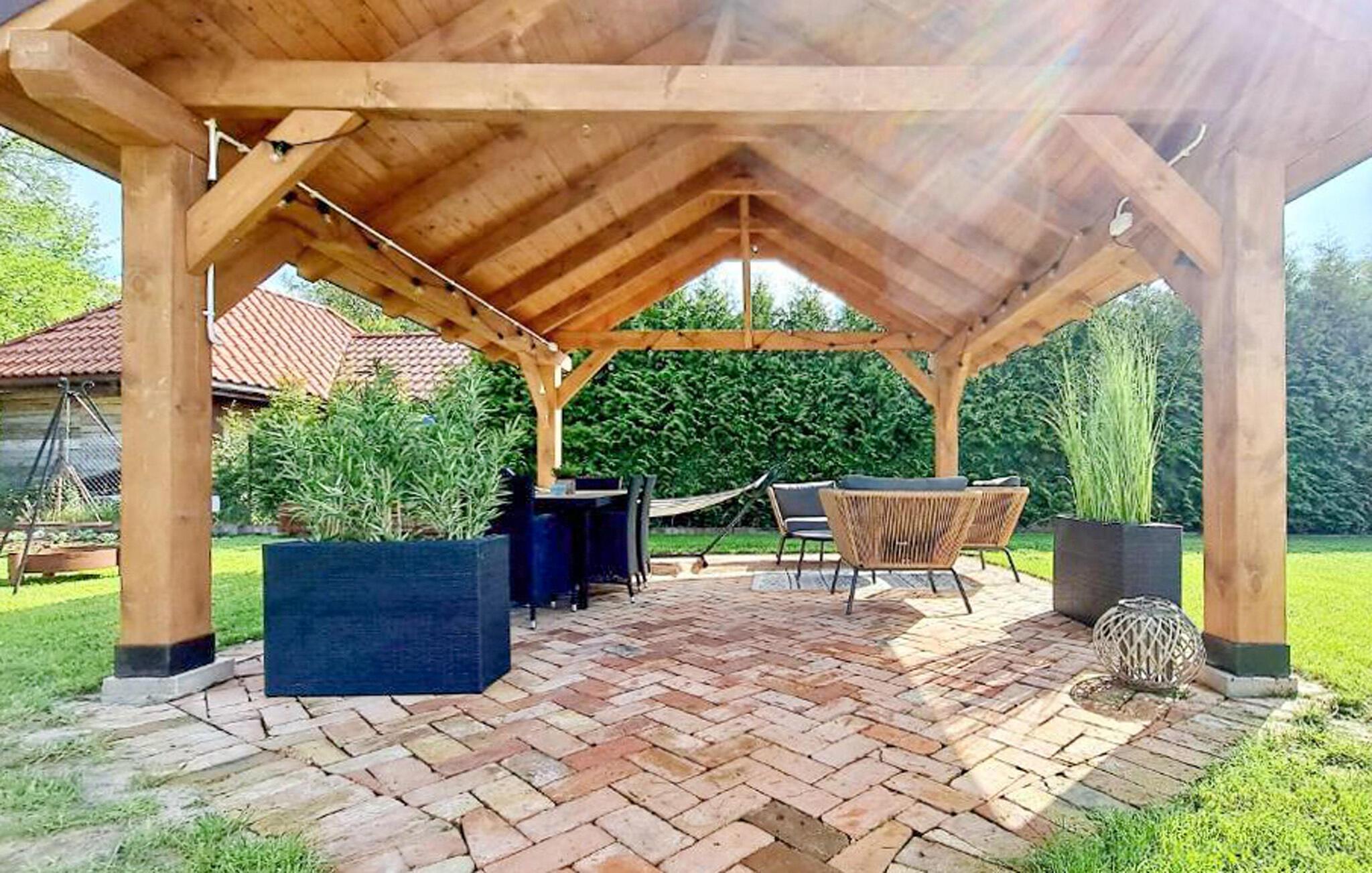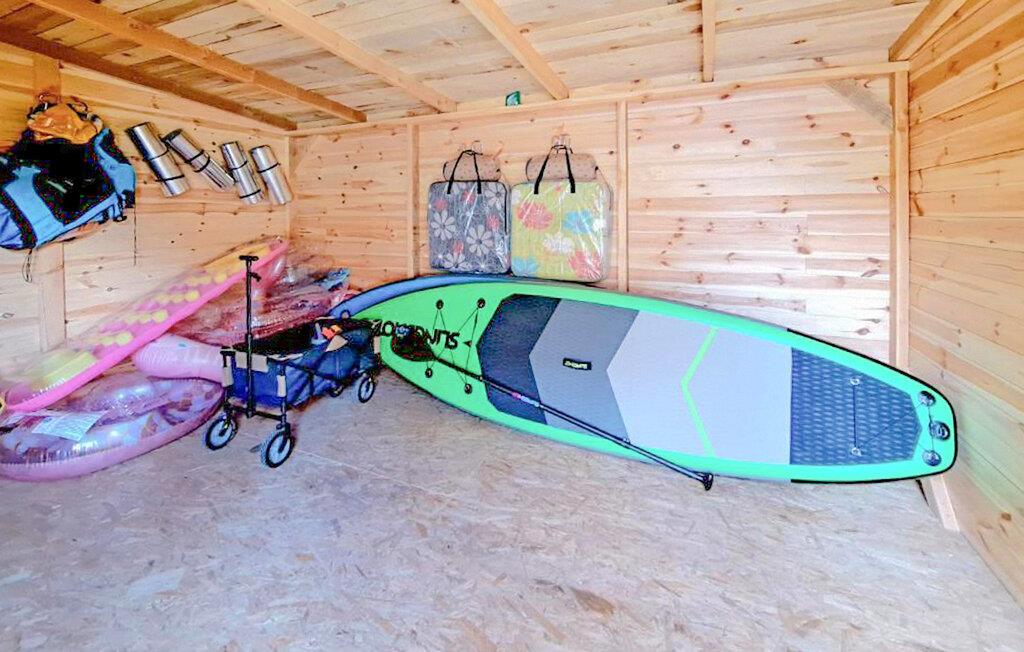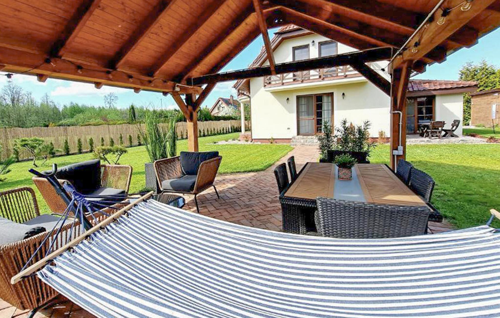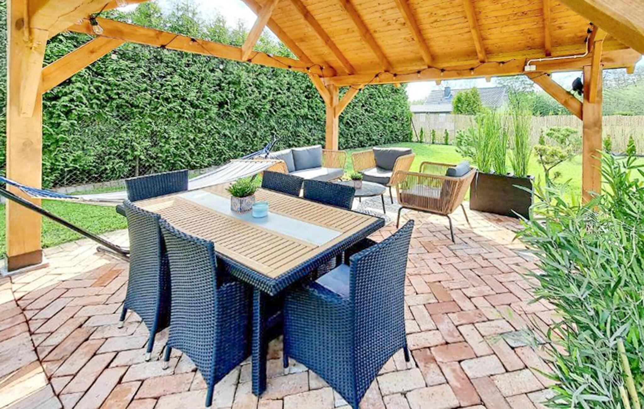 Im idyllischen Garten können Sie auf der überdachten Terrasse entspannen, ein Buch in der Hängematte genießen oder direkt auf Ihrem kleinen Privatstrand im Garten die Sonne auf der Haut spüren.
