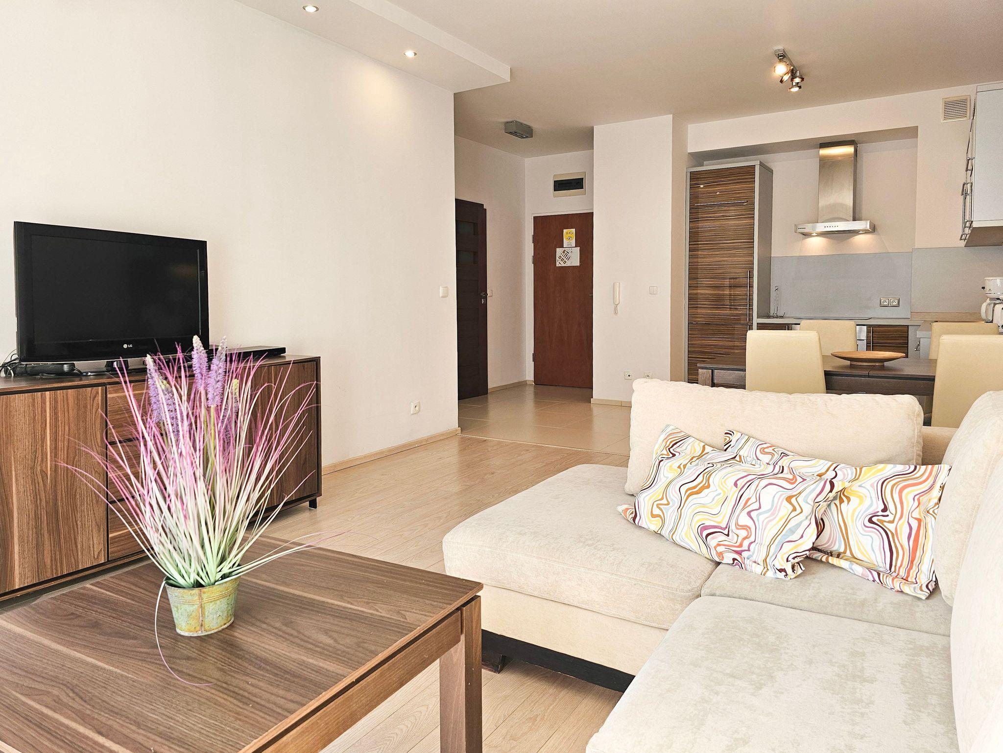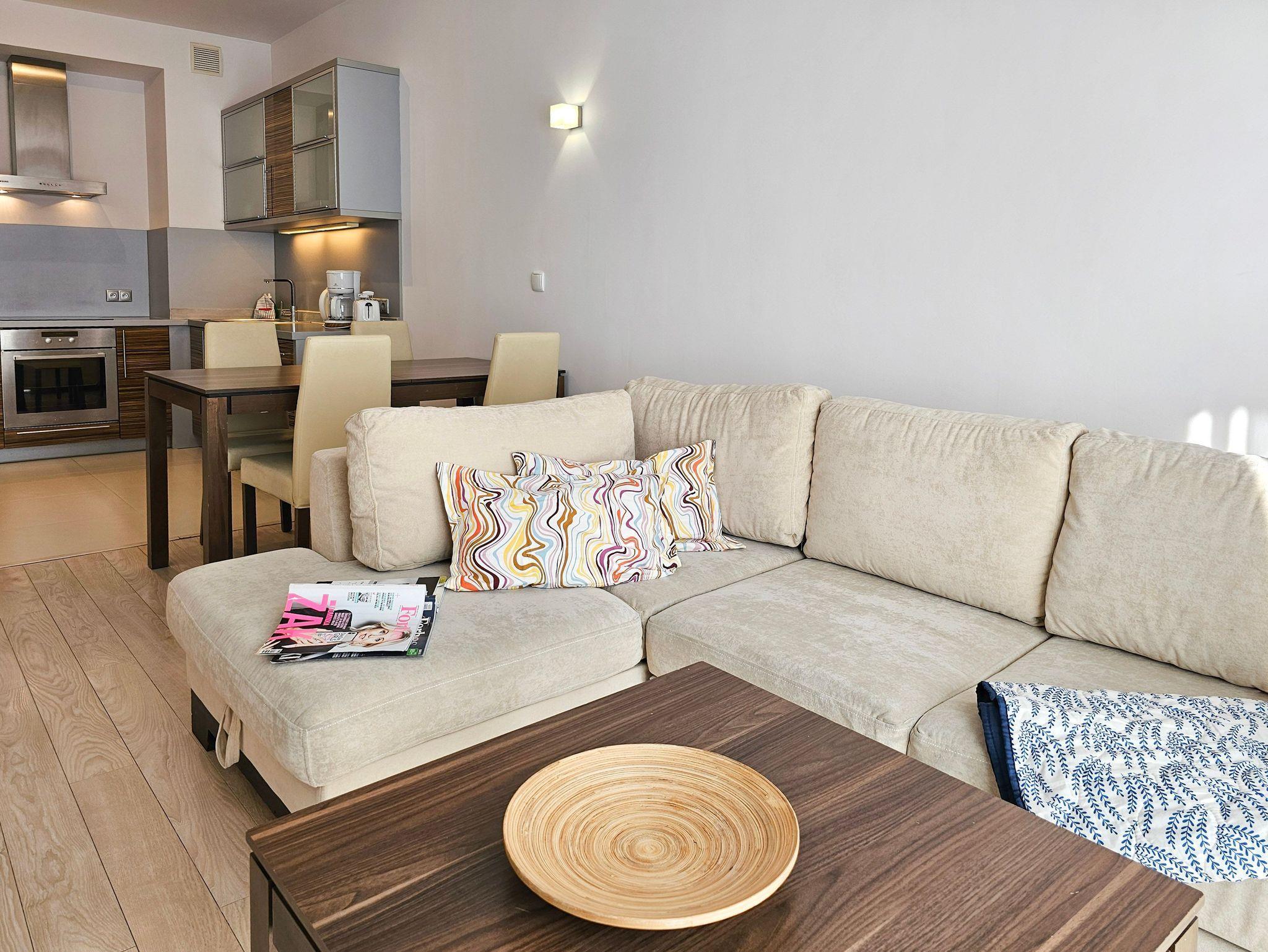 Das Wohnzimmer verfügt über ein Ecksofa mit Schlaffunktion (Schlafbereich 130x195cm), ein Couchtisch, eine Kommode mit einem 32“ LCD-TV mit Kabelanschluss (deutschsprachige Sender je nach Verfügbarkeit), ein Esstisch mit vier Stühlen.