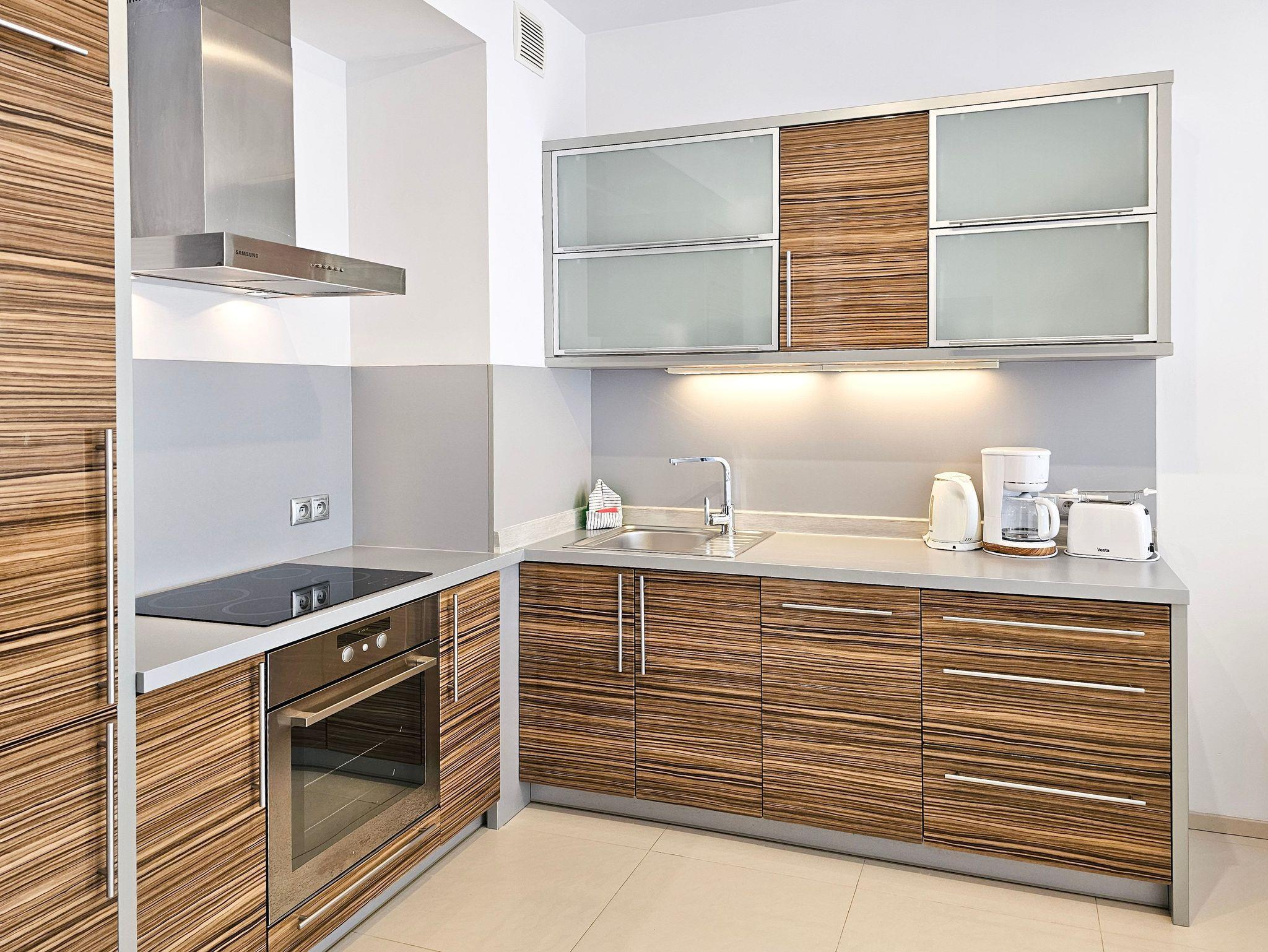 Die funktionelle, voll ausgestattete Küchenzeile verfügt über einen Kühlschrank mit Gefrierfach, Herd mit Ceranfeld, Backofen, Geschirrspüler, Wasserkocher, Toaster, Kaffeemaschine, Töpfe, Geschirr und Besteck.