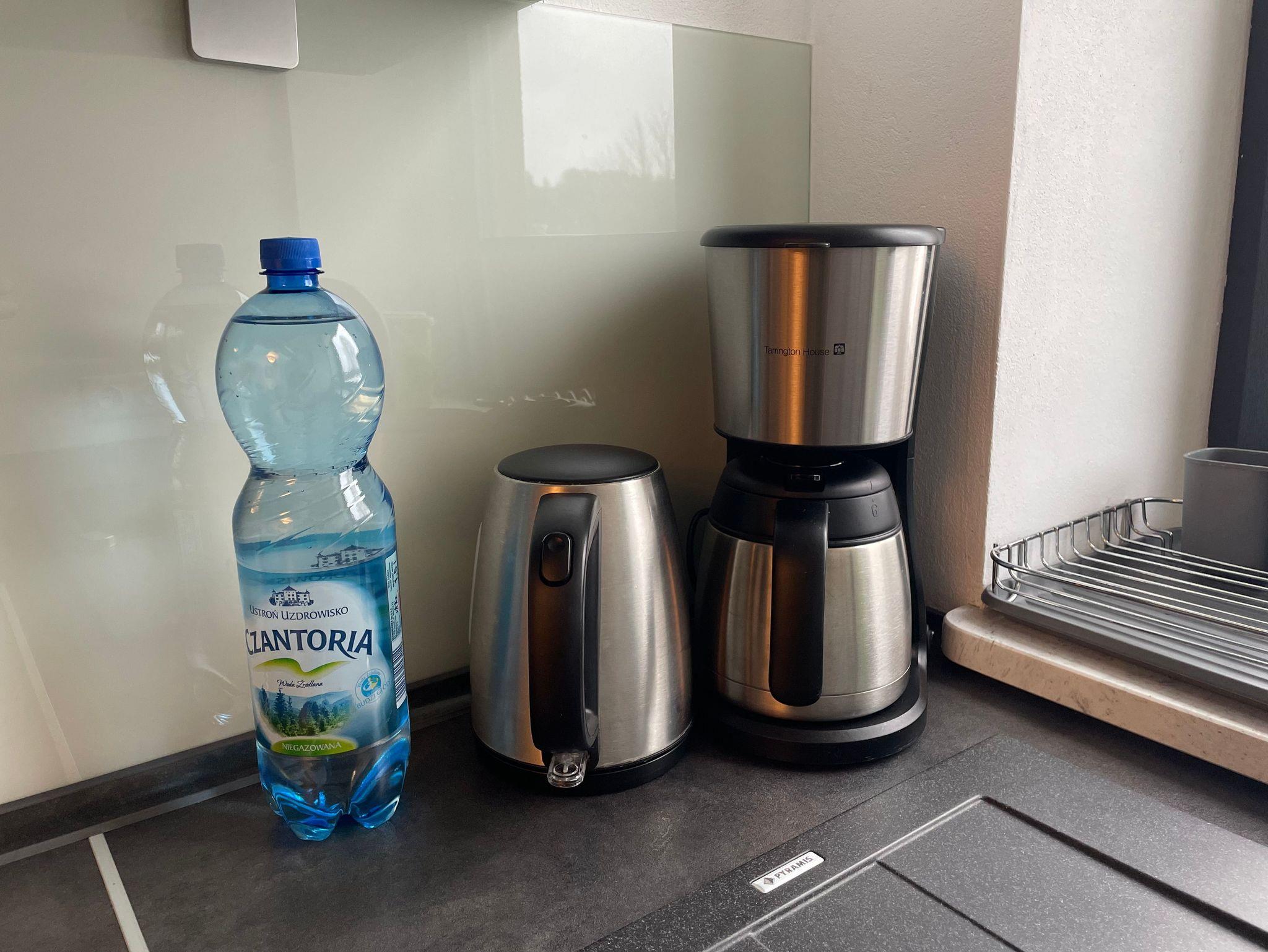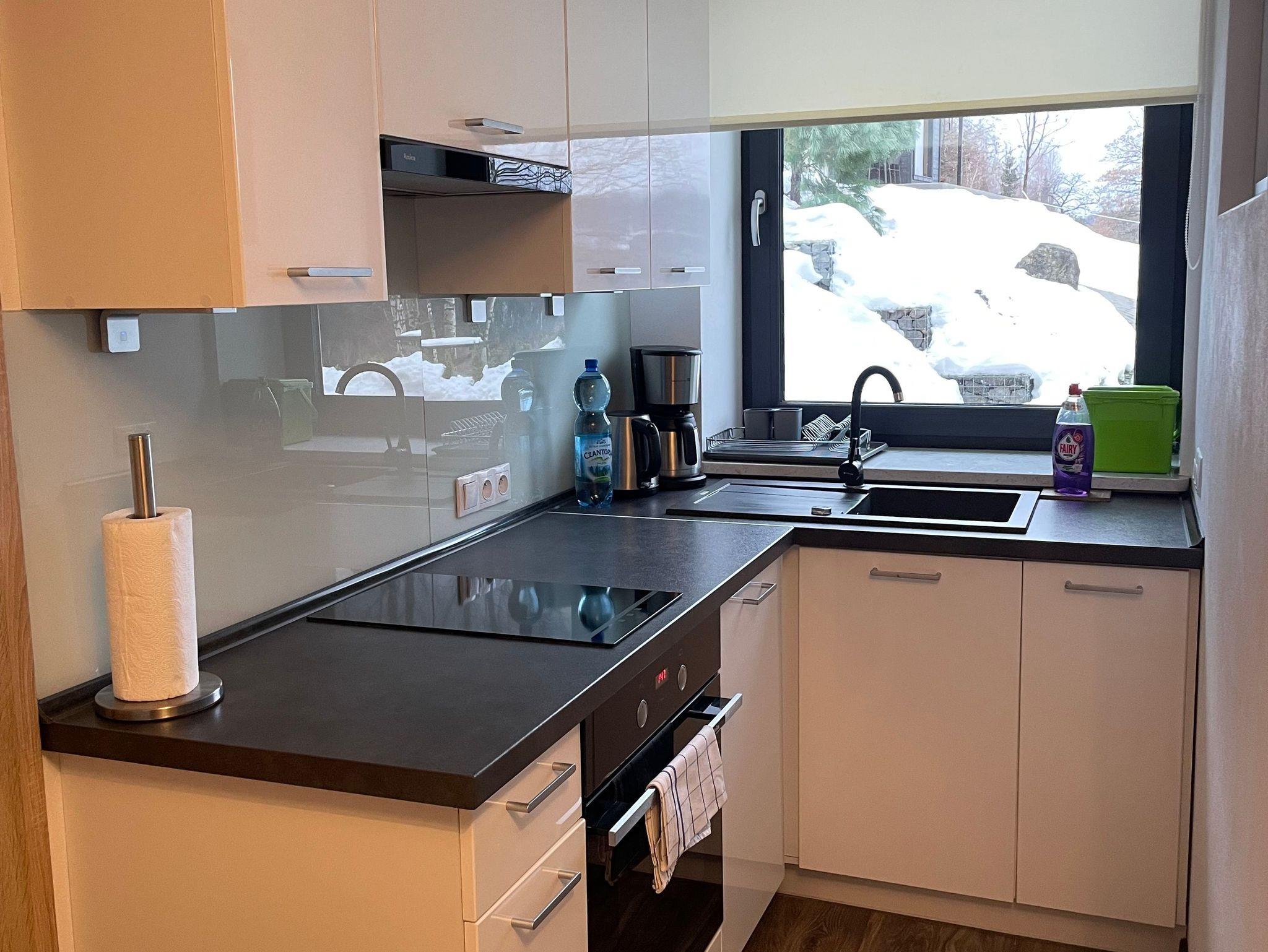 Küche voll ausgestattet mit Spülmaschine, Induktions-Kochplatten, Herd, Kühlschrank und Kaffeemaschine. Ausstattung: Geschirr, Besteck, Töpfe, Kaffe, Tee, Salz, Zucker, Pfeffer, Öl, Essig, Wasserflasche
