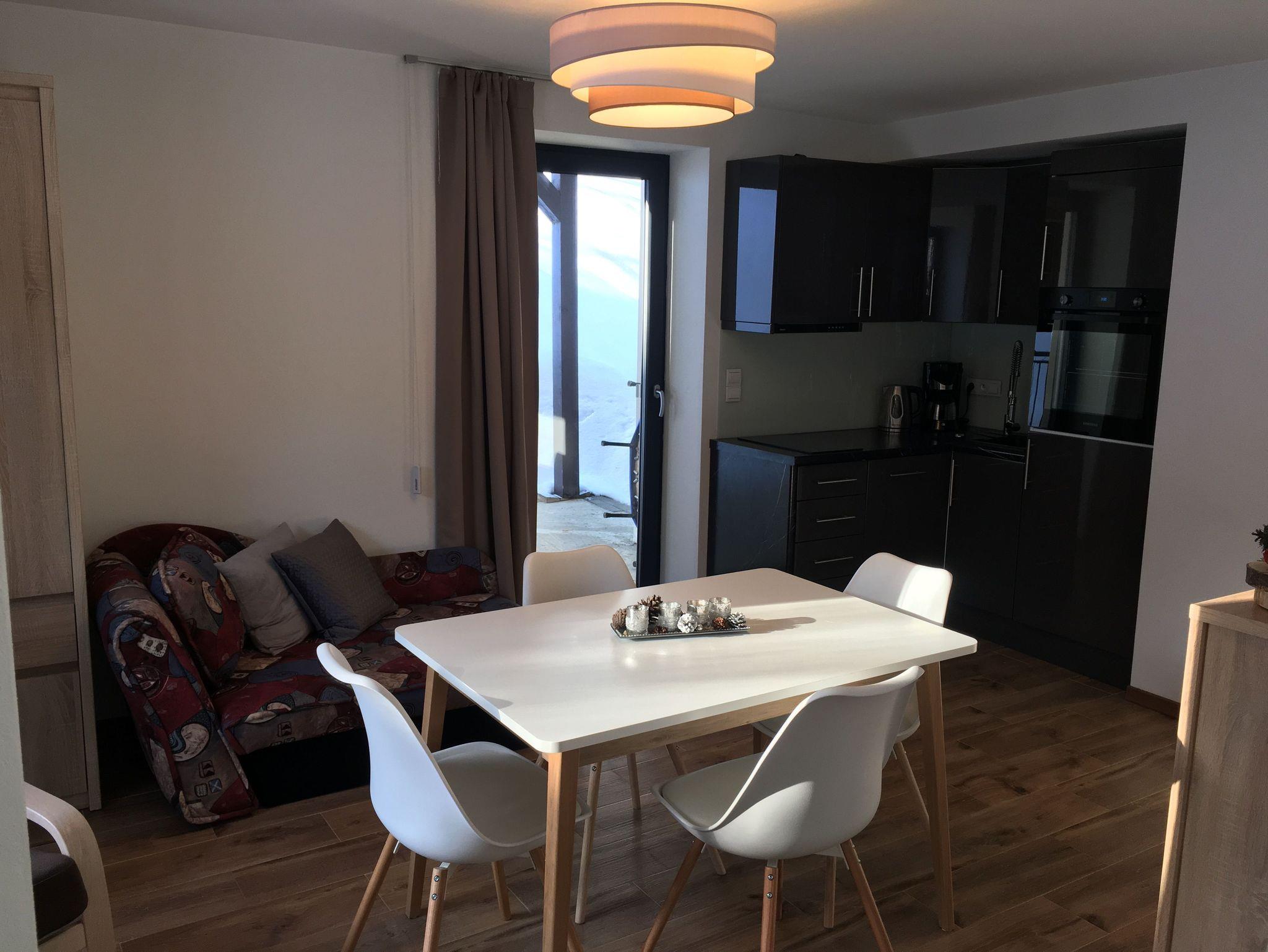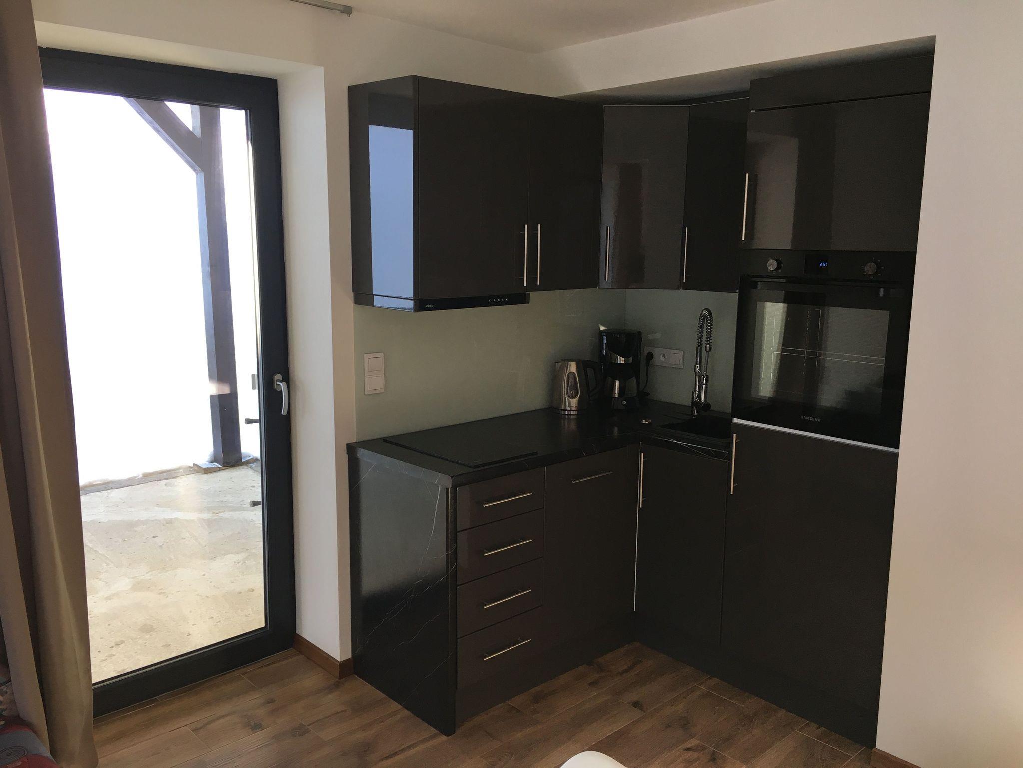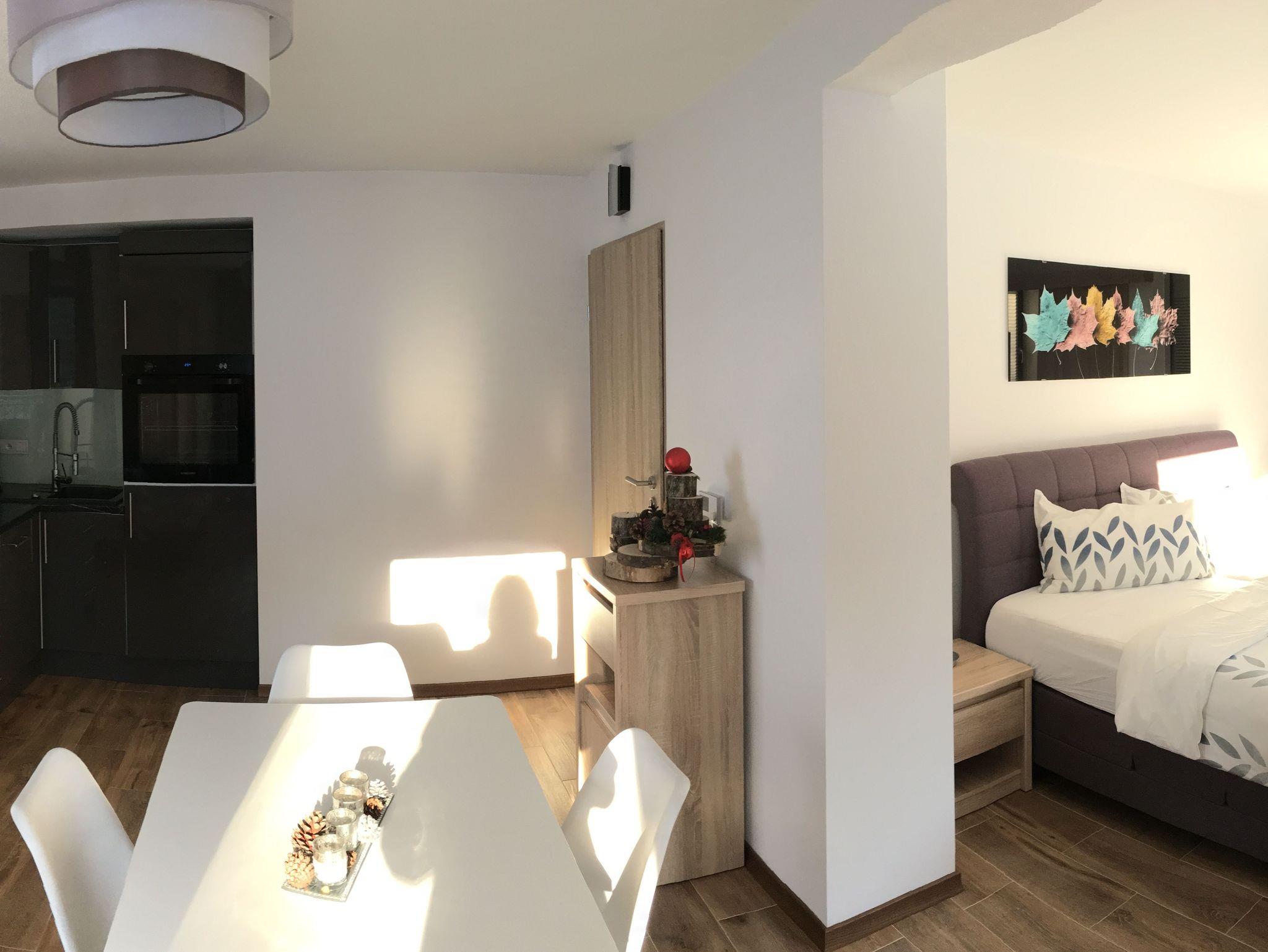 Apartment mit 40 m², Wohn- und Schlafzimmer mit eigener Küche und extra Badezimmer. Gartenblick und Bergblick.