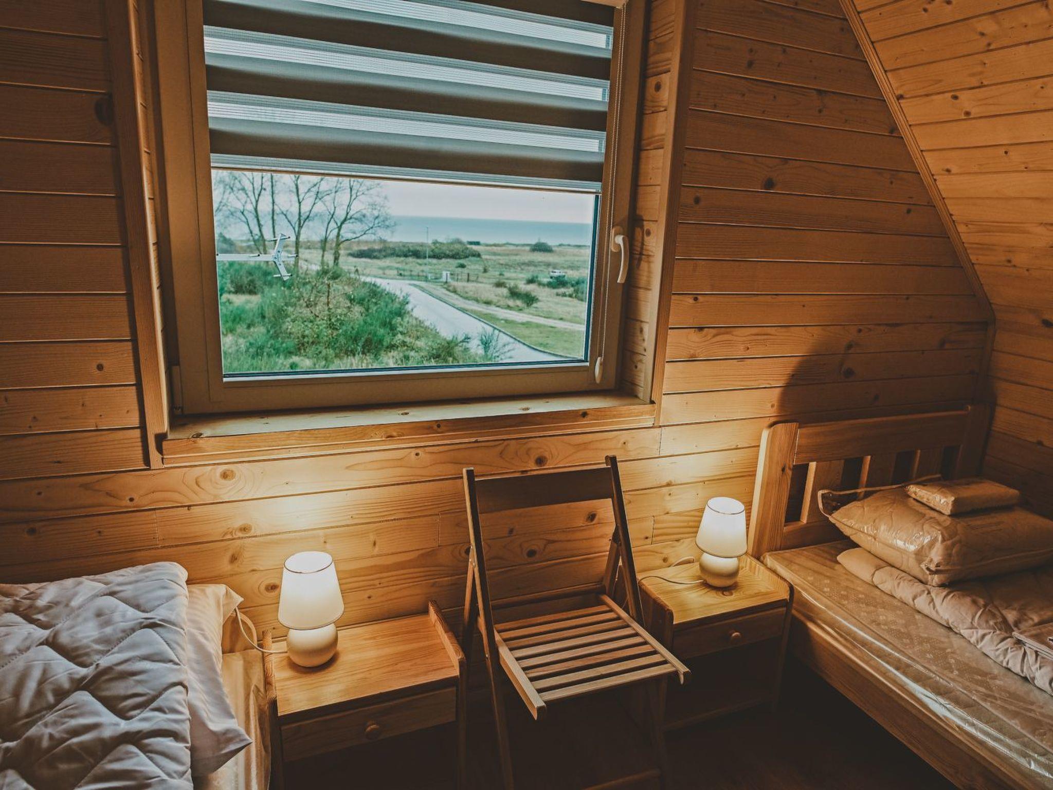 Each cottage has 1 floor with 2 bedrooms: one with 2 single beds, the other with 1 double bed and 1 single bed, bedside tables with lamps.In the living room there is a double sofa bed, armchairs, a coffee table, a wardrobe, a TV set, air-conditioning with heating option, a kitchen equipped with a ceramic hob, a fridge, a dishwasher, a microwave, an electric jug and full crockery, pots and pans, cutlery and of course a table and chairs. The bathroom is equipped with a shower, washbasin, WC, electric boiler and hairdryer, as well as free internet access. Each cottage has max. 6 beds.