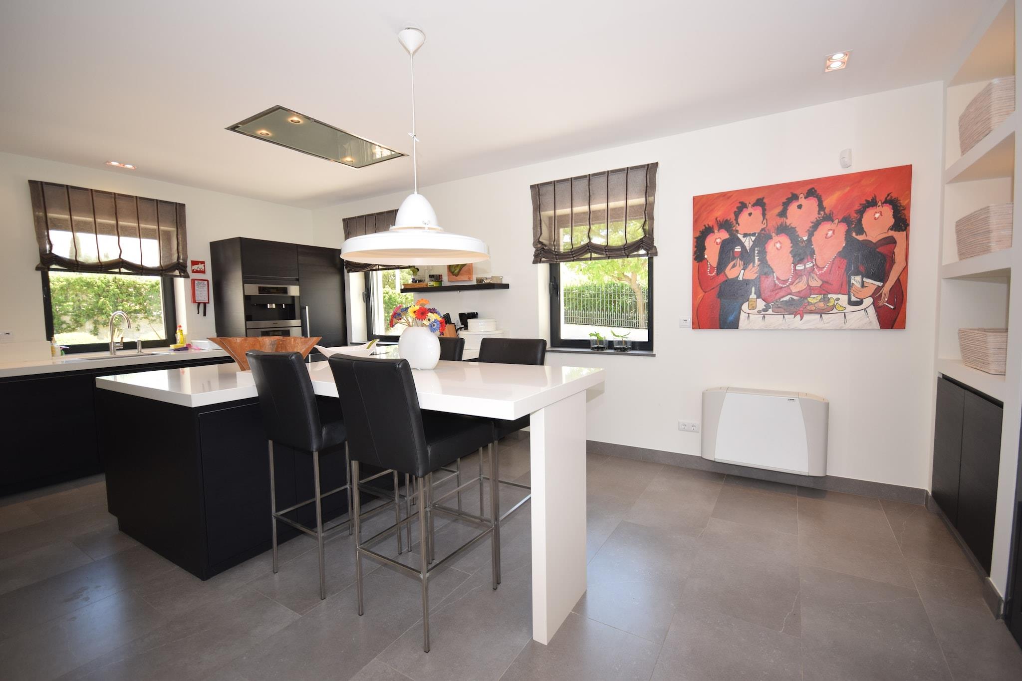 Ground floor: (hallway(toilet), Living room(TV(flatscreen, dutch television channels, international television channels), decorative fireplace, seating area, DVD player, air conditioning), dining room(dining table(6 persons), air conditioning), open kitchen(electric kettle, toaster, cooker(5 ring stoves, ceramic), coffee machine, combination microwave, dishwasher, fridge-freezer, air conditioning, Juicer, Blender), Bedroom with bathroom(double bed(180 x 200 cm), bath tub, shower, 2x washbasin, air conditioning, terrace), toilet(reachable from the outside), washing room(tumble dryer, washing machine), shared room(dining table(8 persons), fireplace)) On the 1st floor: (Bedroom with bathroom(double bed(180 x 210 cm), shower, washbasin, toilet, balcony, air conditioning), Bedroom with bathroom(double bed(180 x 210 cm), shower, washbasin, toilet, balcony, air conditioning), Bedroom with bathroom(double bed(180 x 210 cm), bathtub with shower, washbasin, toilet, balcony, air conditioning), Landing) bathroom(shower(outside), toilet), terrace(private, roofed, 50 m2), garden(private, fenced, illuminated), garden furniture(8 persons), BBQ(charcoal), parking, deckchairs, parasol, swimming pool(private, heatable, cover, 10 x 5 m.), children's bed, high chair