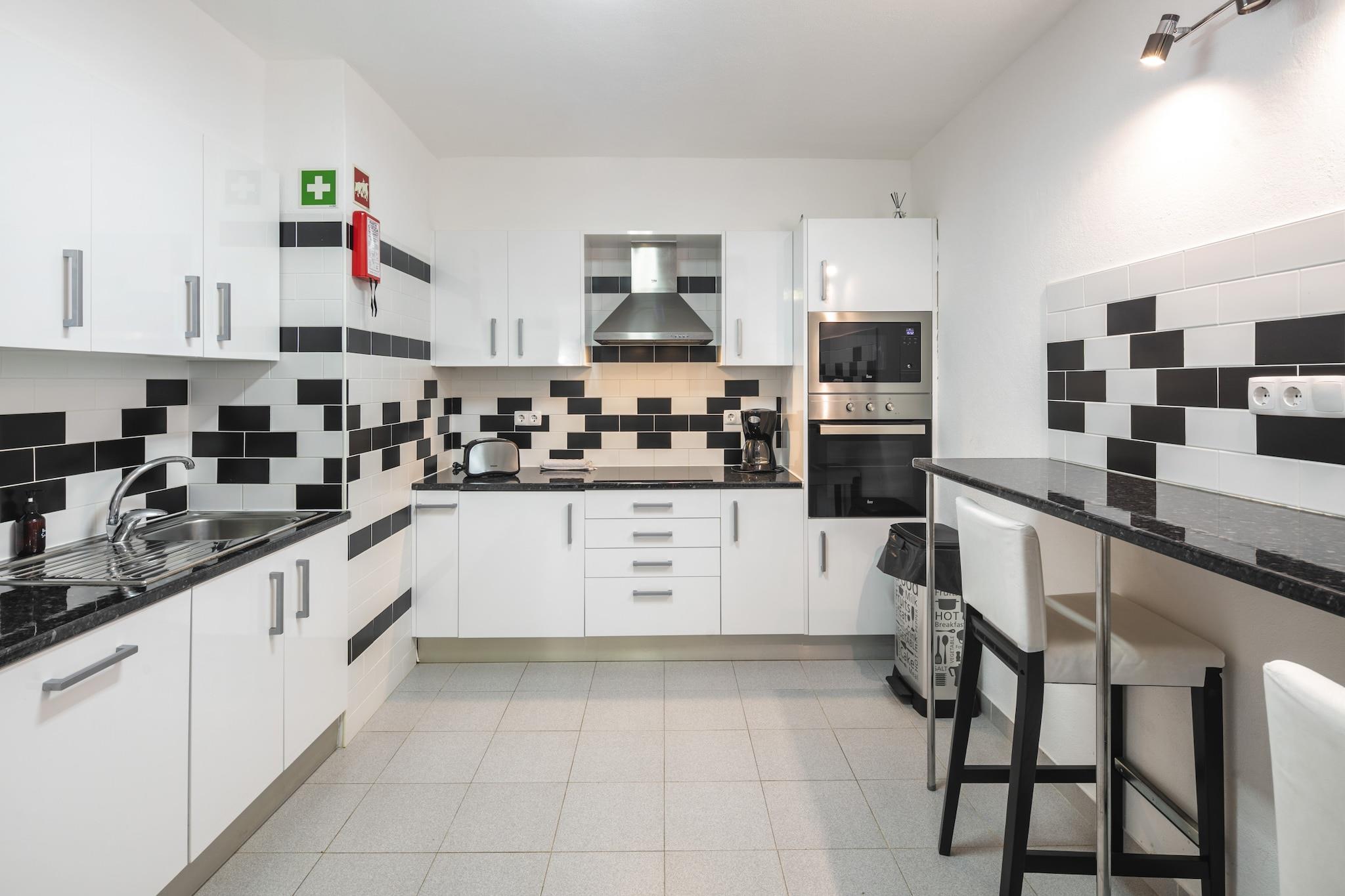 On the 6th floor: (Living room(TV(flatscreen, satellite, smart TV), dining table, seating area, radio), Kitchen(toaster, coffee machine, oven, microwave, dishwasher, fridge-freezer, Juicer, dishes and cutlery, Wine glasses), bedroom(double bed), bedroom(single bed, single bed), bathroom(shower, hairdryer, shampoo), bathroom(bathtub or shower, washbasin, toilet), Internet access) Elevator, Garden Furniture , washing machine, balcony, patio, terrace, parking, ironing board, iron, Essentials