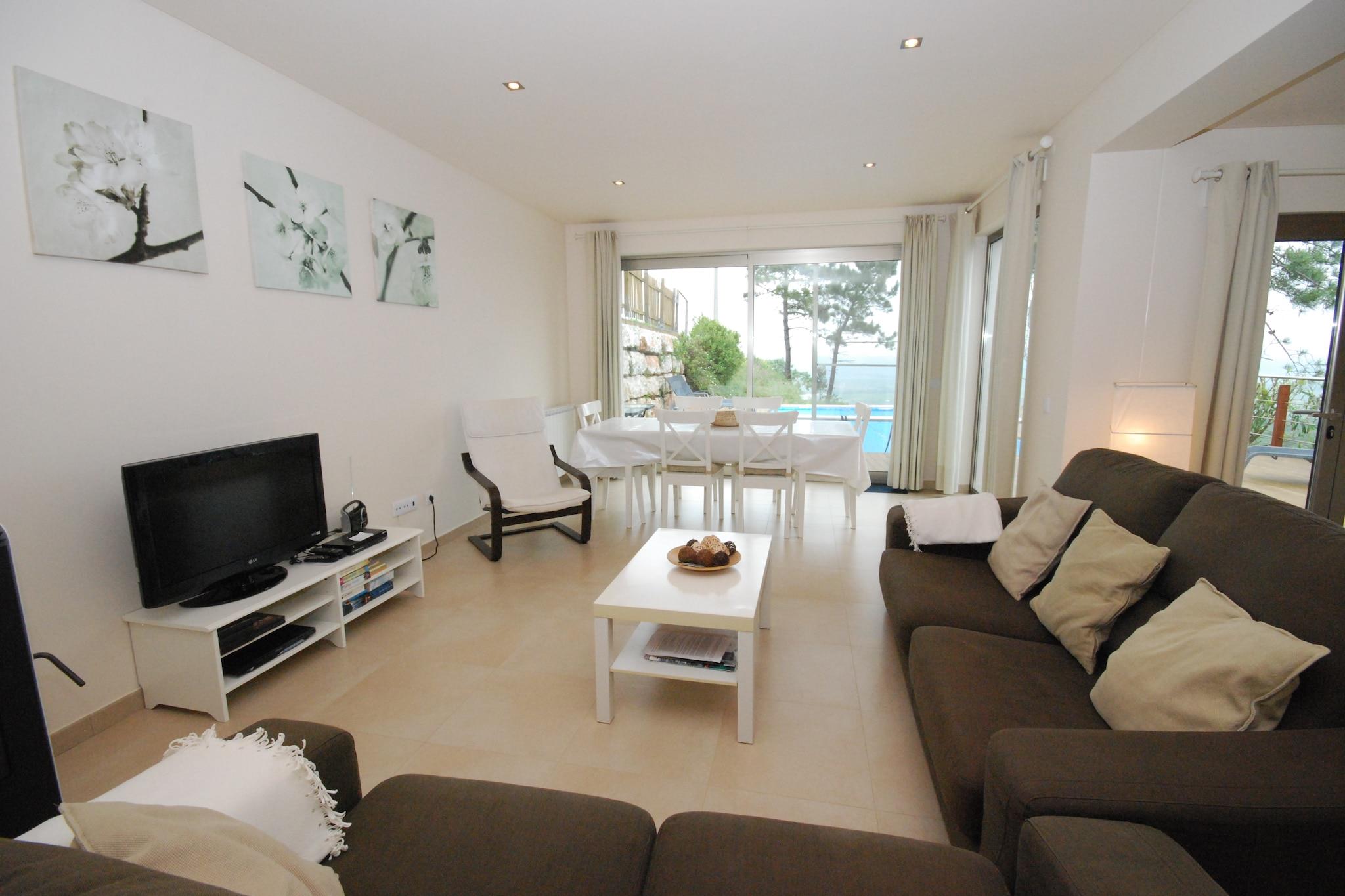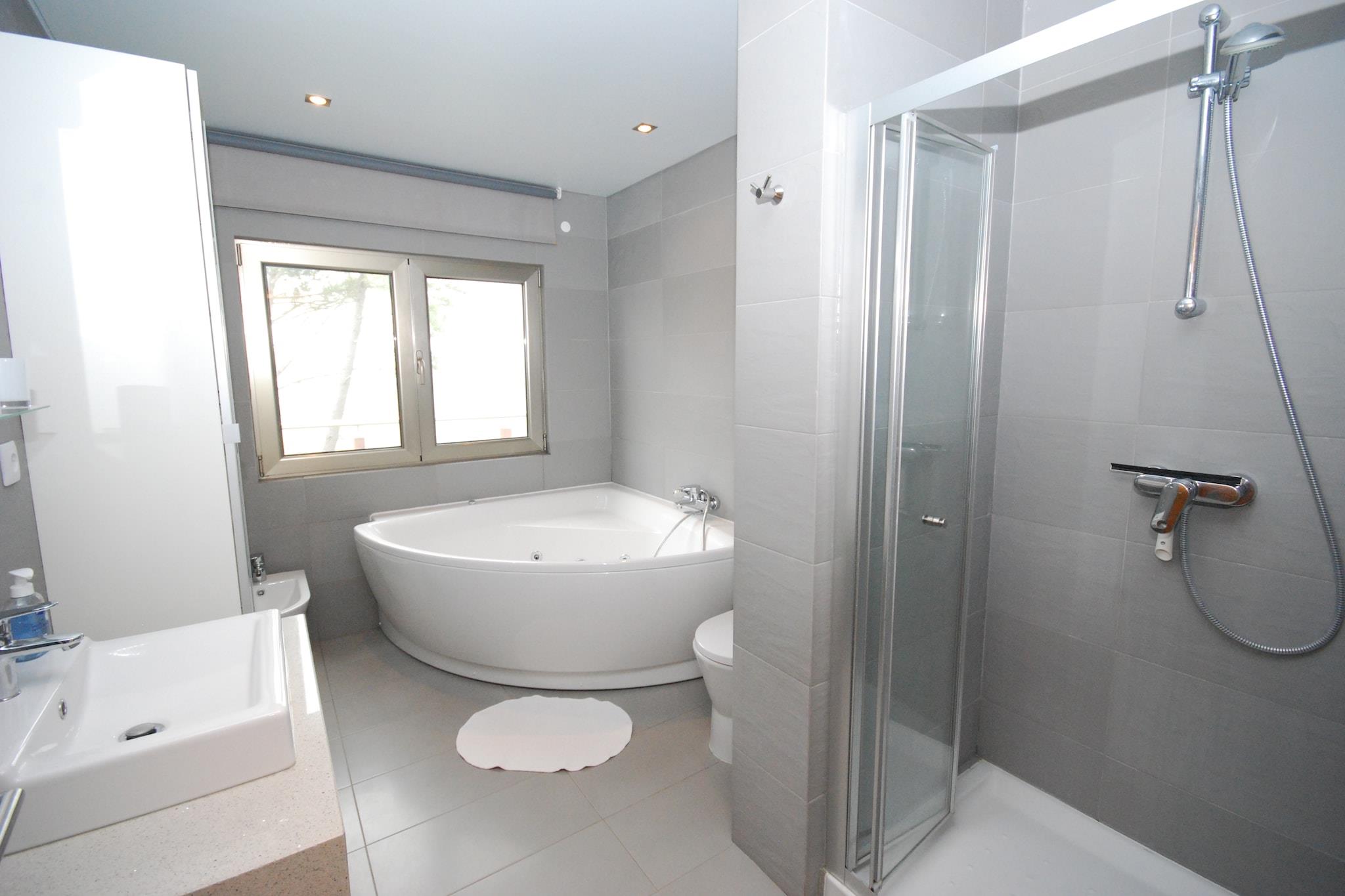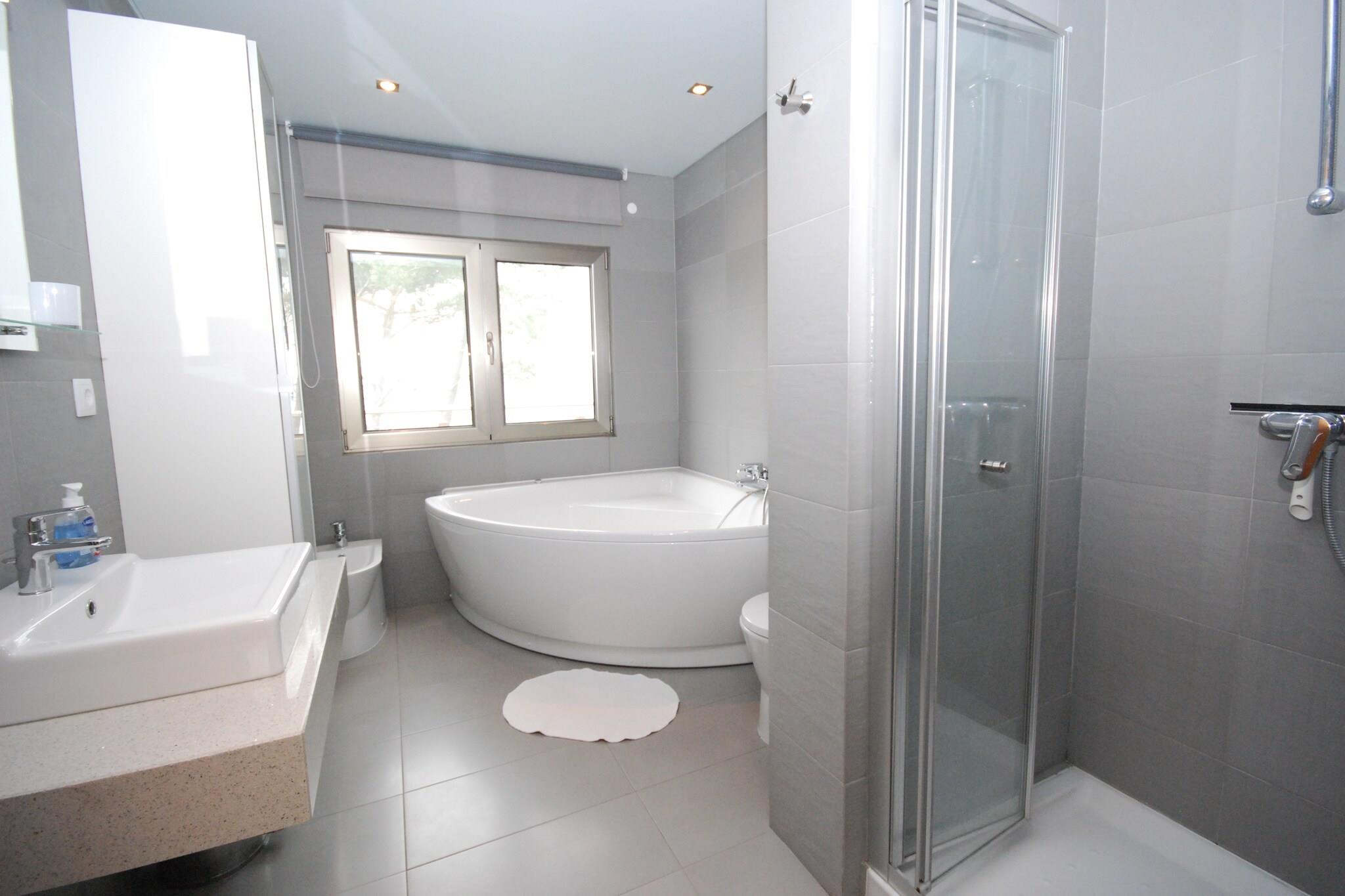 Ground floor: (Kitchen(cooker(ceramic), oven(grill-oven), microwave, dishwasher, fridge-freezer, washing machine), Living/diningroom(TV(satellite), stove(Pellet), DVD player, terrace), bedroom(double bed(160 x 200 cm), terrace), bedroom(double bed(160 x 200 cm), terrace), bathroom(bathtub with shower, washbasin, toilet, bidet)) balcony, heating(central), terrace(private), garden(private), garden furniture, BBQ, parking, swimming pool(private, 8 x 4 m.), children's bed