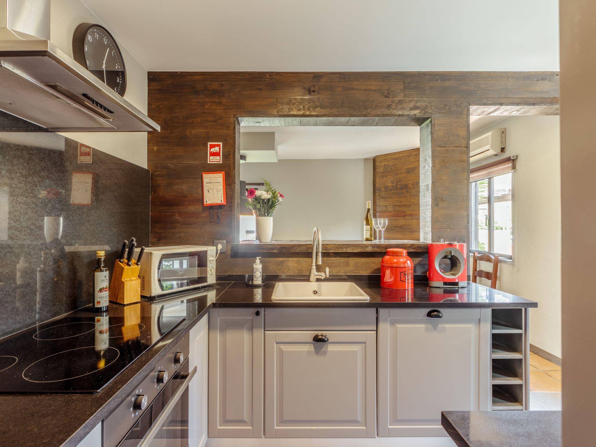 The completely renovated kitchen area is equipped with a 4-ring ceramic hob, oven, microwave, toaster, fridge-freezer and dishwasher. The washing machine is located outside on the terrace.
