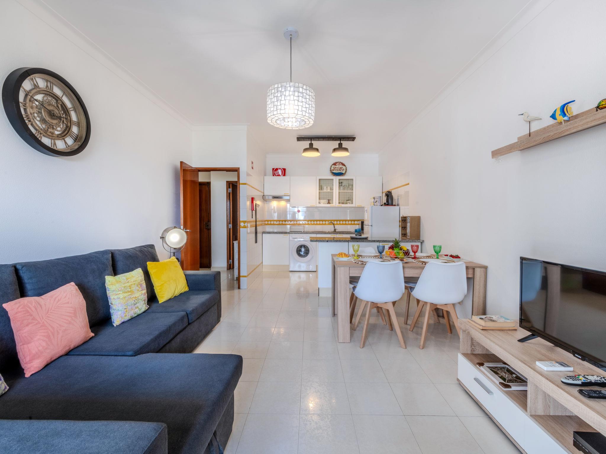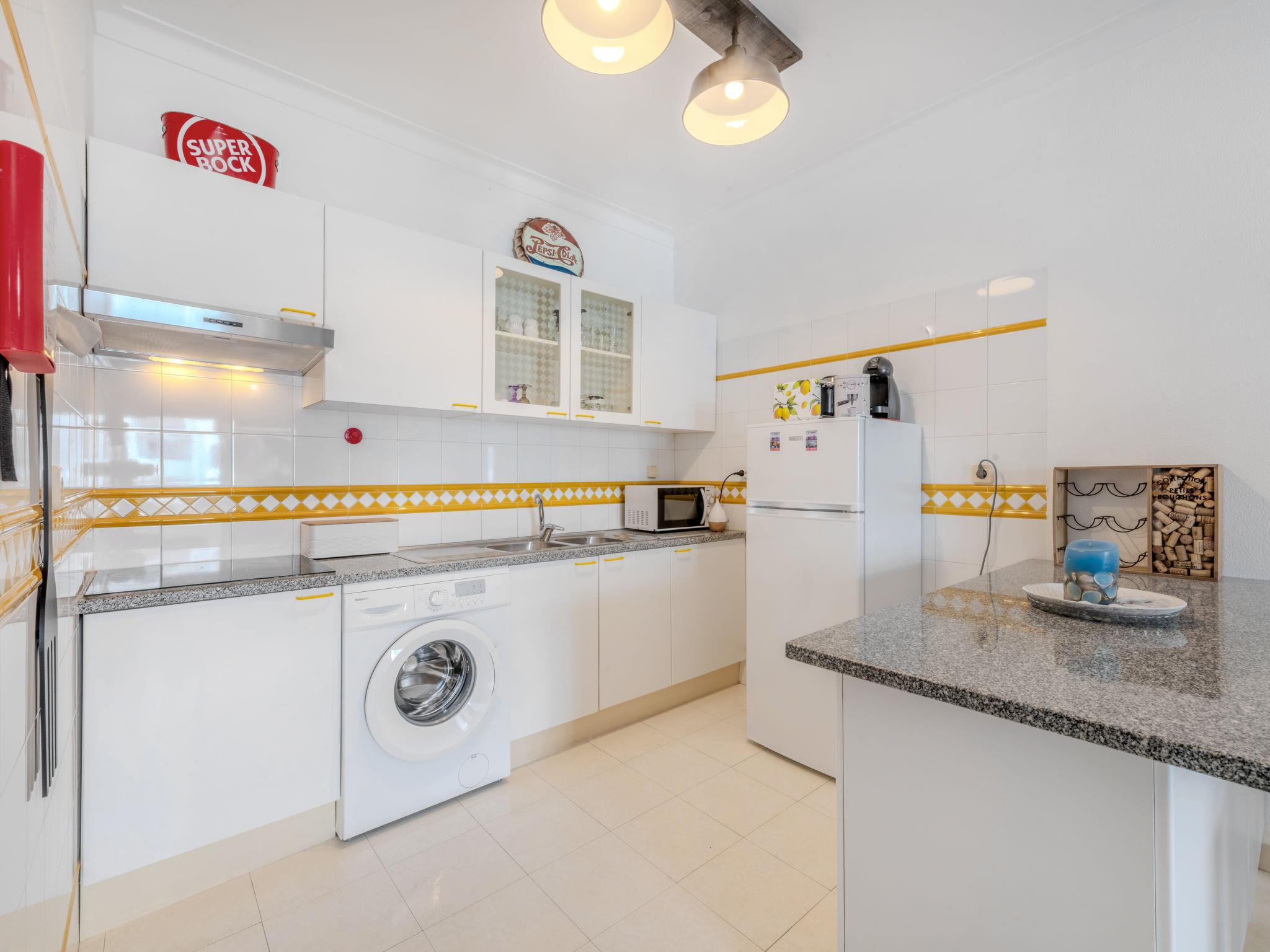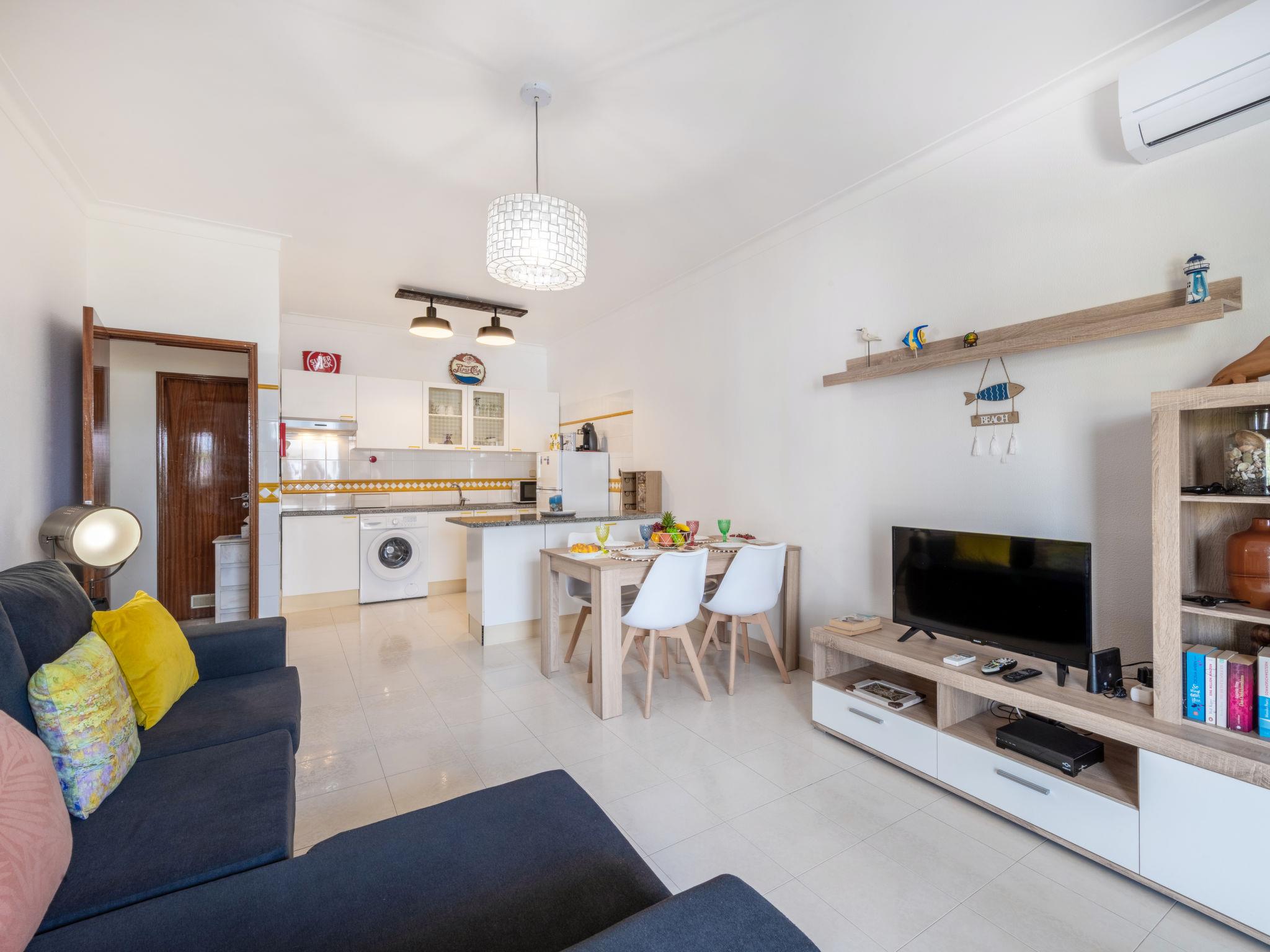 "Algarve Treasure", 2-room apartment 54 m2. Very comfortable and cosy furnishings: living/sleeping room with cable TV, flat screen, air conditioning and forced-air heating. 1 room with 1 bed (160 cm, length 200 cm), air conditioning and forced-air heating. Kitchenette (4 induction hot plates, toaster, microwave, freezer, electric coffee machine, Capsules for coffee machine (Nespresso not incl)) with dining table, 1 sofabed, TV, international TV channels and flat screen. Exit to the terrace. Shower/WC. No heating option. Terrace furniture. Side view of the sea. Facilities: washing machine, iron, children's high chair, baby cot for up to 2 year olds, hair dryer. Internet (WiFi). Please note: suitable for families. Non-smokers only. Fire extinguisher, no lift. 125216/AL