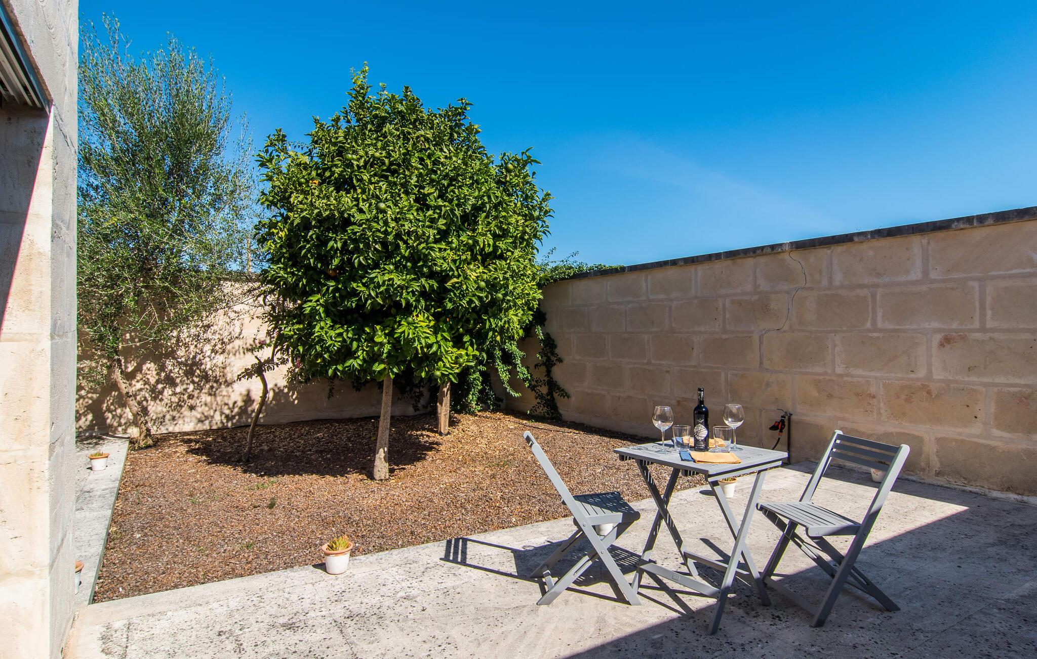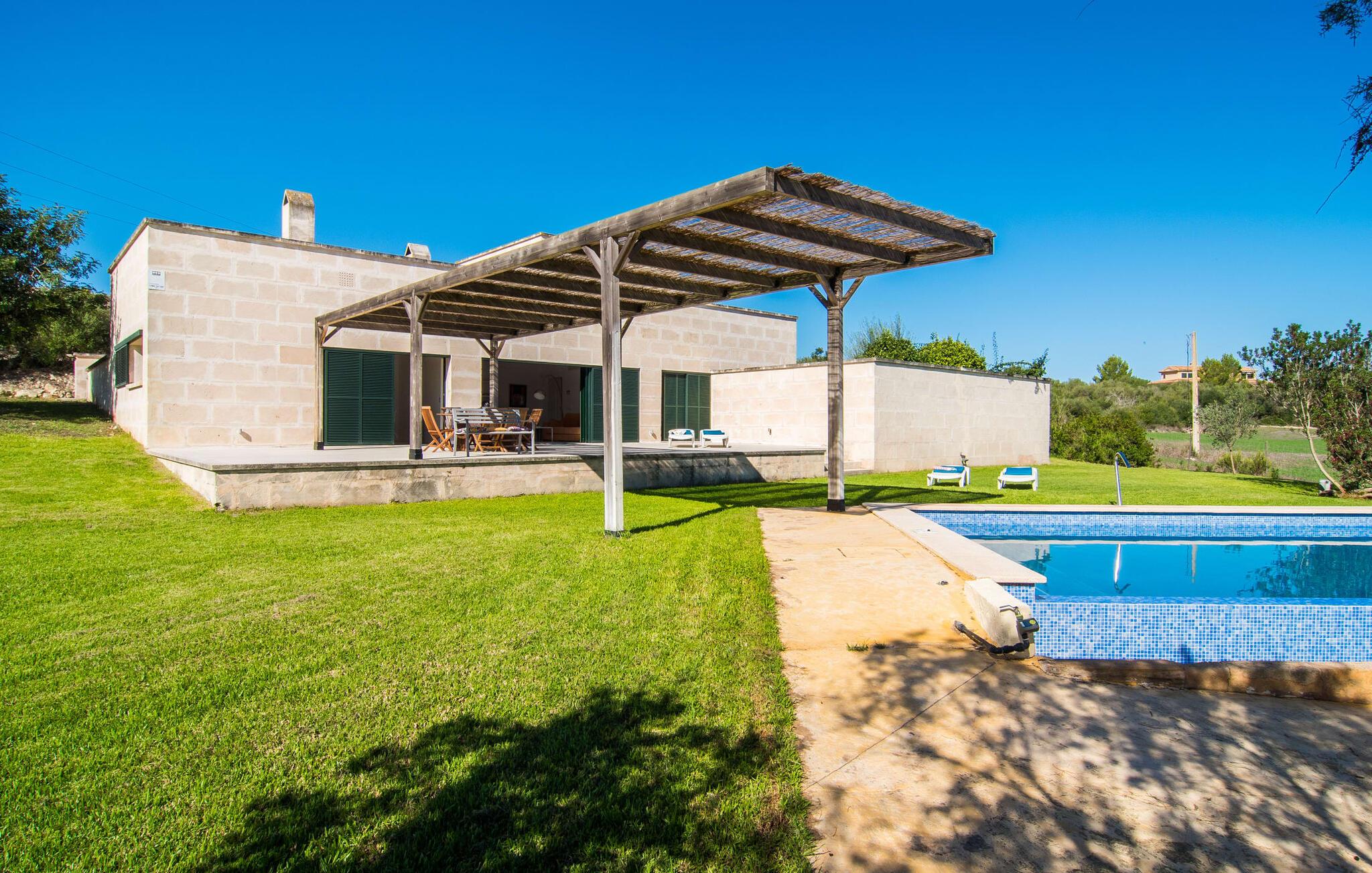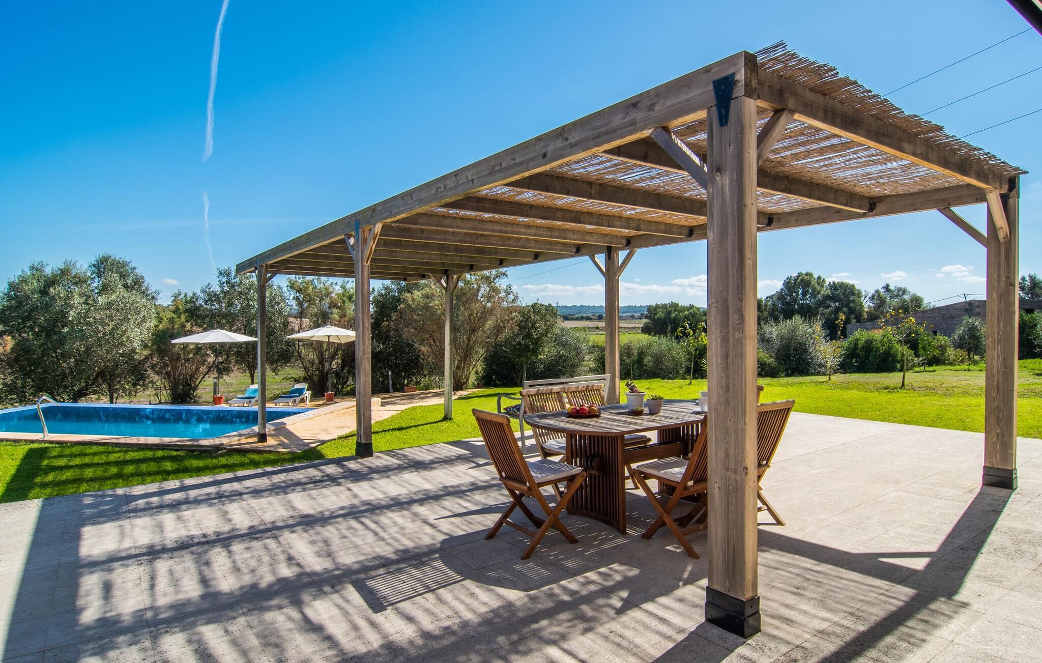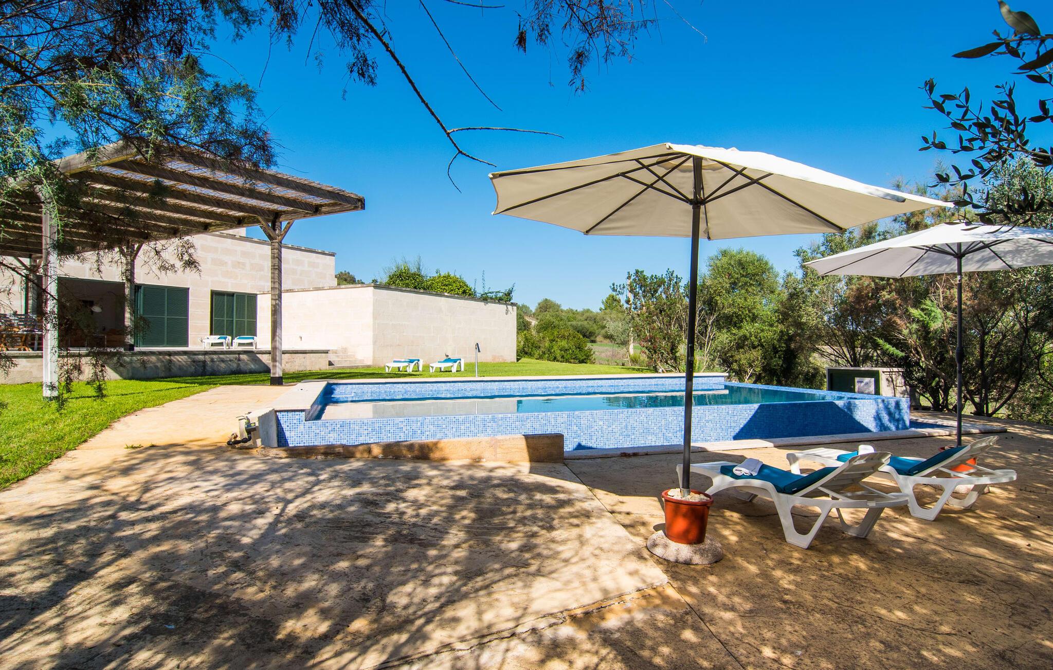 Der Außenbereich ist wunderschön angelegt mit einer überdachten Terrasse am Pool und einer schattigen Terrasse auf der Rückseite. Der mit blauen Mosaikfliesen geschmückte Pool und der abgestufte Einstieg laden zum Entspannen im einzigartigen mediterranen Licht ein. Ein gemauerter Grill lädt zu kulinarischen Entdeckungstouren mit lokalen Marktzutaten ein. In der Nähe des Hauses gibt es schattige Parkplätze.