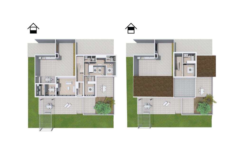 Die moderne Villa "Baix des Pujol“ verfügt über eine attraktive Außenfassade aus freiliegendem Mauerwerk und ist von weitläufigen Rasenflächen umgeben, die eine entspannende Umgebung unter der mediterranen Sonne bieten.