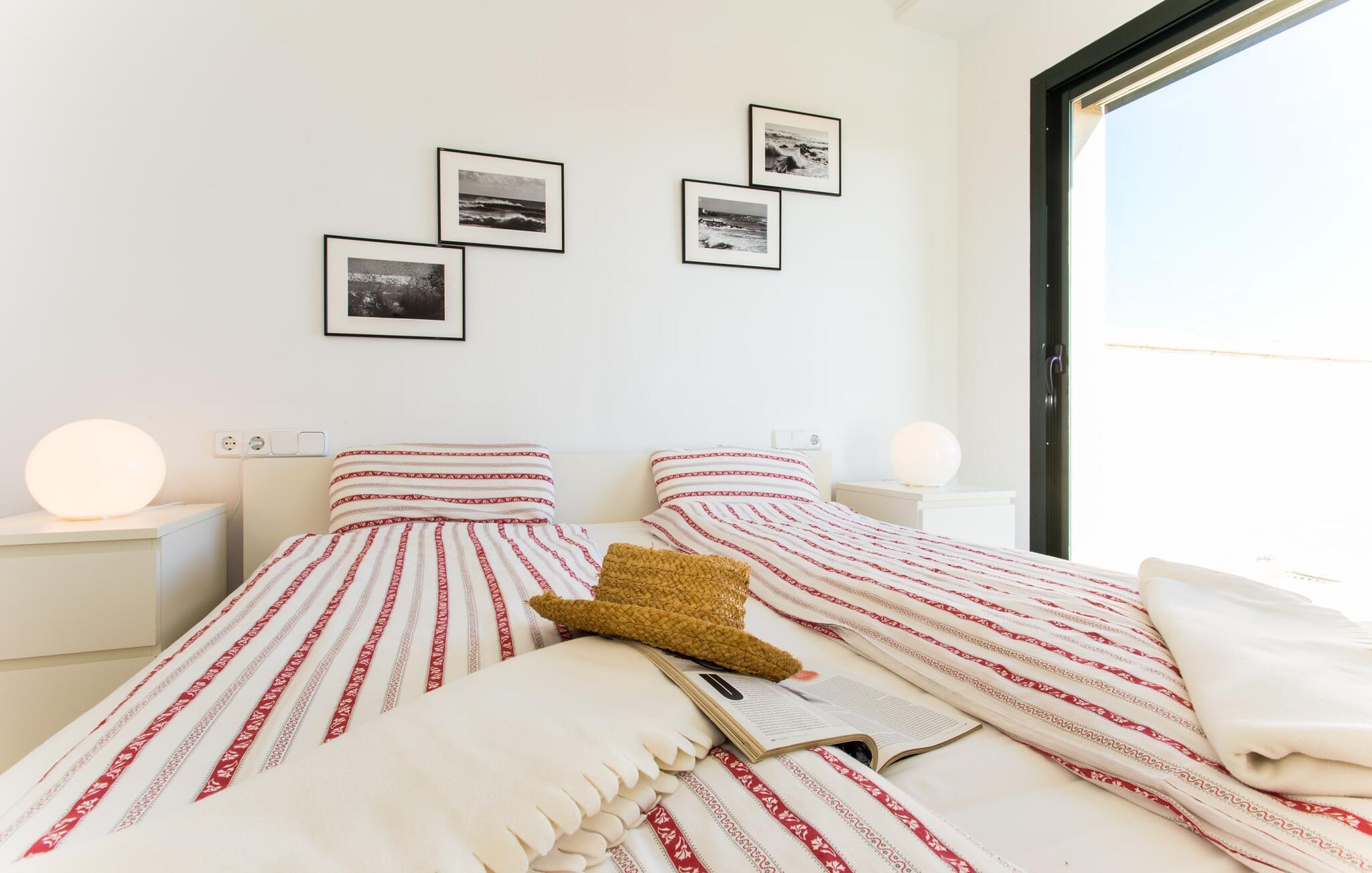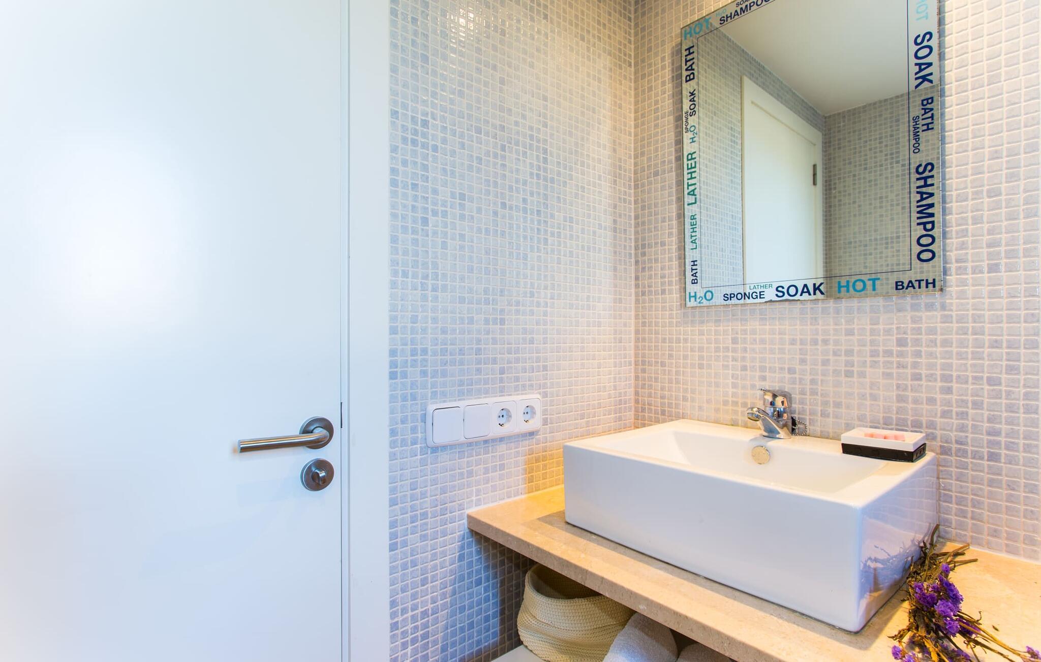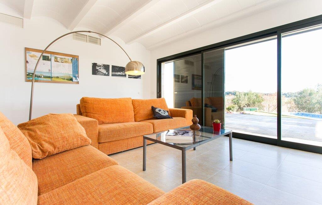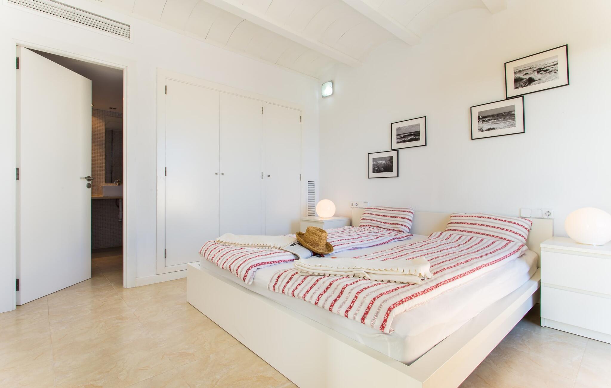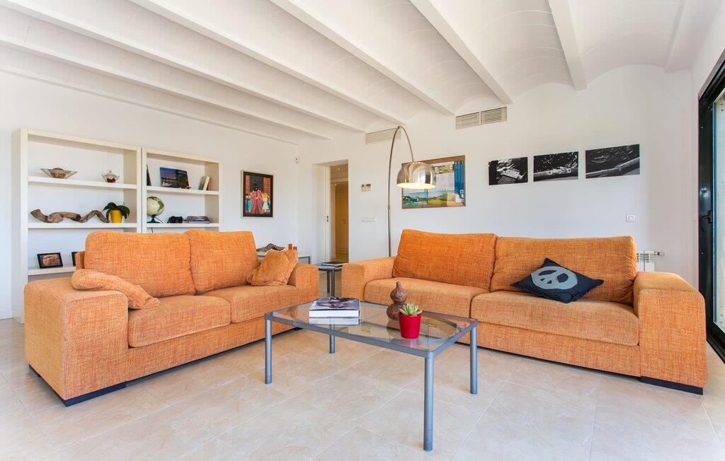 Im Inneren besticht die Villa durch ein minimalistisches Design, das die Wohlfühlatmosphäre unterstreicht. Im Erdgeschoss befindet sich ein geräumiges Wohnzimmer mit Terrassenzugang, zwei gemütlichen Sofas und einem stilvollen Kamin für kühlere Abende. An den Essbereich schließt sich die voll ausgestattete Küche an, in der sechs Erwachsene und zwei Kinder bequem Platz finden. Auf dieser Ebene gibt es drei Schlafzimmer und drei Badezimmer, im Obergeschoss gibt es ein viertes beeindruckendes Schlafzimmer und ein eigenes Badezimmer. Jedes Schlafzimmer ist individuell eingerichtet und die Villa ist mit Klimaanlage und Heizung ausgestattet, um das ganze Jahr über Komfort zu bieten.