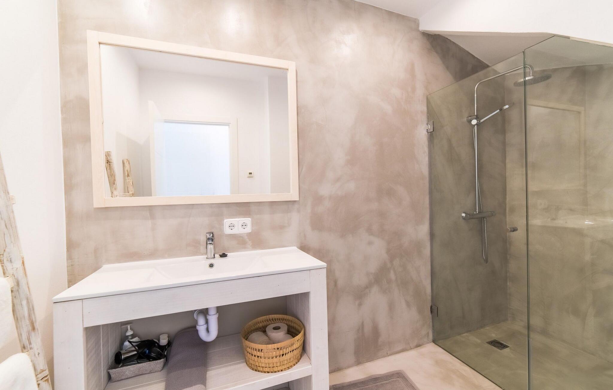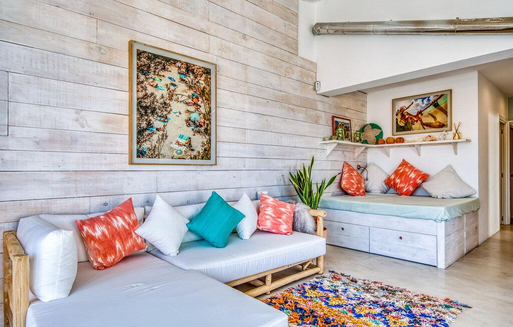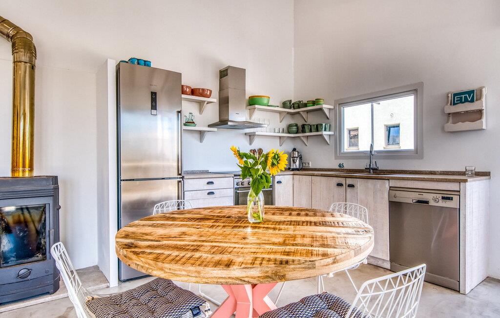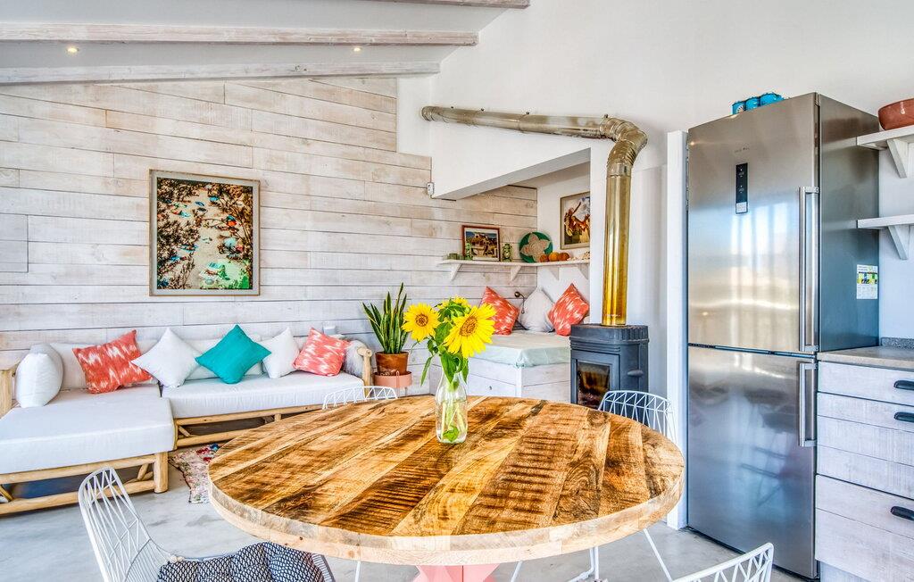 Den unglaublich kühlen und angenehm hellen Eindruck, den man draußen bekommt, findet man auch drinnen wieder. Ohne zu übertreiben kann man ohne weiteres sagen, dass das „Beach House“ einfach perfekt ist. Ein trendiger Weiß-Stil erwartet uns nicht nur an den Wänden und Holzdeckenbalken und im äußerst anmutigen Dekor, sondern auch im coolen Industrie-Look des Bodenbelags. Ein maritimes Flair weht durch die durchgehenden Terrassen-Schiebetüren, die sich zu den Terrassen öffnen, sodass Sie in einer lichtdurchfluteten, fröhlichen Atmosphäre willkommen geheißen werden. Die Türen führen direkt ins Herz des Hauses – einen kombinierten Wohn-, Ess- und Küchenbereich. Der filigrane ovale Designertisch mit weißen Stühlen bildet den Mittelpunkt des Raumes. Der zeitgenössische maritime Charakter spiegelt sich in den geschmackvollen, großformatigen Collagen an den Wänden wider. Die voll ausgestattete Küche kombiniert gekonnt weiße Möbel mit Edelstahl. Der Kamin sorgt an kühleren Tagen für unbeschwerte Behaglichkeit und sorgt als Ergänzung zur Fußbodenheizung dafür, dass dieses Traumhaus das ganze Jahr über genutzt werden kann. Entspannen Sie sich auf dem Bambussofa oder dem Tagesbett, das neben dem Flur zu den Schlafzimmern steht. Die Schlafzimmer sind angenehm kompakt und perfekt proportioniert. Die schicken Badezimmer sind kaum zu überbieten, mit begehbaren Duschen und hochwertigen Glastrennwänden und einer super entspannten Betonoptik. Vielleicht werden sie vom Hauptschlafzimmer gekrönt, das sich in der obersten Etage befindet und über einen Zugang zum Dach verfügt.