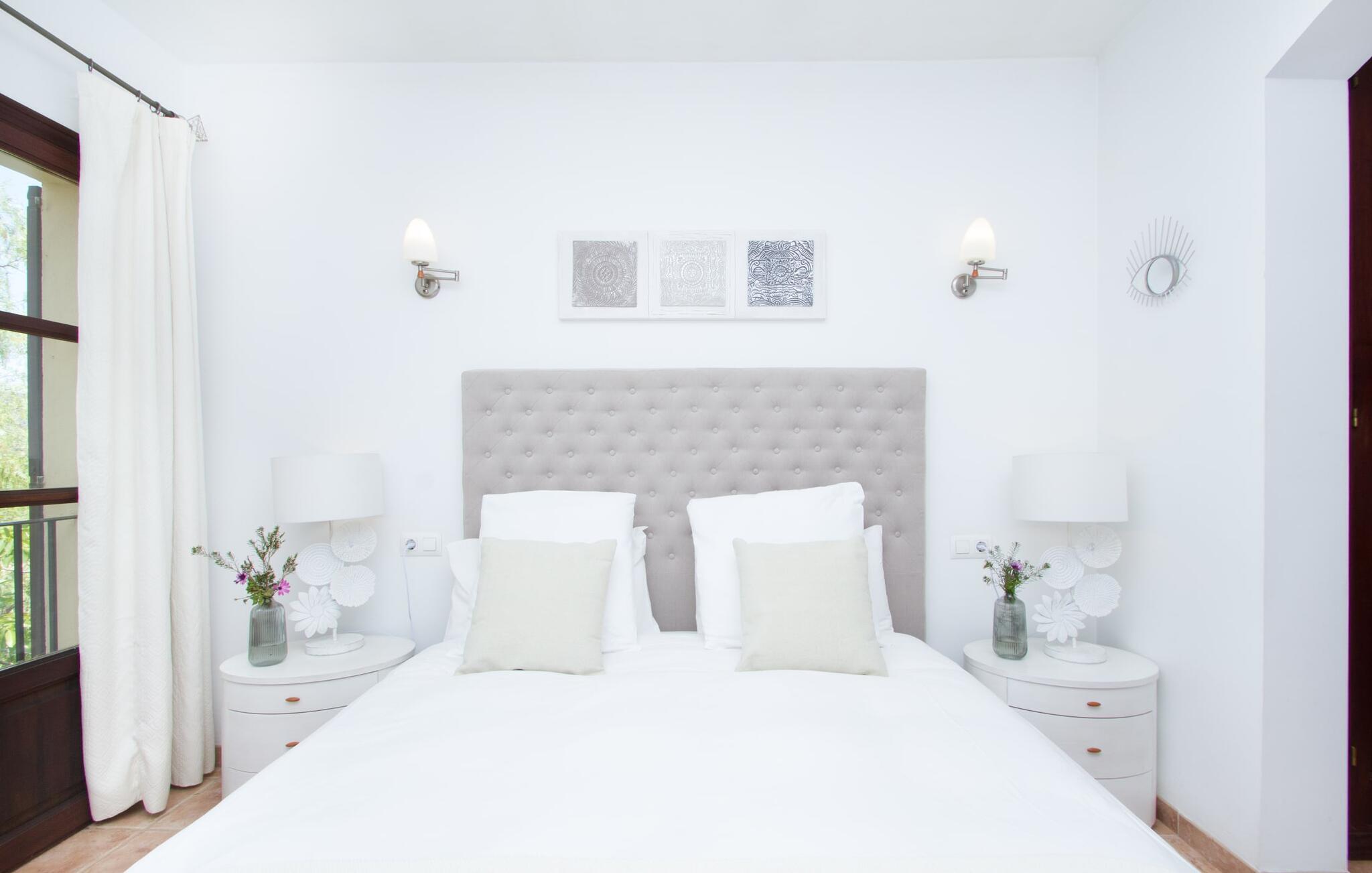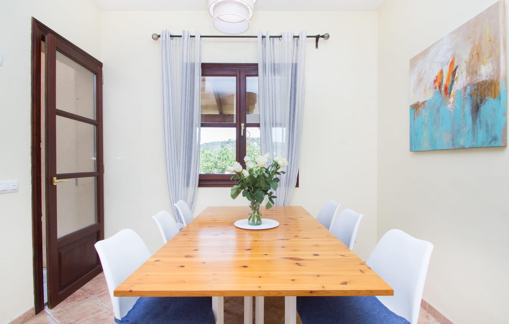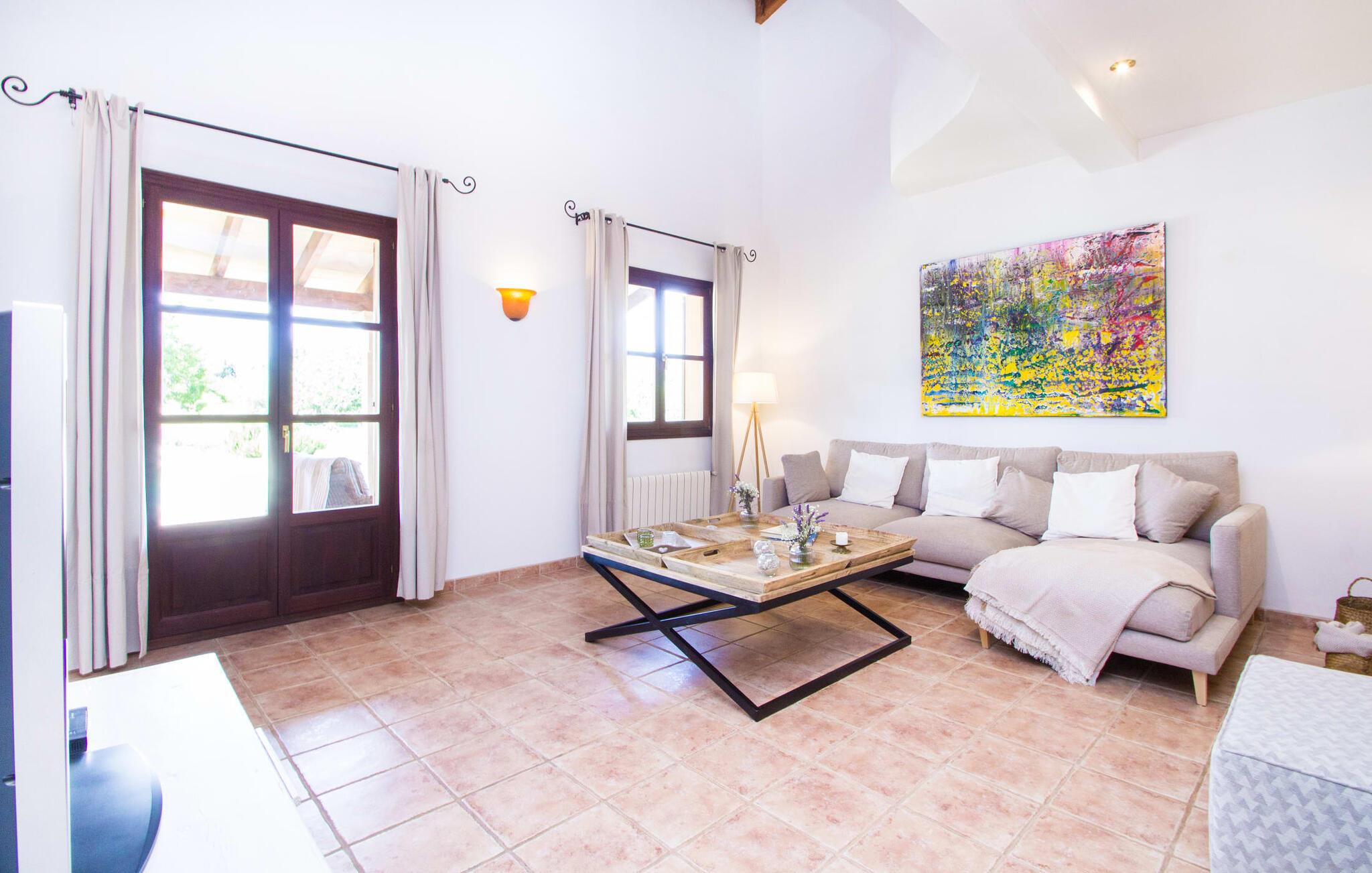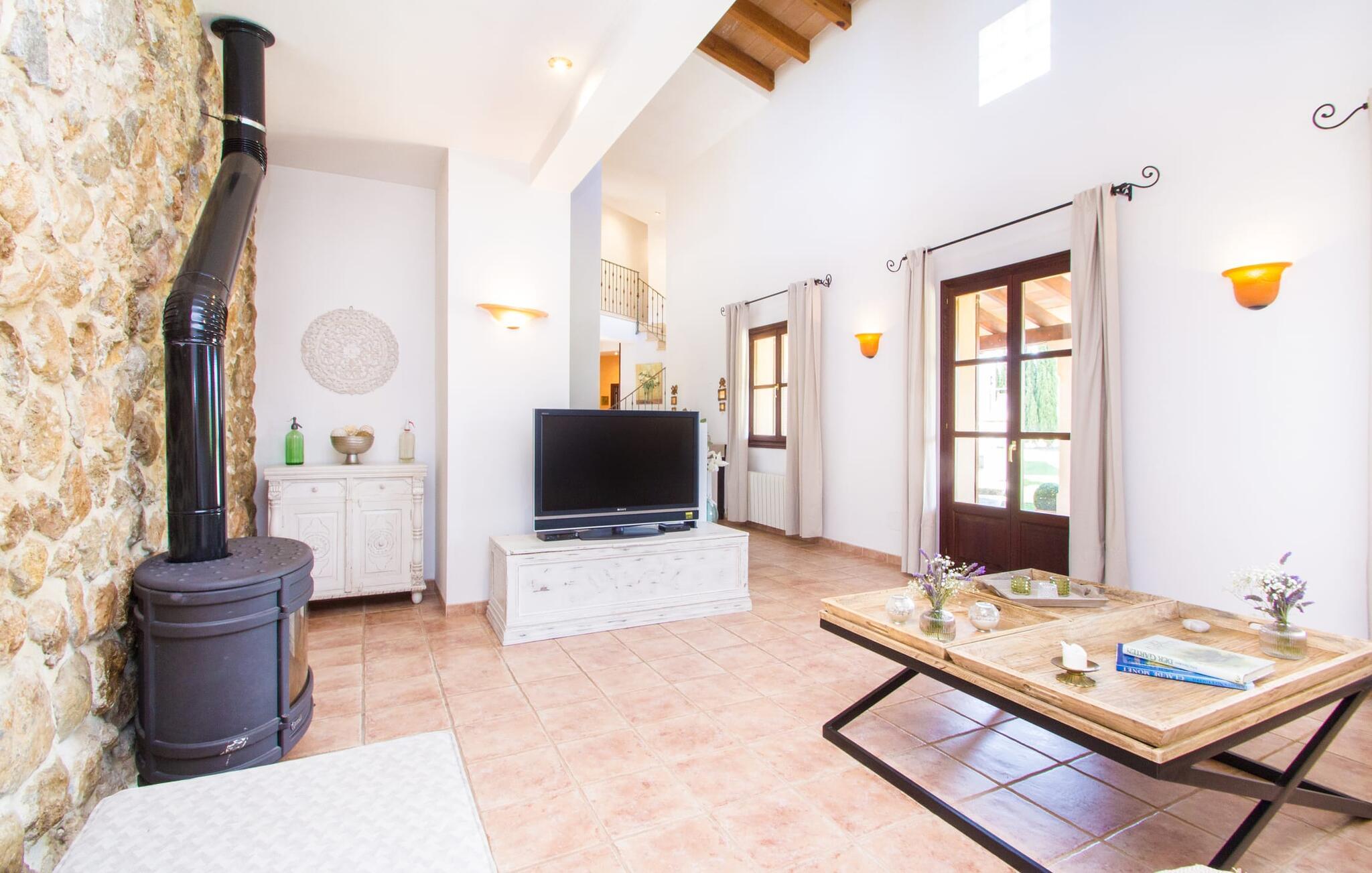 Im Inneren befindet sich das charmante Wohnzimmer mit einer bequemen Ledersofagruppe, klassischer Kunst, rustikalen Holzmöbeln und einer herrlichen Steinmauer. An kühleren Tagen sorgt ein Kamin für wohlige Wärme, während moderne Annehmlichkeiten dafür sorgen, dass Sie in Kontakt bleiben. Die rustikale, voll ausgestattete Küche bietet viel Platz für die Zubereitung köstlicher Mahlzeiten. Sollte das Wetter umschlagen, steht für Zusammenkünfte im Innenbereich ein Esstisch zur Verfügung. "Ca Na Castell Son Rubi“ bietet Platz für sieben Gäste mit drei Doppelzimmern, einem Einzelzimmer und drei Badezimmern (eines en-suite). Jedes Schlafzimmer ist stilvoll eingerichtet und verfügt über einzigartige Farbschemata, die die einladende Atmosphäre verstärken.