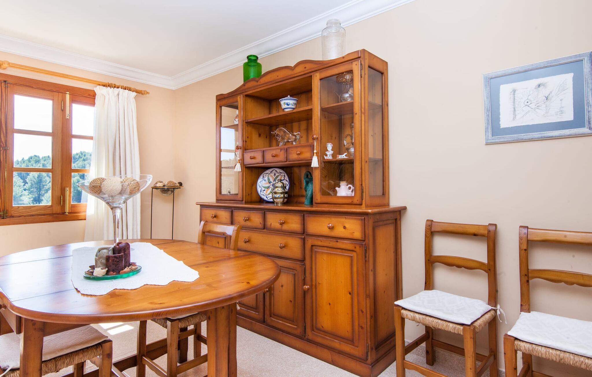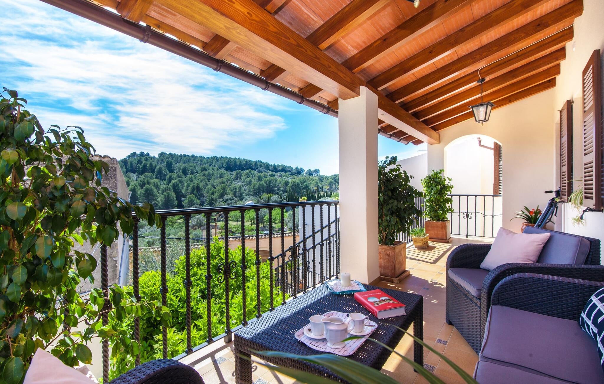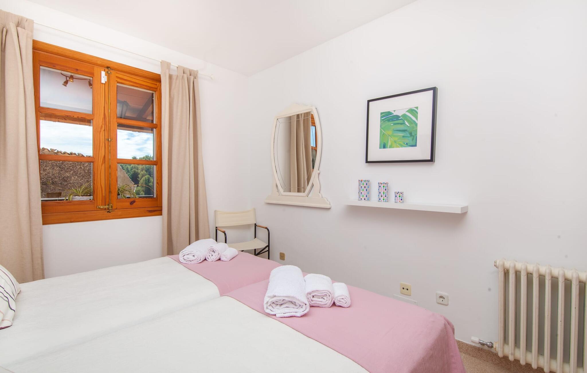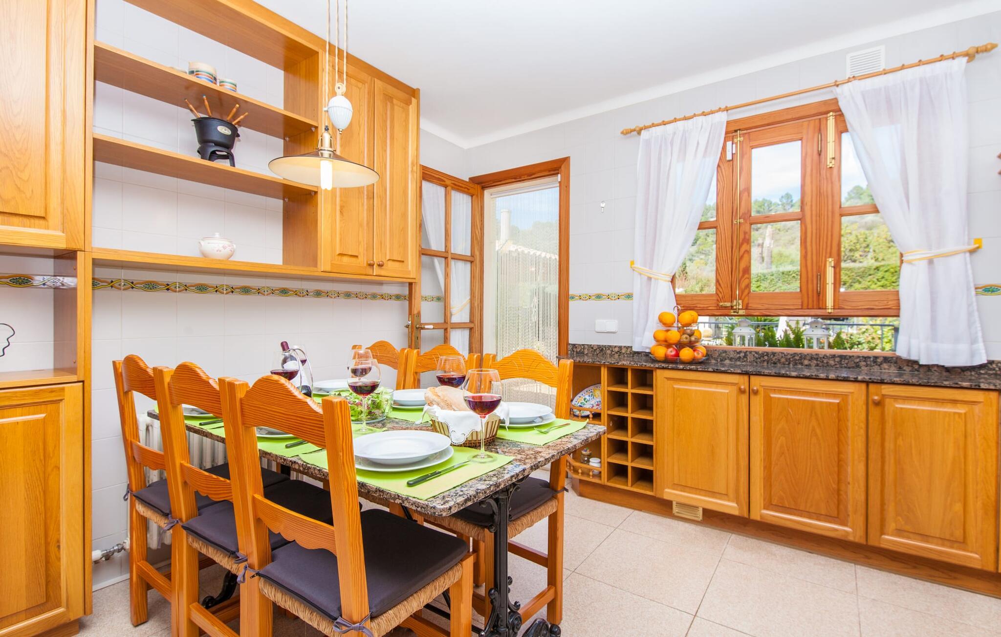 „Ca na Rosa de Selva“ vermittelt im Inneren einen hellen und freundlichen Eindruck mit klassischen, hochwertigen Möbeln. Zahlreiche Fenster lassen das typisch mallorquinische Licht herein, während die wahlweise weißen oder pastell-cremefarbenen Farben an den Wänden zur heimeligen Atmosphäre beitragen. Hier spürt man deutlich die liebevollen Details der Inneneinrichtung. In allen Zimmern hängen verschiedene Kunstwerke von Hand an den Wänden, von filigranen Skizzen bis hin zu Schwarz-Weiß-Fotografien, und die Dekorationsgegenstände wurden sorgfältig und mit viel Gespür für den Stil ausgewählt. Der Wohn- und Essbereich ist offen gestaltet und nur durch eine Glastür getrennt. Im Wohnzimmer finden Sie ein verlockendes Polstersofa mit vielen hübschen Kissen sowie passende Sessel und einen Hocker zum Hochlegen der Füße. Perfekt, um abends einen schönen Film anzusehen oder mit Freunden bei einem Glas Wein und dem Flackern der Kerzen am Deko-Kamin zu plaudern – einfach herrlich! Direkt daneben befindet sich ein Esstisch aus Holz, an dem Sie die kulinarischen Köstlichkeiten genießen können, die in der hochwertigen und geräumigen Küche zubereitet werden. Man kann aber auch in der Küche bleiben, denn hier gibt es auch einen großen Esstisch, und in der Küche fühlen sich die meisten Menschen ohnehin am wohlsten. Einem ausgiebigen Frühstück im Freien steht nichts im Wege: Von der Küche aus haben Sie direkten Zugang zu einer großen, sonnigen Terrasse. Umgeben vom Duft von Rosmarin in hübschen kleinen Terracotta-Töpfen lässt es sich hier nicht nur wunderbar essen – auch ein spannendes Buch in einem der Liegestühle weckt vielleicht die Lust. Alle Schlafzimmer untermauern nur den Gesamteindruck, den Sie von diesem Stadthaus haben: Sie sind nicht nur schön hell und mit herrlichem Blick auf die umliegende Natur, sondern auch sehr sauber, gepflegt und liebevoll gestaltet. Auch die Badezimmer sind nicht weniger beeindruckend: makellos sauber, durch und durch gut eingerichtet, mit großen Fenstern und exquisiter Beleuchtung.