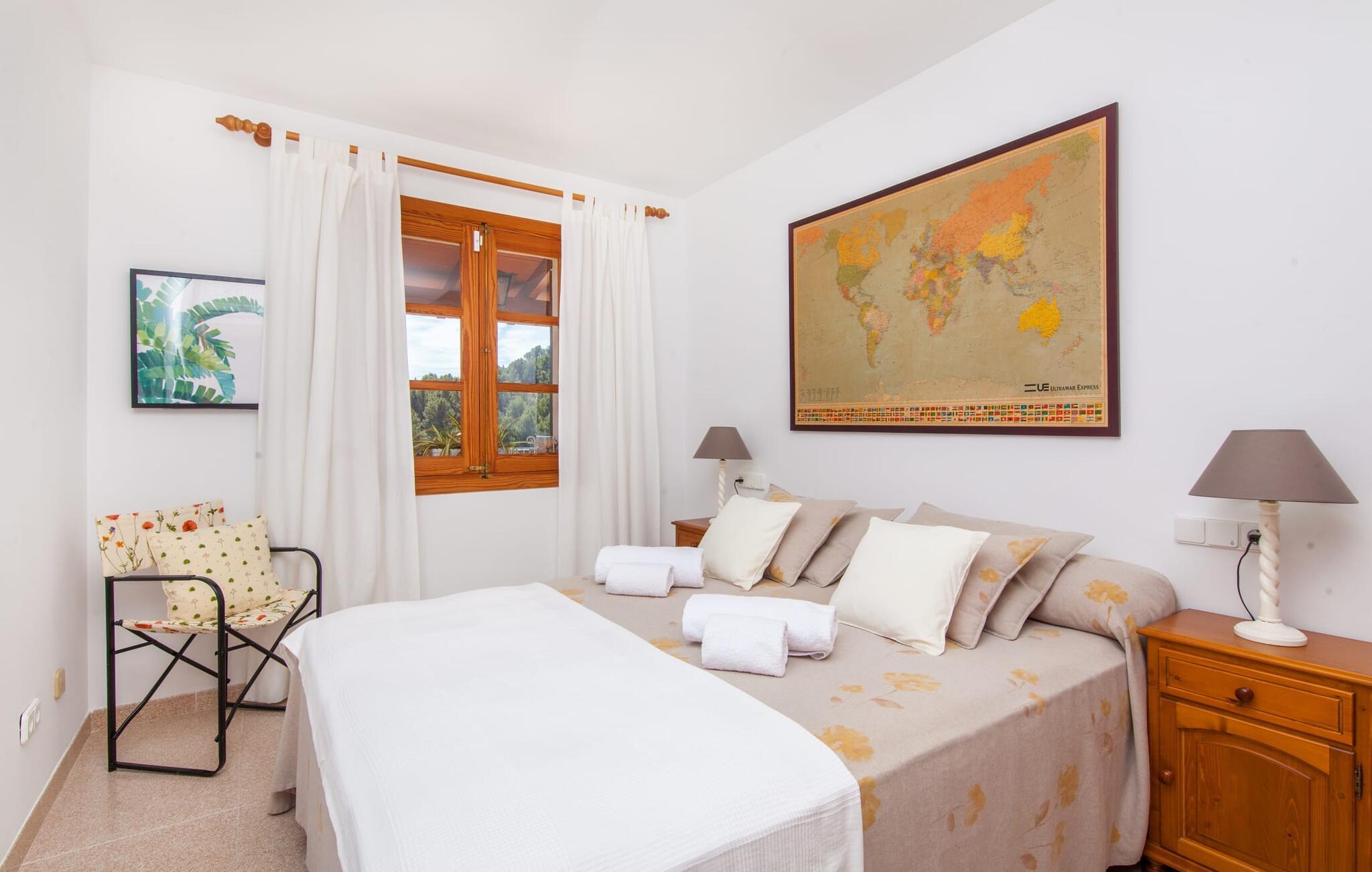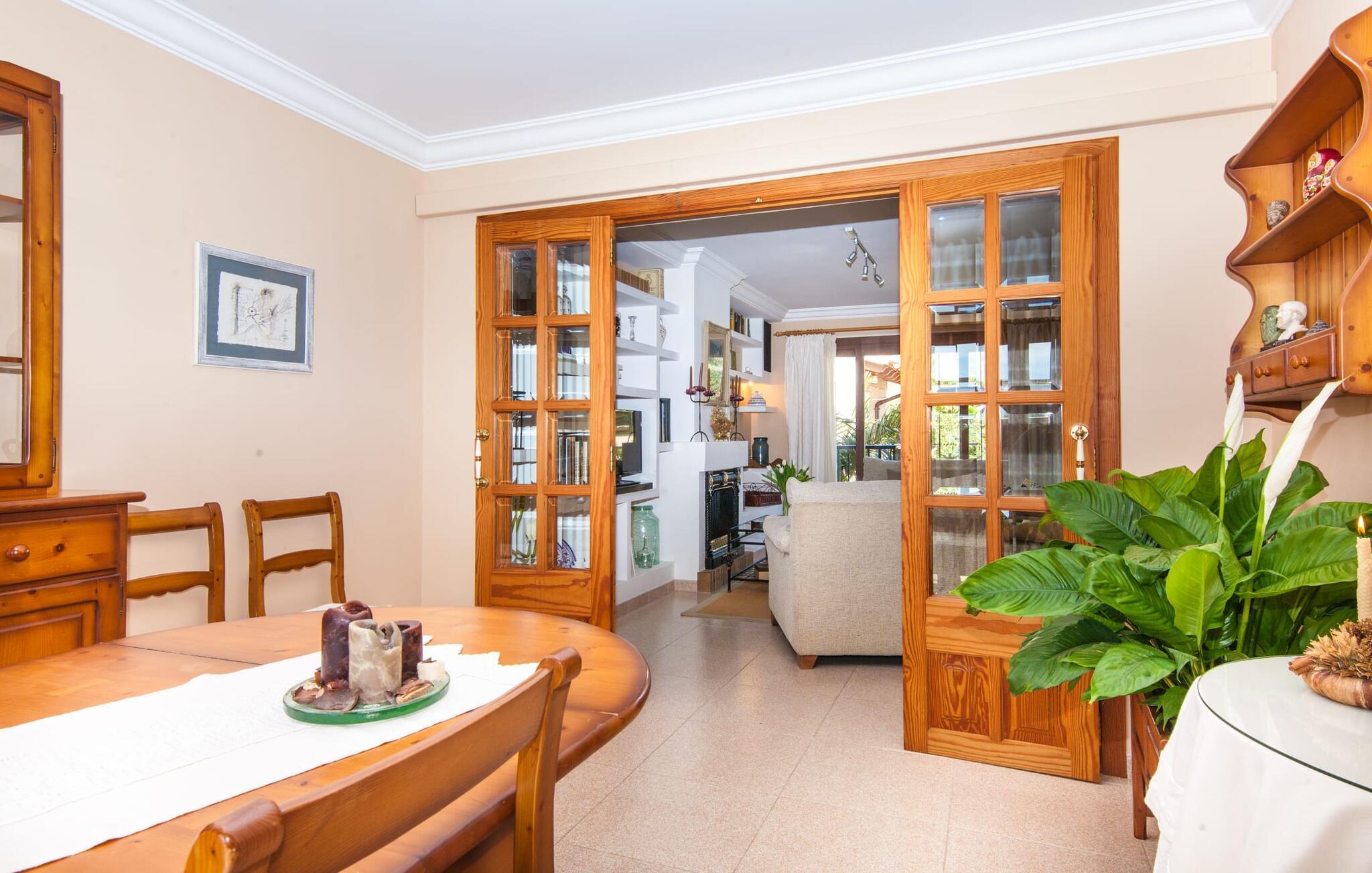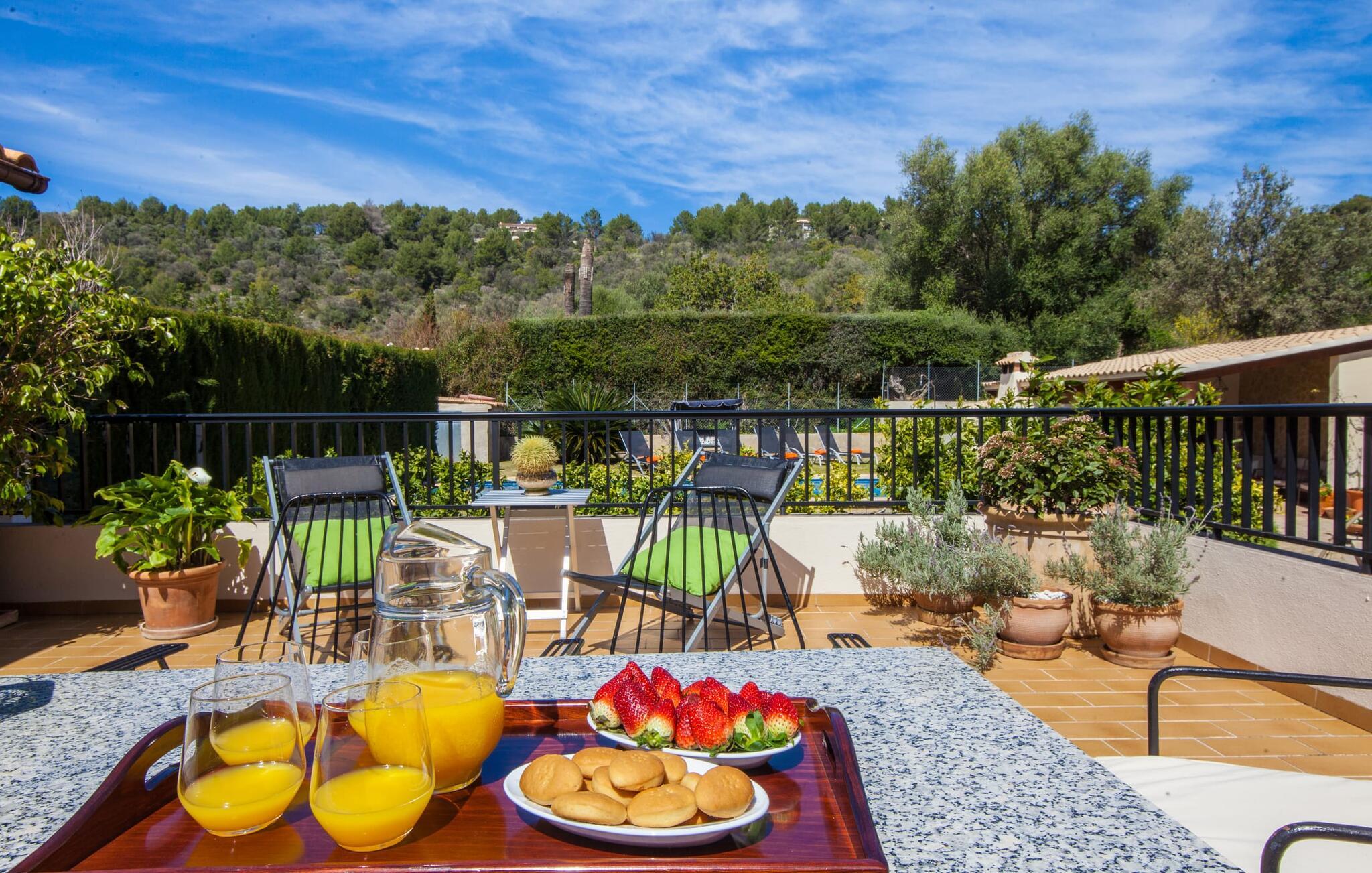 „Ca na Rosa de Selva“ vermittelt im Inneren einen hellen und freundlichen Eindruck mit klassischen, hochwertigen Möbeln. Zahlreiche Fenster lassen das typisch mallorquinische Licht herein, während die wahlweise weißen oder pastell-cremefarbenen Farben an den Wänden zur heimeligen Atmosphäre beitragen. Hier spürt man deutlich die liebevollen Details der Inneneinrichtung. In allen Zimmern hängen verschiedene Kunstwerke von Hand an den Wänden, von filigranen Skizzen bis hin zu Schwarz-Weiß-Fotografien, und die Dekorationsgegenstände wurden sorgfältig und mit viel Gespür für den Stil ausgewählt. Der Wohn- und Essbereich ist offen gestaltet und nur durch eine Glastür getrennt. Im Wohnzimmer finden Sie ein verlockendes Polstersofa mit vielen hübschen Kissen sowie passende Sessel und einen Hocker zum Hochlegen der Füße. Perfekt, um abends einen schönen Film anzusehen oder mit Freunden bei einem Glas Wein und dem Flackern der Kerzen am Deko-Kamin zu plaudern – einfach herrlich! Direkt daneben befindet sich ein Esstisch aus Holz, an dem Sie die kulinarischen Köstlichkeiten genießen können, die in der hochwertigen und geräumigen Küche zubereitet werden. Man kann aber auch in der Küche bleiben, denn hier gibt es auch einen großen Esstisch, und in der Küche fühlen sich die meisten Menschen ohnehin am wohlsten. Einem ausgiebigen Frühstück im Freien steht nichts im Wege: Von der Küche aus haben Sie direkten Zugang zu einer großen, sonnigen Terrasse. Umgeben vom Duft von Rosmarin in hübschen kleinen Terracotta-Töpfen lässt es sich hier nicht nur wunderbar essen – auch ein spannendes Buch in einem der Liegestühle weckt vielleicht die Lust. Alle Schlafzimmer untermauern nur den Gesamteindruck, den Sie von diesem Stadthaus haben: Sie sind nicht nur schön hell und mit herrlichem Blick auf die umliegende Natur, sondern auch sehr sauber, gepflegt und liebevoll gestaltet. Auch die Badezimmer sind nicht weniger beeindruckend: makellos sauber, durch und durch gut eingerichtet, mit großen Fenstern und exquisiter Beleuchtung.