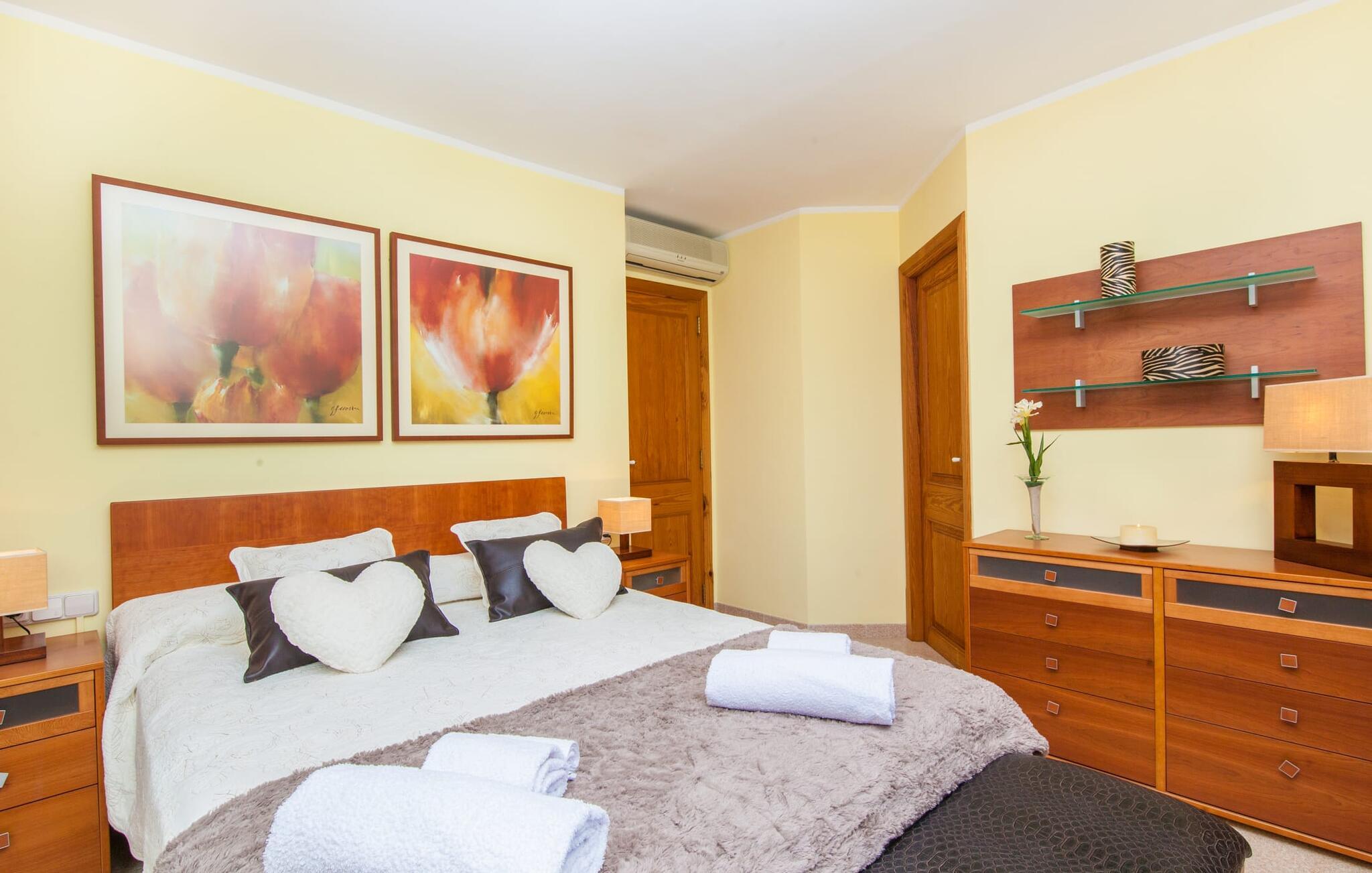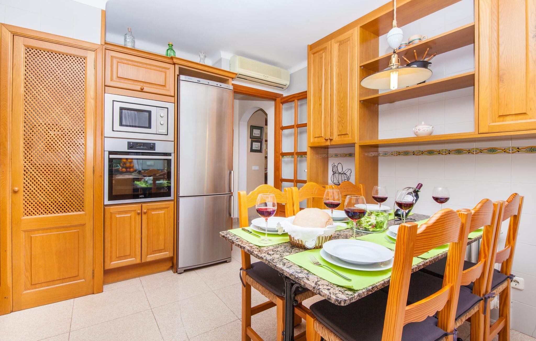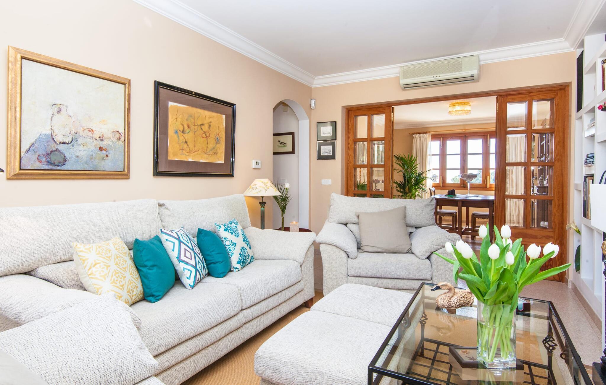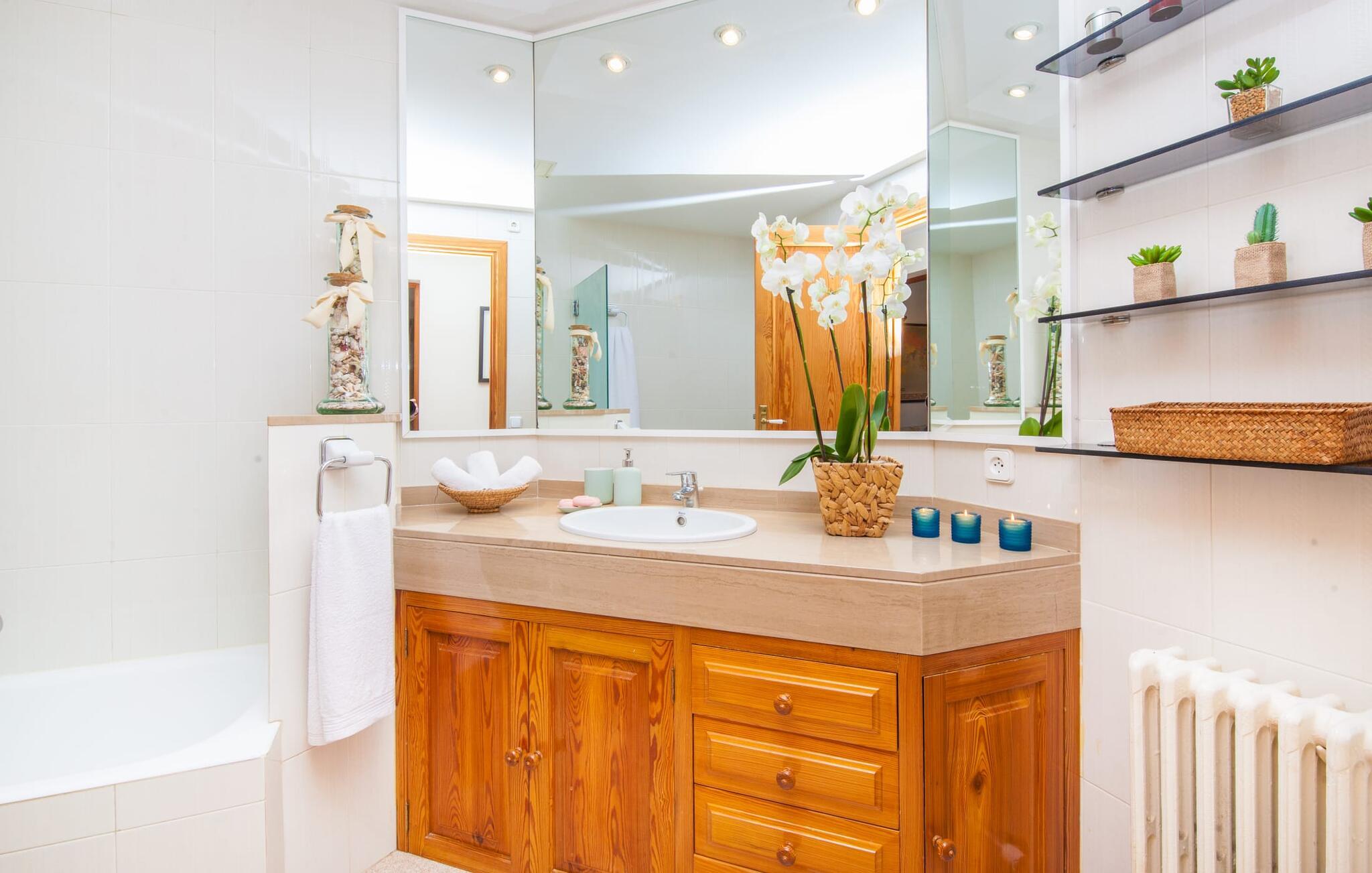 „Ca na Rosa de Selva“ vermittelt im Inneren einen hellen und freundlichen Eindruck mit klassischen, hochwertigen Möbeln. Zahlreiche Fenster lassen das typisch mallorquinische Licht herein, während die wahlweise weißen oder pastell-cremefarbenen Farben an den Wänden zur heimeligen Atmosphäre beitragen. Hier spürt man deutlich die liebevollen Details der Inneneinrichtung. In allen Zimmern hängen verschiedene Kunstwerke von Hand an den Wänden, von filigranen Skizzen bis hin zu Schwarz-Weiß-Fotografien, und die Dekorationsgegenstände wurden sorgfältig und mit viel Gespür für den Stil ausgewählt. Der Wohn- und Essbereich ist offen gestaltet und nur durch eine Glastür getrennt. Im Wohnzimmer finden Sie ein verlockendes Polstersofa mit vielen hübschen Kissen sowie passende Sessel und einen Hocker zum Hochlegen der Füße. Perfekt, um abends einen schönen Film anzusehen oder mit Freunden bei einem Glas Wein und dem Flackern der Kerzen am Deko-Kamin zu plaudern – einfach herrlich! Direkt daneben befindet sich ein Esstisch aus Holz, an dem Sie die kulinarischen Köstlichkeiten genießen können, die in der hochwertigen und geräumigen Küche zubereitet werden. Man kann aber auch in der Küche bleiben, denn hier gibt es auch einen großen Esstisch, und in der Küche fühlen sich die meisten Menschen ohnehin am wohlsten. Einem ausgiebigen Frühstück im Freien steht nichts im Wege: Von der Küche aus haben Sie direkten Zugang zu einer großen, sonnigen Terrasse. Umgeben vom Duft von Rosmarin in hübschen kleinen Terracotta-Töpfen lässt es sich hier nicht nur wunderbar essen – auch ein spannendes Buch in einem der Liegestühle weckt vielleicht die Lust. Alle Schlafzimmer untermauern nur den Gesamteindruck, den Sie von diesem Stadthaus haben: Sie sind nicht nur schön hell und mit herrlichem Blick auf die umliegende Natur, sondern auch sehr sauber, gepflegt und liebevoll gestaltet. Auch die Badezimmer sind nicht weniger beeindruckend: makellos sauber, durch und durch gut eingerichtet, mit großen Fenstern und exquisiter Beleuchtung.