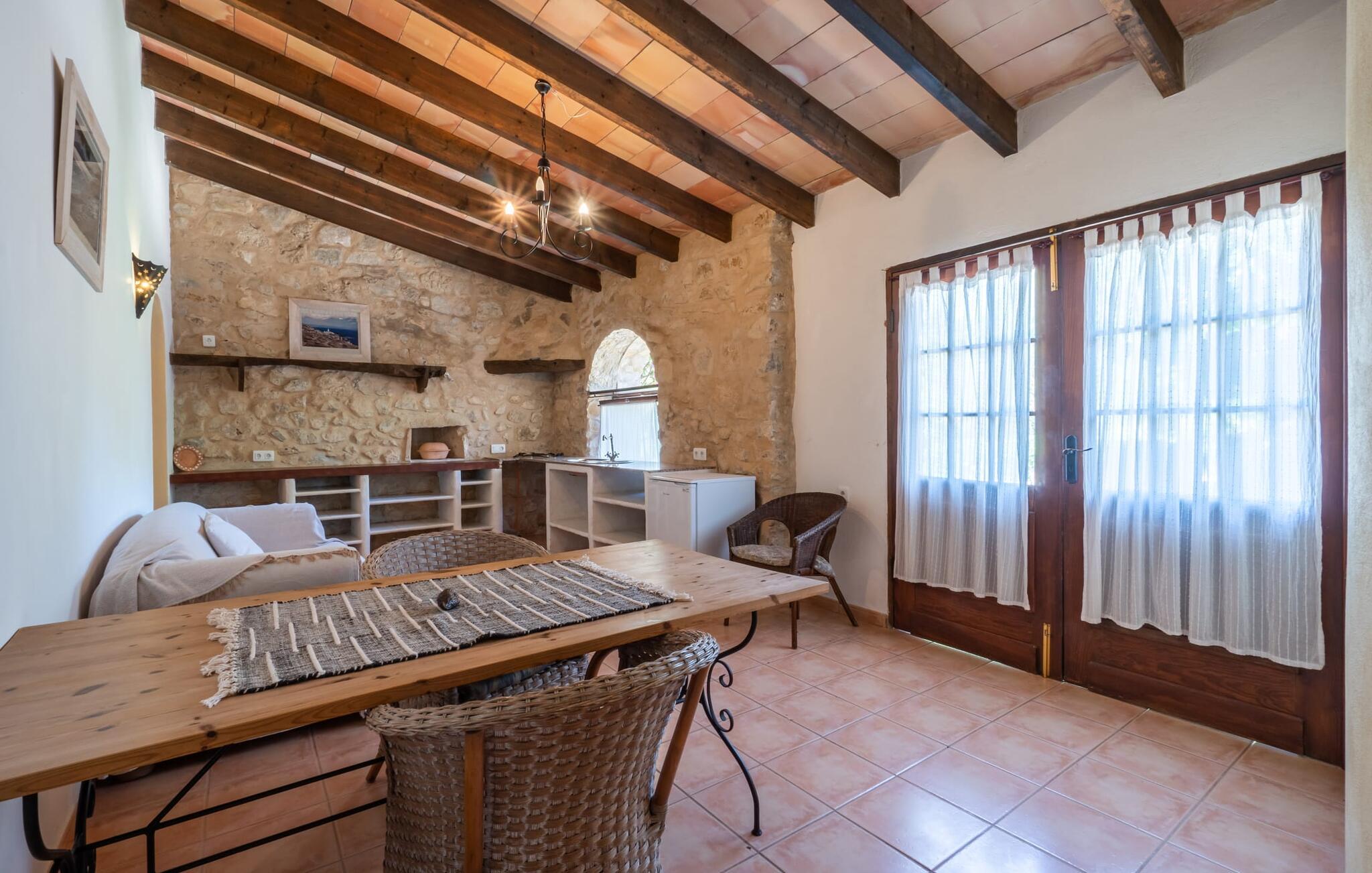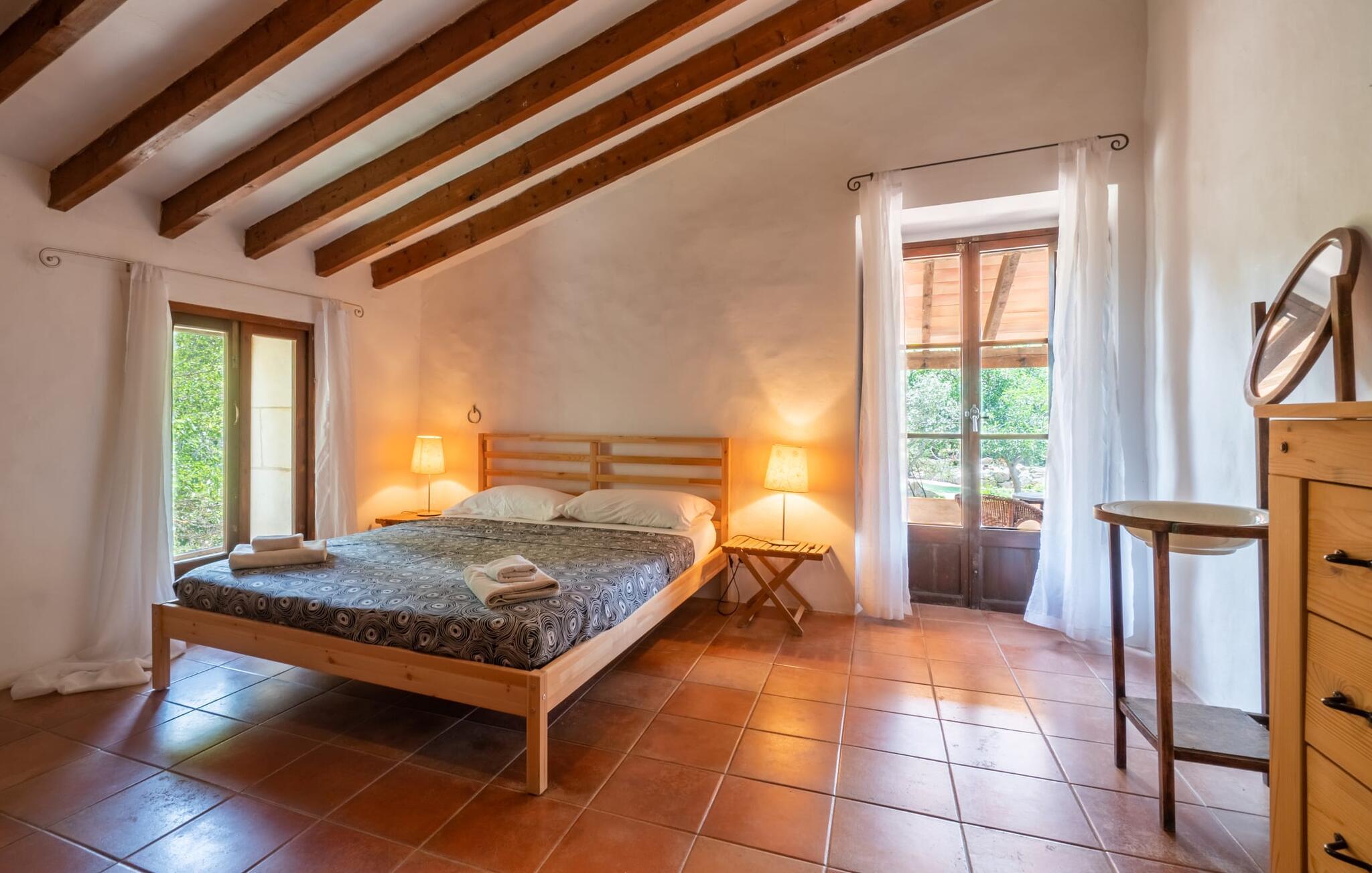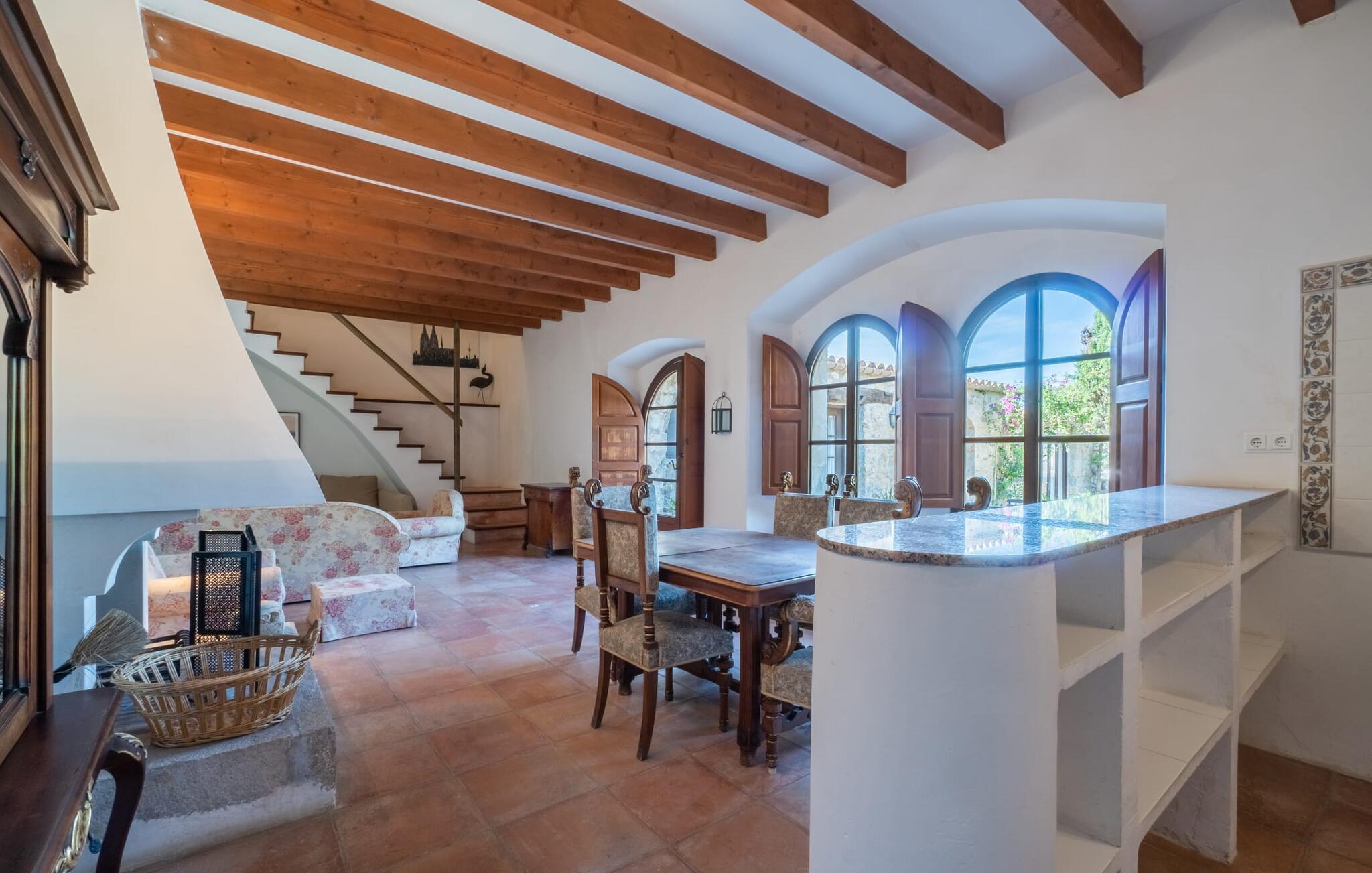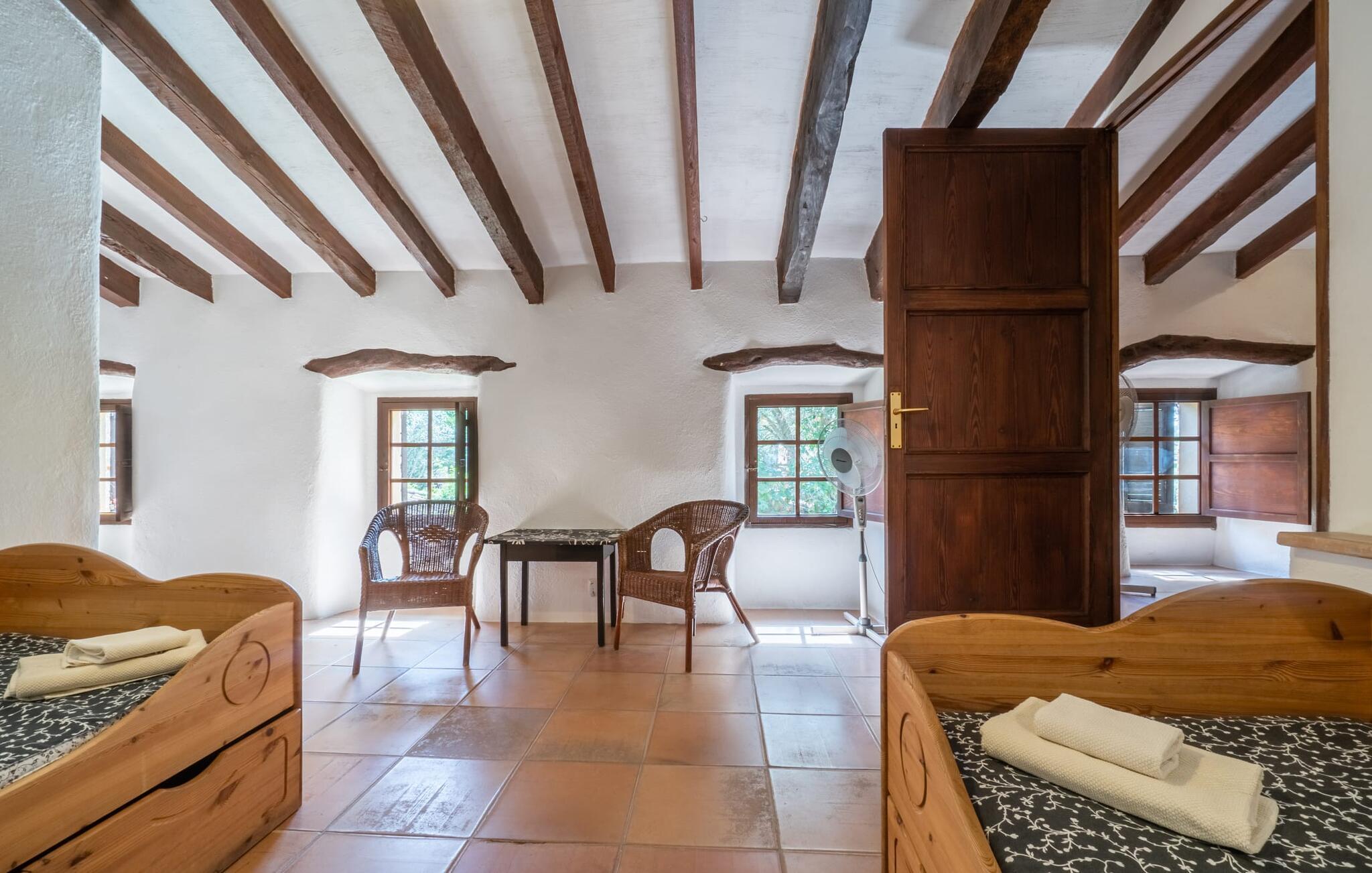 Das Innere des Hauses verfügt über einen sehr großzügigen Wohnraum. Hohe Räume mit Sichtbalken, Terrakottafliesen, antiken Holztüren und zwei Kaminen in Kombination mit vielen charmanten Details schaffen ein antik-mallorquinisches Flair, in dem auch moderne Elemente nicht fehlen. Im Erdgeschoss des Haupthauses befinden sich die gemeinschaftlichen Wohn- und Essbereiche und die Küche sowie ein Doppelschlafzimmer mit eigenem Bad. Im Obergeschoss befindet sich eine Wohneinheit mit zwei verbundenen Doppelschlafzimmern und einem Badezimmer en Suite – ideal für eine kleine Familie. Drei weitere Doppelschlafzimmer, zwei davon mit Balkon, und ein zusätzliches Badezimmer befinden sich ebenfalls auf dieser Etage. Zwei weitere Wohneinheiten für jeweils vier bzw. fünf Urlauber befinden sich im angebauten Flügel und im Gästehaus, letzteres ist sogar mit einer eigenen Küche ausgestattet. Somit kann hier ein Urlaub mit einer großen Reisegruppe verbracht werden, wobei durch die insgesamt vier vorhandenen gemütlichen Wohneinheiten jeder Gast stets individuelle Rückzugsmöglichkeiten hat. Darüber hinaus gibt es einen sehr schönen Gruppenraum mit Holzboden, der sich hervorragend zum Beispiel für Yoga oder Meditation nutzen lässt. Unser Fazit: Dieses riesige Bauernhaus auf Mallorca ist ein Top-Domizil für Gruppenreisen, bei denen neben gemeinschaftlichen Aktivitäten auch Privatsphäre und Rückzug wichtig sind. Dieses charmante große Bauernhaus auf Mallorca liegt in ländlicher Lage auf einem großen, wunderschönen Gebiet zwischen Pollenca (7 km) und Alcúdia (4 km). Besonders familienfreundlich sind die feinen Sandstrände in der Nähe von Pollenca und Alcúdia, zum Beispiel Can Cap de Bou (9 km), mit ihrem flachen Einstieg.
