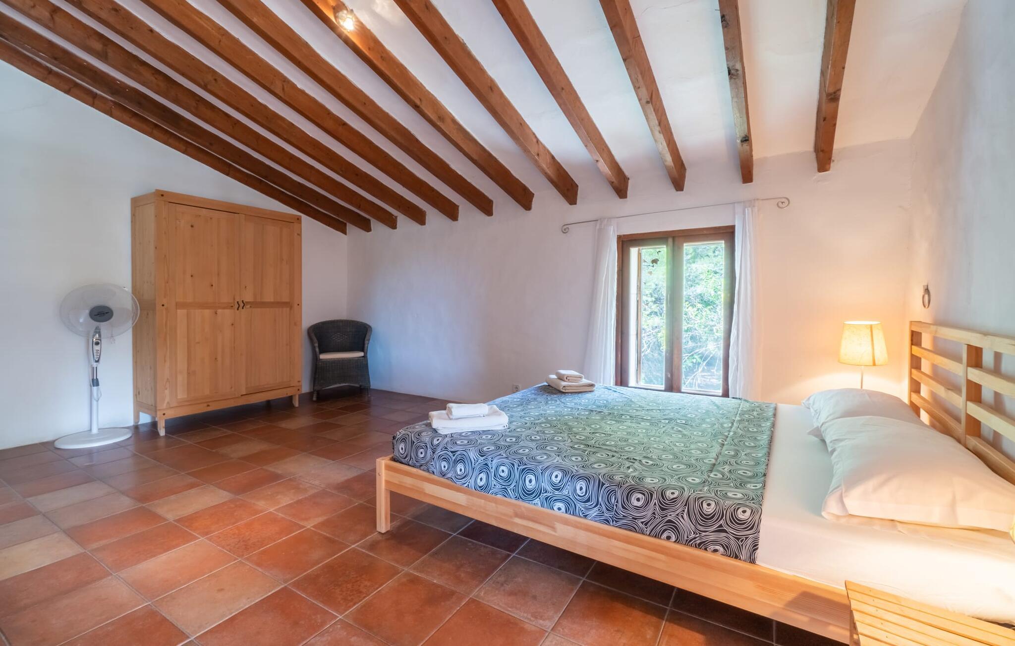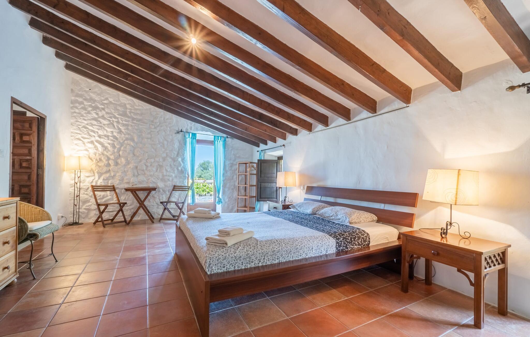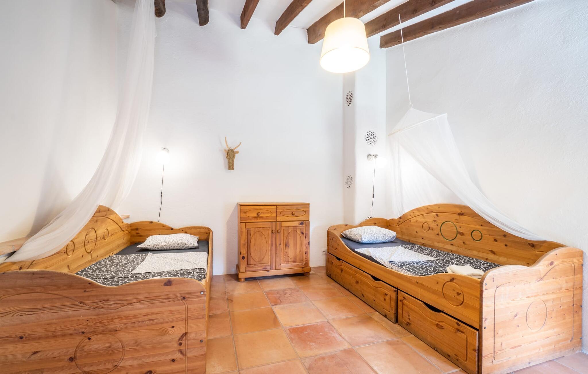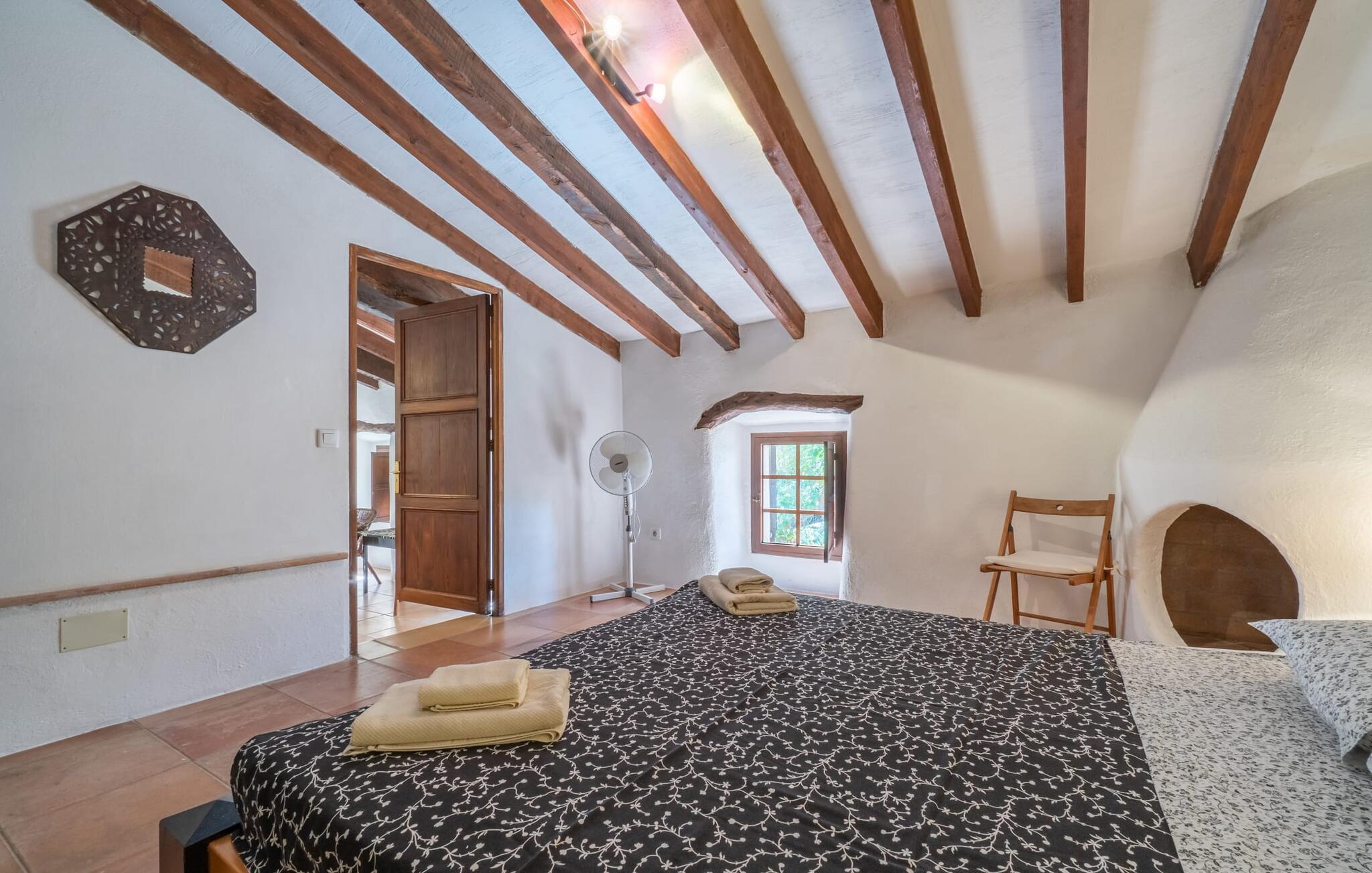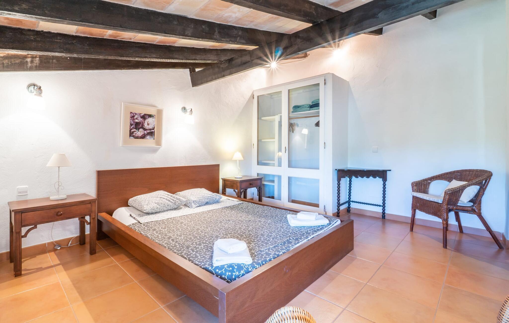 Das Innere des Hauses verfügt über einen sehr großzügigen Wohnraum. Hohe Räume mit Sichtbalken, Terrakottafliesen, antiken Holztüren und zwei Kaminen in Kombination mit vielen charmanten Details schaffen ein antik-mallorquinisches Flair, in dem auch moderne Elemente nicht fehlen. Im Erdgeschoss des Haupthauses befinden sich die gemeinschaftlichen Wohn- und Essbereiche und die Küche sowie ein Doppelschlafzimmer mit eigenem Bad. Im Obergeschoss befindet sich eine Wohneinheit mit zwei verbundenen Doppelschlafzimmern und einem Badezimmer en Suite – ideal für eine kleine Familie. Drei weitere Doppelschlafzimmer, zwei davon mit Balkon, und ein zusätzliches Badezimmer befinden sich ebenfalls auf dieser Etage. Zwei weitere Wohneinheiten für jeweils vier bzw. fünf Urlauber befinden sich im angebauten Flügel und im Gästehaus, letzteres ist sogar mit einer eigenen Küche ausgestattet. Somit kann hier ein Urlaub mit einer großen Reisegruppe verbracht werden, wobei durch die insgesamt vier vorhandenen gemütlichen Wohneinheiten jeder Gast stets individuelle Rückzugsmöglichkeiten hat. Darüber hinaus gibt es einen sehr schönen Gruppenraum mit Holzboden, der sich hervorragend zum Beispiel für Yoga oder Meditation nutzen lässt. Unser Fazit: Dieses riesige Bauernhaus auf Mallorca ist ein Top-Domizil für Gruppenreisen, bei denen neben gemeinschaftlichen Aktivitäten auch Privatsphäre und Rückzug wichtig sind. Dieses charmante große Bauernhaus auf Mallorca liegt in ländlicher Lage auf einem großen, wunderschönen Gebiet zwischen Pollenca (7 km) und Alcúdia (4 km). Besonders familienfreundlich sind die feinen Sandstrände in der Nähe von Pollenca und Alcúdia, zum Beispiel Can Cap de Bou (9 km), mit ihrem flachen Einstieg.