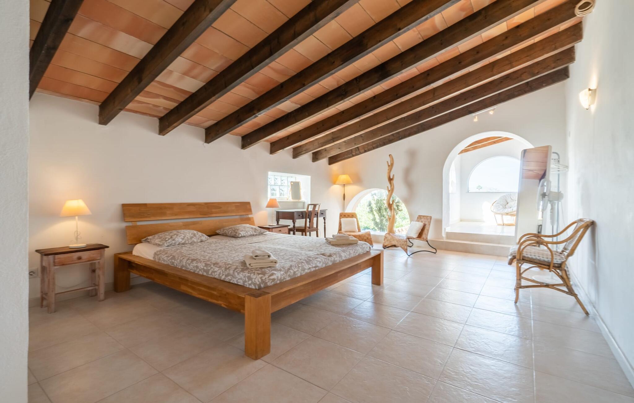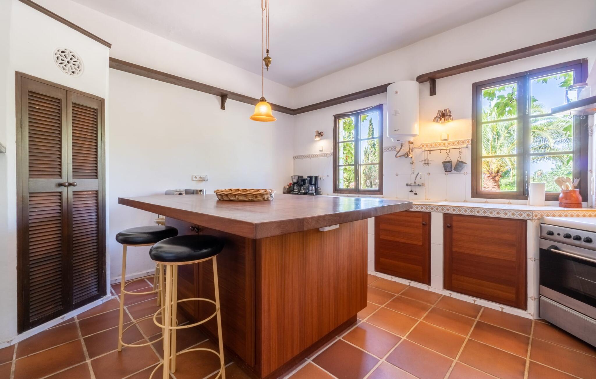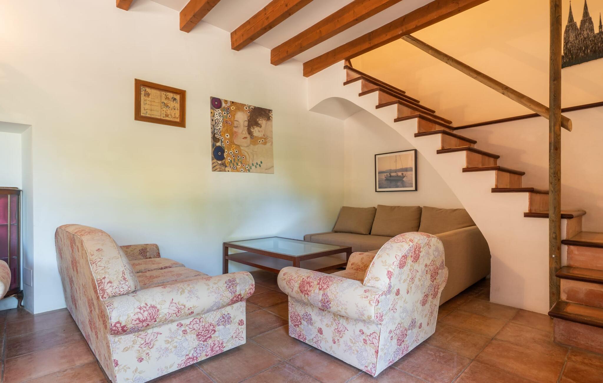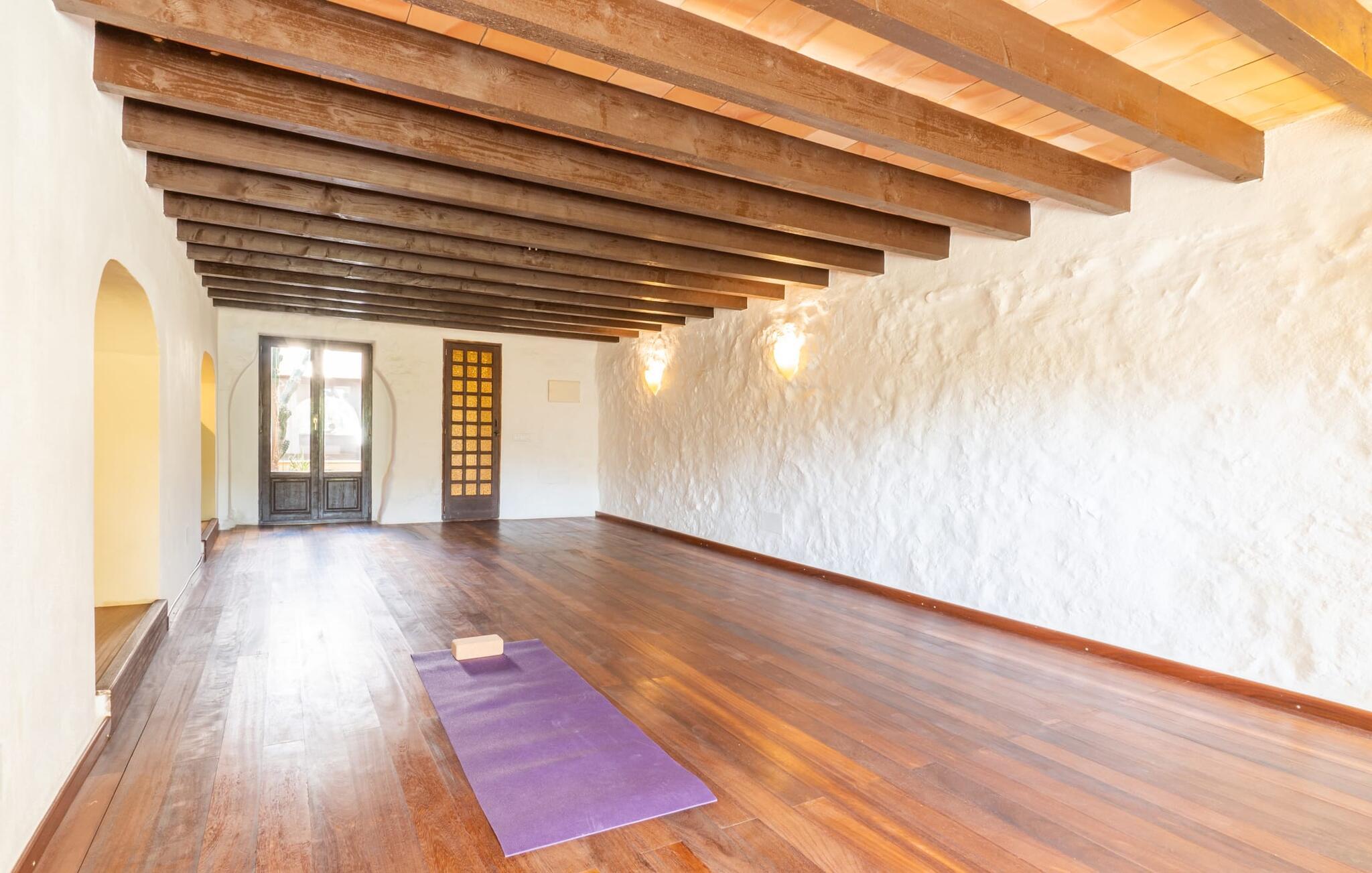Das Innere des Hauses verfügt über einen sehr großzügigen Wohnraum. Hohe Räume mit Sichtbalken, Terrakottafliesen, antiken Holztüren und zwei Kaminen in Kombination mit vielen charmanten Details schaffen ein antik-mallorquinisches Flair, in dem auch moderne Elemente nicht fehlen. Im Erdgeschoss des Haupthauses befinden sich die gemeinschaftlichen Wohn- und Essbereiche und die Küche sowie ein Doppelschlafzimmer mit eigenem Bad. Im Obergeschoss befindet sich eine Wohneinheit mit zwei verbundenen Doppelschlafzimmern und einem Badezimmer en Suite – ideal für eine kleine Familie. Drei weitere Doppelschlafzimmer, zwei davon mit Balkon, und ein zusätzliches Badezimmer befinden sich ebenfalls auf dieser Etage. Zwei weitere Wohneinheiten für jeweils vier bzw. fünf Urlauber befinden sich im angebauten Flügel und im Gästehaus, letzteres ist sogar mit einer eigenen Küche ausgestattet. Somit kann hier ein Urlaub mit einer großen Reisegruppe verbracht werden, wobei durch die insgesamt vier vorhandenen gemütlichen Wohneinheiten jeder Gast stets individuelle Rückzugsmöglichkeiten hat. Darüber hinaus gibt es einen sehr schönen Gruppenraum mit Holzboden, der sich hervorragend zum Beispiel für Yoga oder Meditation nutzen lässt. Unser Fazit: Dieses riesige Bauernhaus auf Mallorca ist ein Top-Domizil für Gruppenreisen, bei denen neben gemeinschaftlichen Aktivitäten auch Privatsphäre und Rückzug wichtig sind. Dieses charmante große Bauernhaus auf Mallorca liegt in ländlicher Lage auf einem großen, wunderschönen Gebiet zwischen Pollenca (7 km) und Alcúdia (4 km). Besonders familienfreundlich sind die feinen Sandstrände in der Nähe von Pollenca und Alcúdia, zum Beispiel Can Cap de Bou (9 km), mit ihrem flachen Einstieg.
