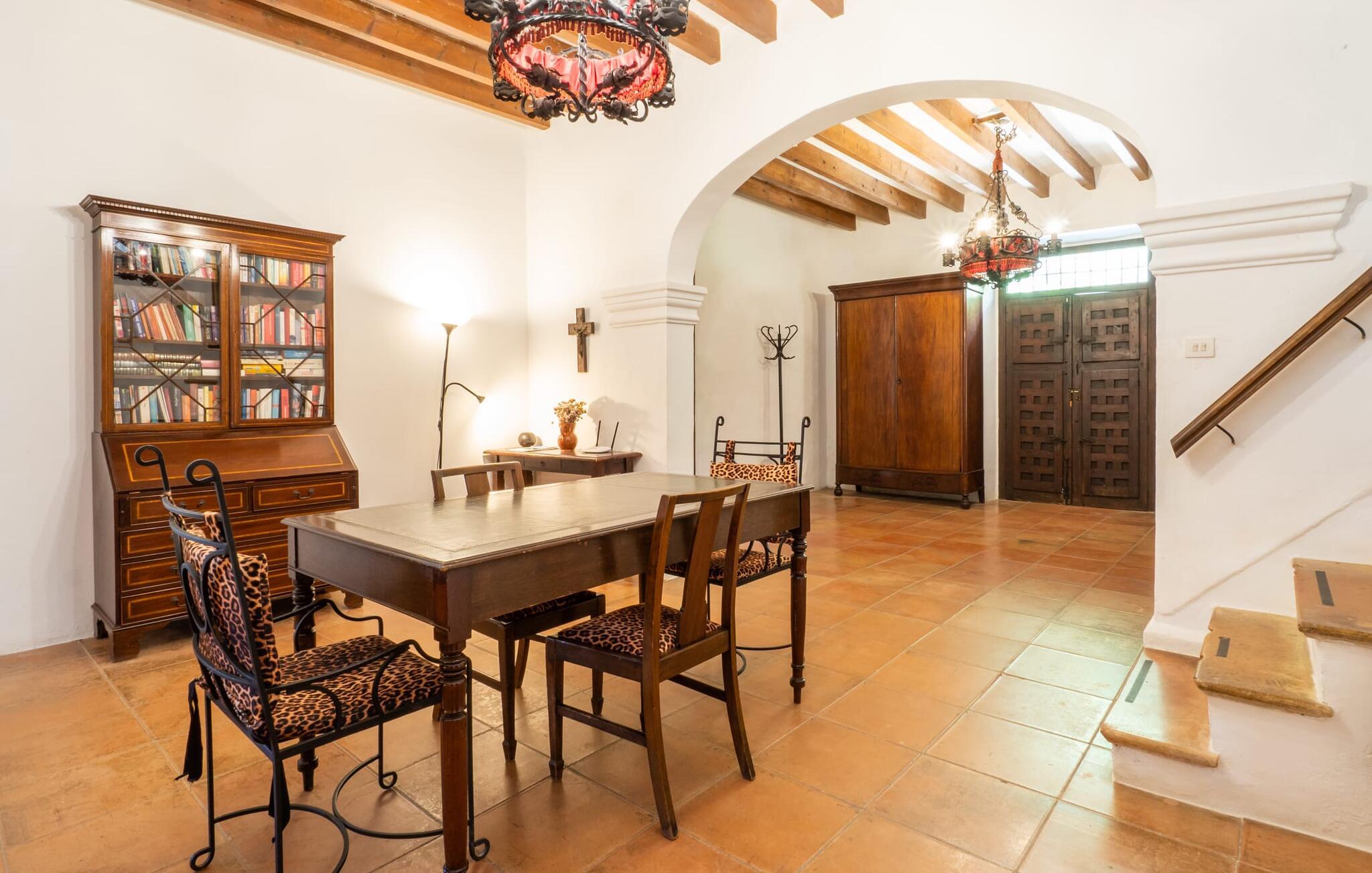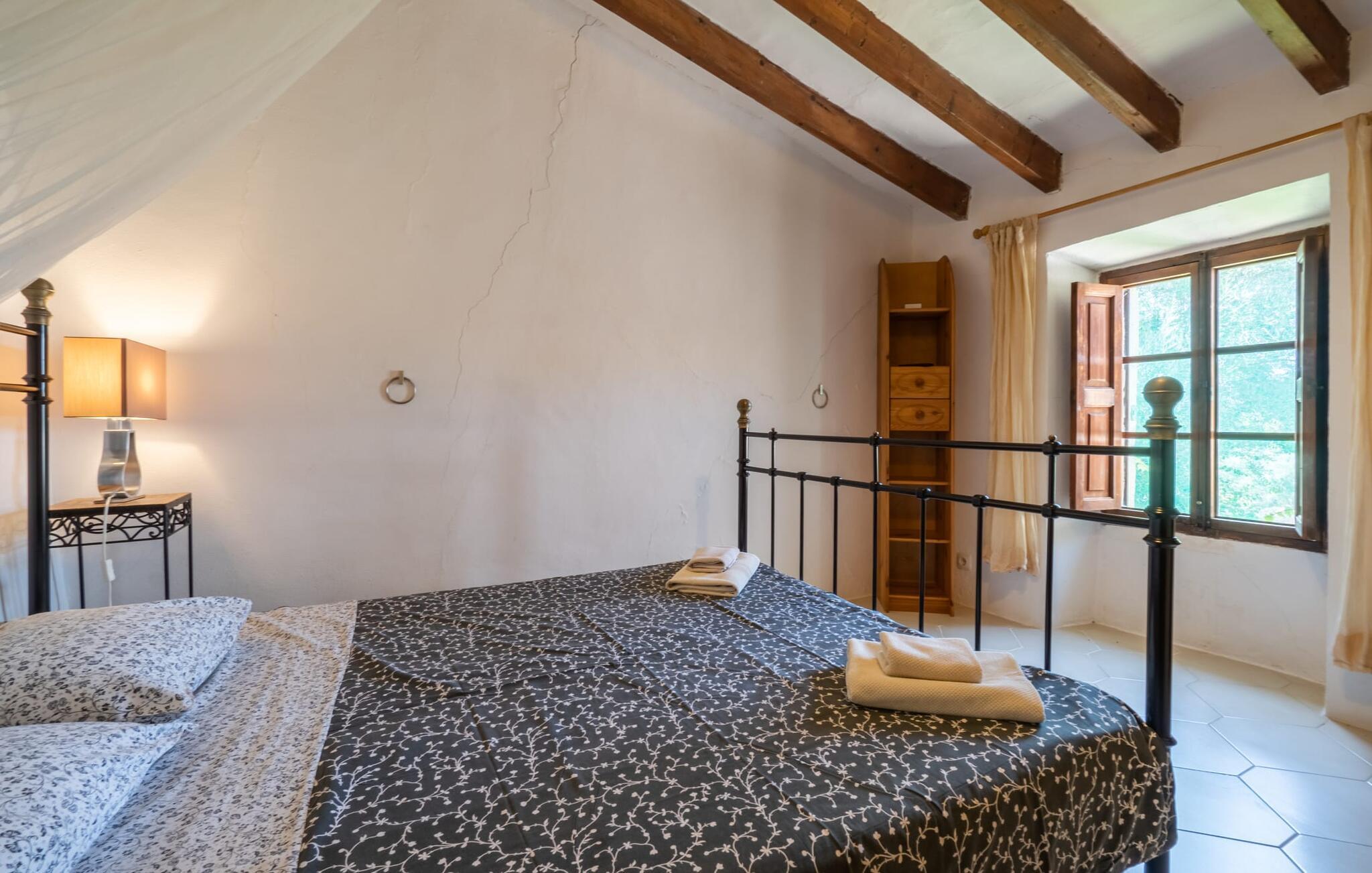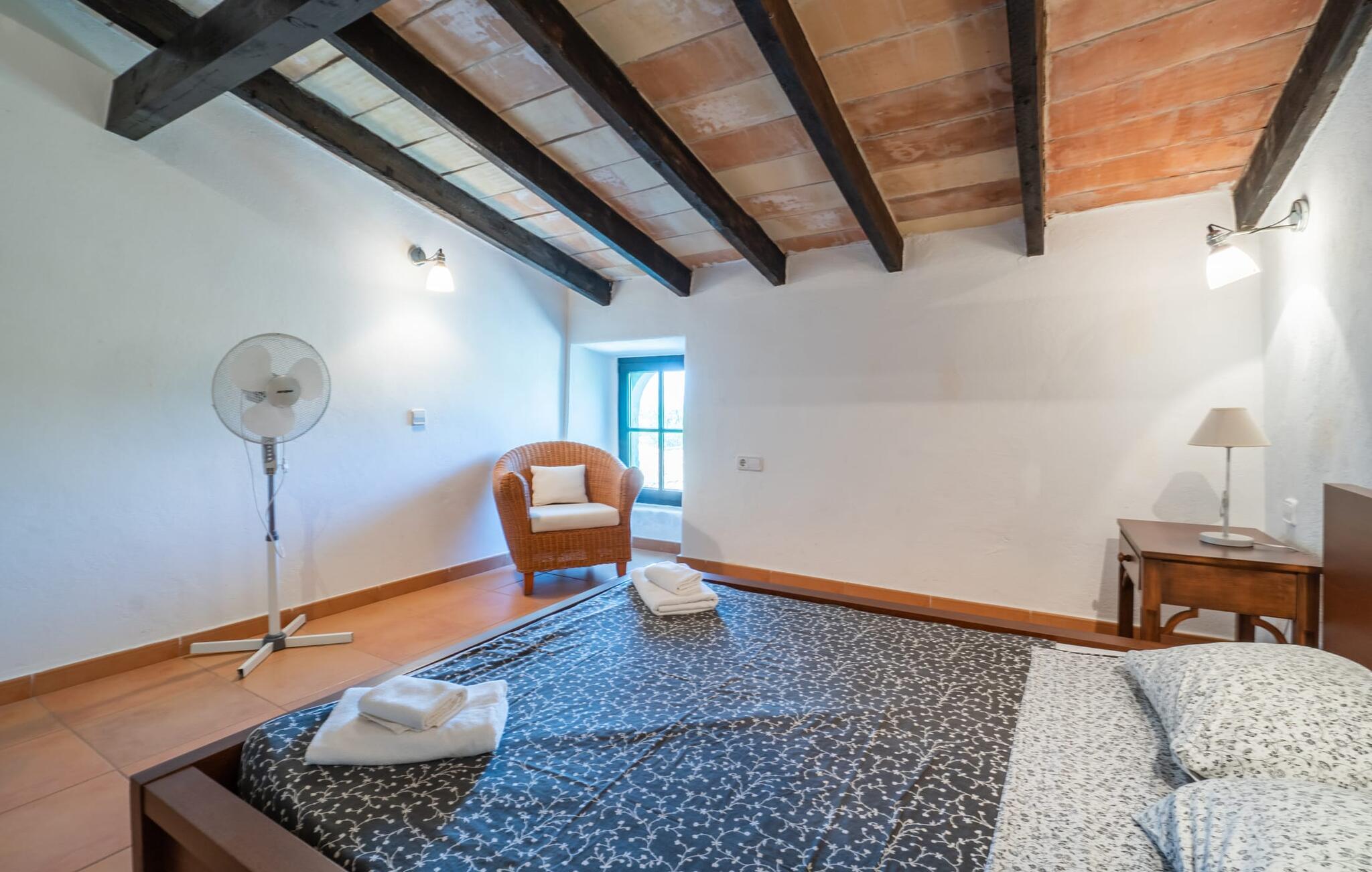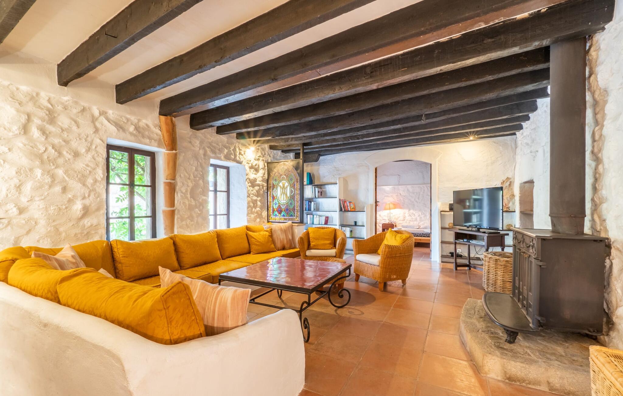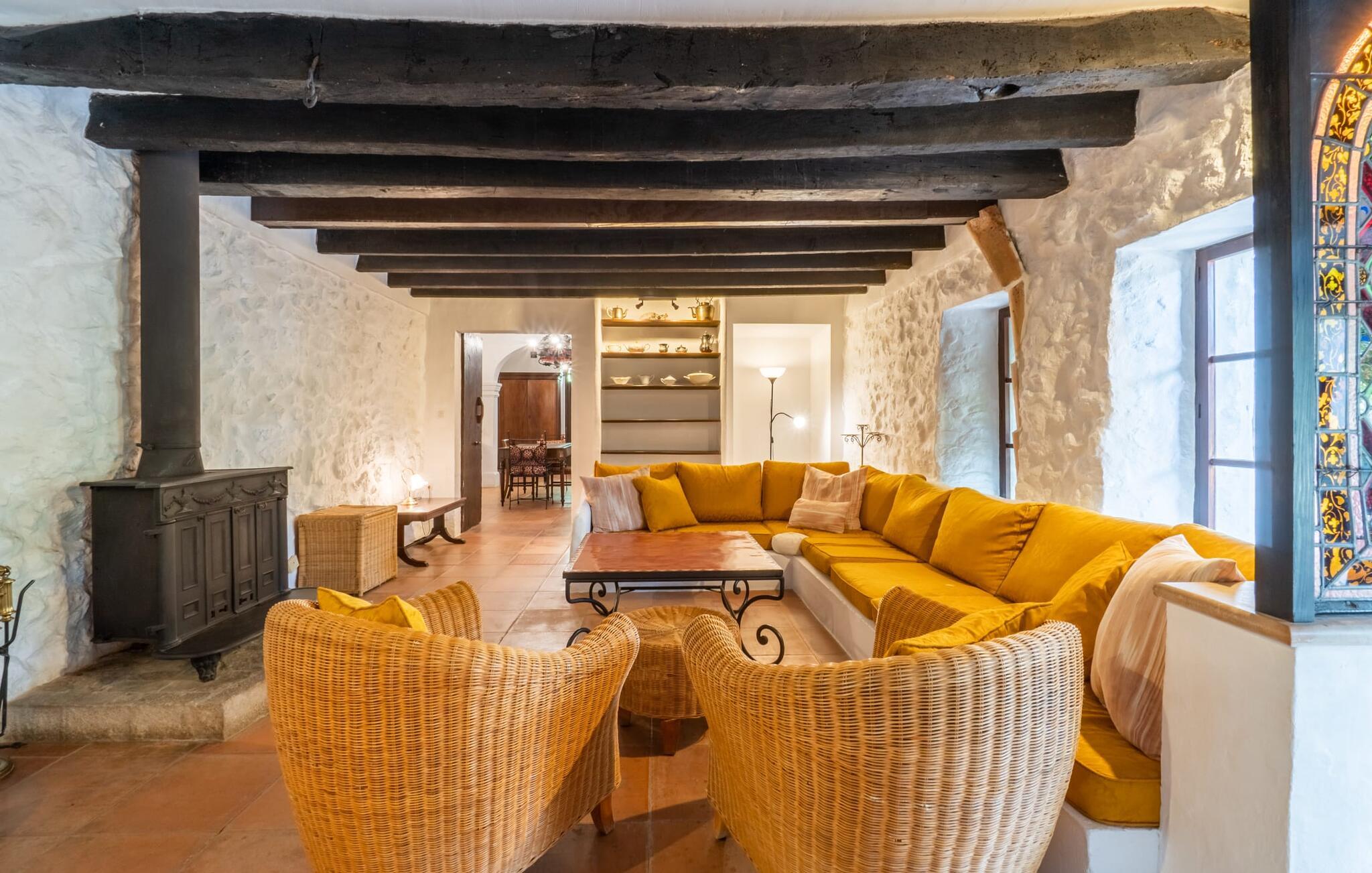 Das Innere des Hauses verfügt über einen sehr großzügigen Wohnraum. Hohe Räume mit Sichtbalken, Terrakottafliesen, antiken Holztüren und zwei Kaminen in Kombination mit vielen charmanten Details schaffen ein antik-mallorquinisches Flair, in dem auch moderne Elemente nicht fehlen. Im Erdgeschoss des Haupthauses befinden sich die gemeinschaftlichen Wohn- und Essbereiche und die Küche sowie ein Doppelschlafzimmer mit eigenem Bad. Im Obergeschoss befindet sich eine Wohneinheit mit zwei verbundenen Doppelschlafzimmern und einem Badezimmer en Suite – ideal für eine kleine Familie. Drei weitere Doppelschlafzimmer, zwei davon mit Balkon, und ein zusätzliches Badezimmer befinden sich ebenfalls auf dieser Etage. Zwei weitere Wohneinheiten für jeweils vier bzw. fünf Urlauber befinden sich im angebauten Flügel und im Gästehaus, letzteres ist sogar mit einer eigenen Küche ausgestattet. Somit kann hier ein Urlaub mit einer großen Reisegruppe verbracht werden, wobei durch die insgesamt vier vorhandenen gemütlichen Wohneinheiten jeder Gast stets individuelle Rückzugsmöglichkeiten hat. Darüber hinaus gibt es einen sehr schönen Gruppenraum mit Holzboden, der sich hervorragend zum Beispiel für Yoga oder Meditation nutzen lässt. Unser Fazit: Dieses riesige Bauernhaus auf Mallorca ist ein Top-Domizil für Gruppenreisen, bei denen neben gemeinschaftlichen Aktivitäten auch Privatsphäre und Rückzug wichtig sind. Dieses charmante große Bauernhaus auf Mallorca liegt in ländlicher Lage auf einem großen, wunderschönen Gebiet zwischen Pollenca (7 km) und Alcúdia (4 km). Besonders familienfreundlich sind die feinen Sandstrände in der Nähe von Pollenca und Alcúdia, zum Beispiel Can Cap de Bou (9 km), mit ihrem flachen Einstieg.