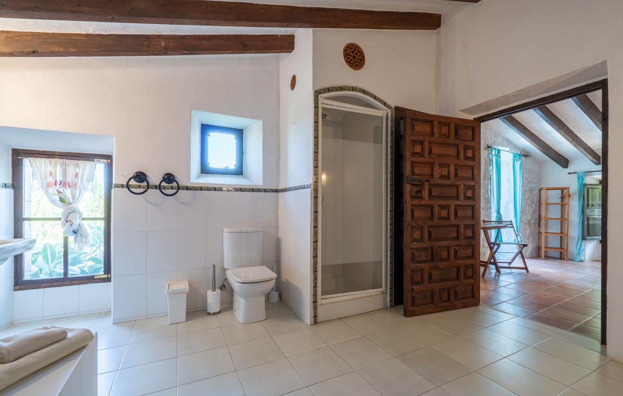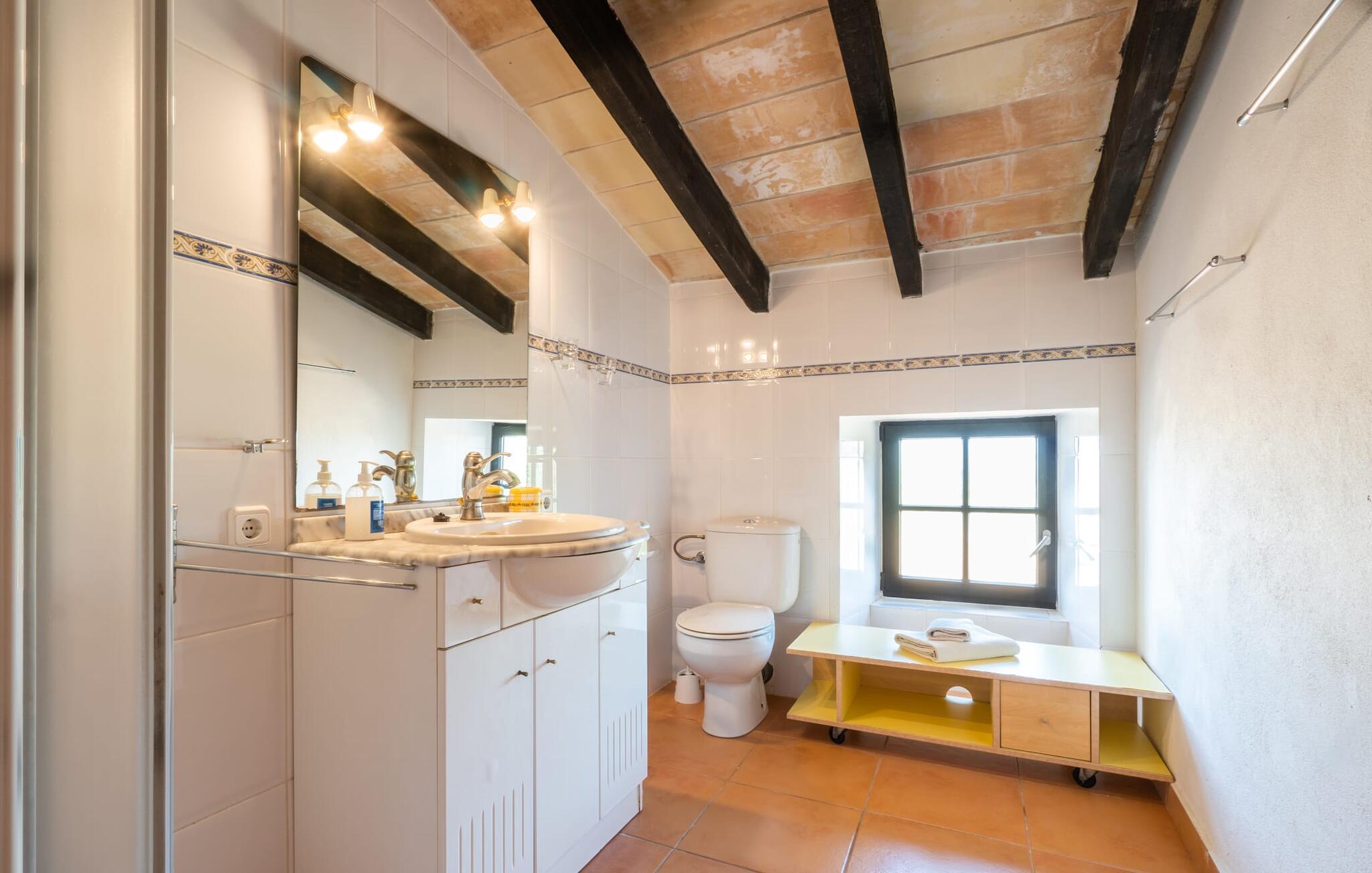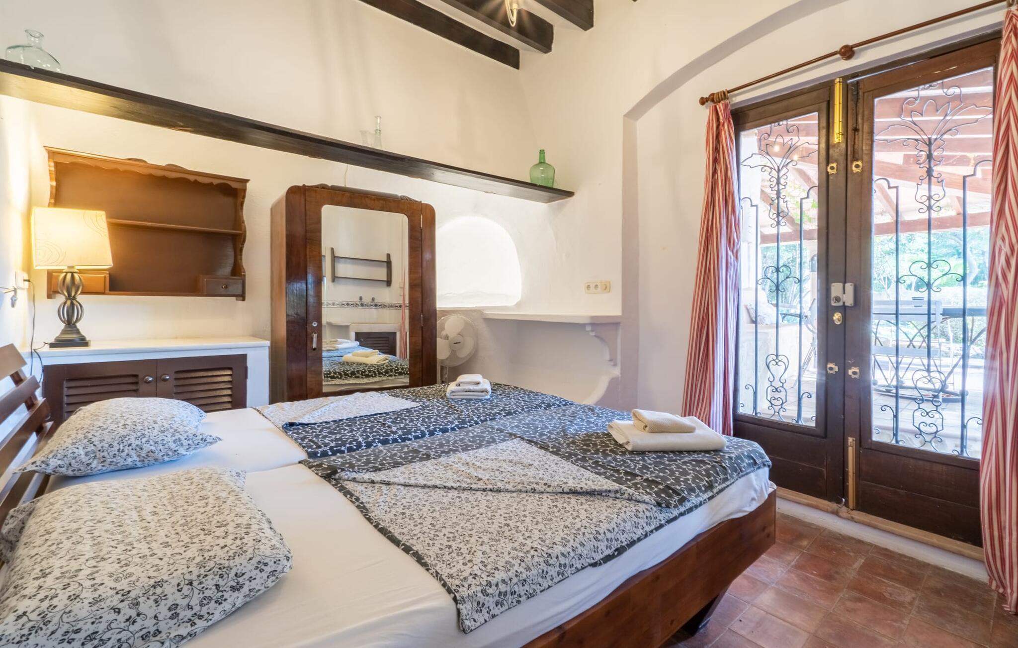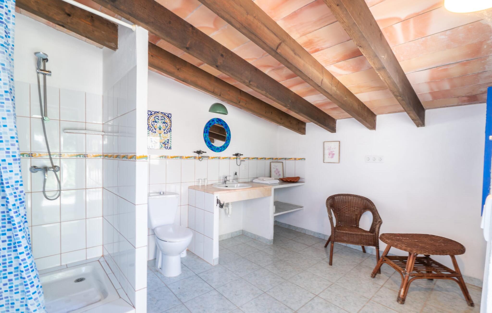 Das Innere des Hauses verfügt über einen sehr großzügigen Wohnraum. Hohe Räume mit Sichtbalken, Terrakottafliesen, antiken Holztüren und zwei Kaminen in Kombination mit vielen charmanten Details schaffen ein antik-mallorquinisches Flair, in dem auch moderne Elemente nicht fehlen. Im Erdgeschoss des Haupthauses befinden sich die gemeinschaftlichen Wohn- und Essbereiche und die Küche sowie ein Doppelschlafzimmer mit eigenem Bad. Im Obergeschoss befindet sich eine Wohneinheit mit zwei verbundenen Doppelschlafzimmern und einem Badezimmer en Suite – ideal für eine kleine Familie. Drei weitere Doppelschlafzimmer, zwei davon mit Balkon, und ein zusätzliches Badezimmer befinden sich ebenfalls auf dieser Etage. Zwei weitere Wohneinheiten für jeweils vier bzw. fünf Urlauber befinden sich im angebauten Flügel und im Gästehaus, letzteres ist sogar mit einer eigenen Küche ausgestattet. Somit kann hier ein Urlaub mit einer großen Reisegruppe verbracht werden, wobei durch die insgesamt vier vorhandenen gemütlichen Wohneinheiten jeder Gast stets individuelle Rückzugsmöglichkeiten hat. Darüber hinaus gibt es einen sehr schönen Gruppenraum mit Holzboden, der sich hervorragend zum Beispiel für Yoga oder Meditation nutzen lässt. Unser Fazit: Dieses riesige Bauernhaus auf Mallorca ist ein Top-Domizil für Gruppenreisen, bei denen neben gemeinschaftlichen Aktivitäten auch Privatsphäre und Rückzug wichtig sind. Dieses charmante große Bauernhaus auf Mallorca liegt in ländlicher Lage auf einem großen, wunderschönen Gebiet zwischen Pollenca (7 km) und Alcúdia (4 km). Besonders familienfreundlich sind die feinen Sandstrände in der Nähe von Pollenca und Alcúdia, zum Beispiel Can Cap de Bou (9 km), mit ihrem flachen Einstieg.