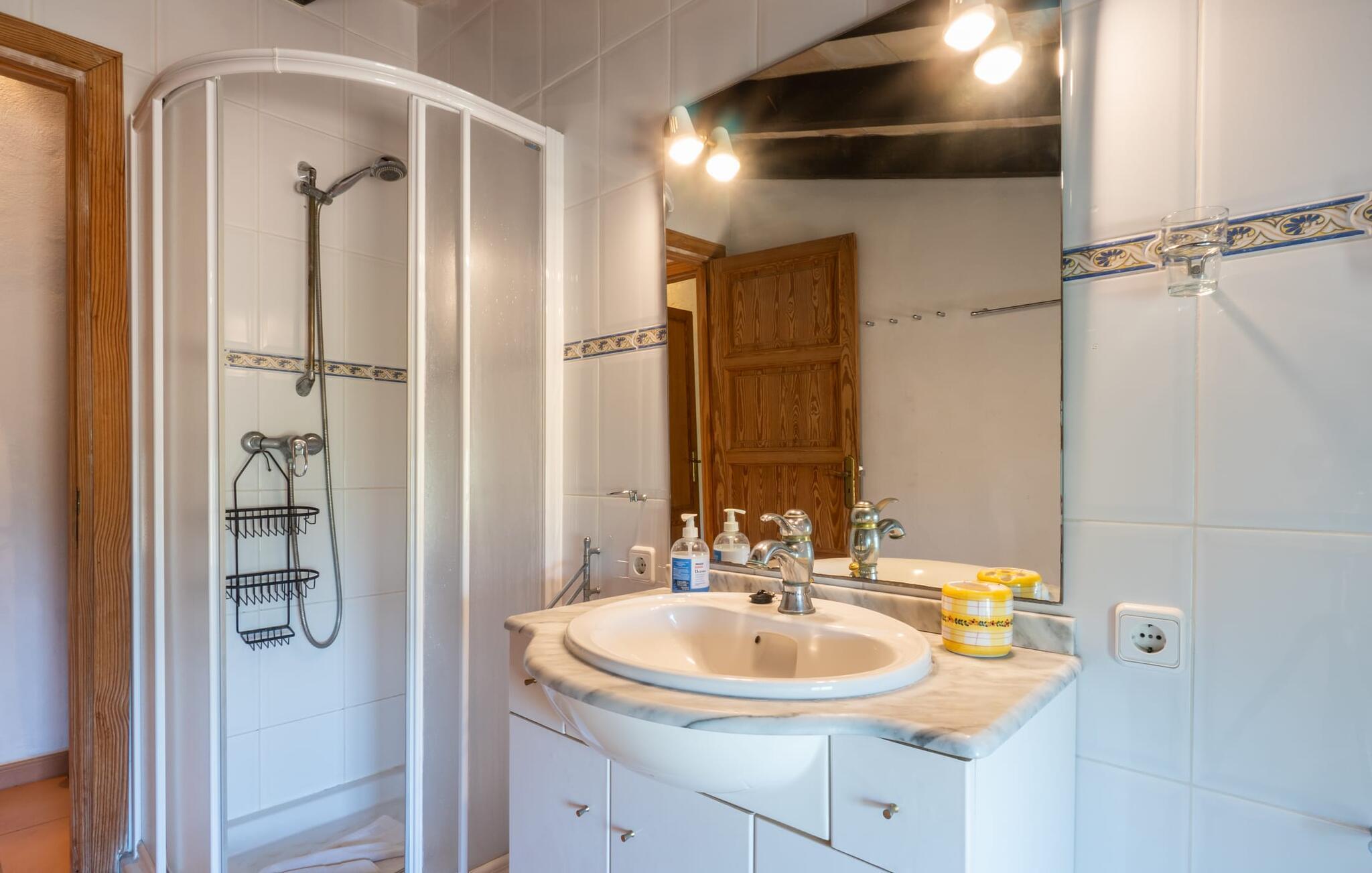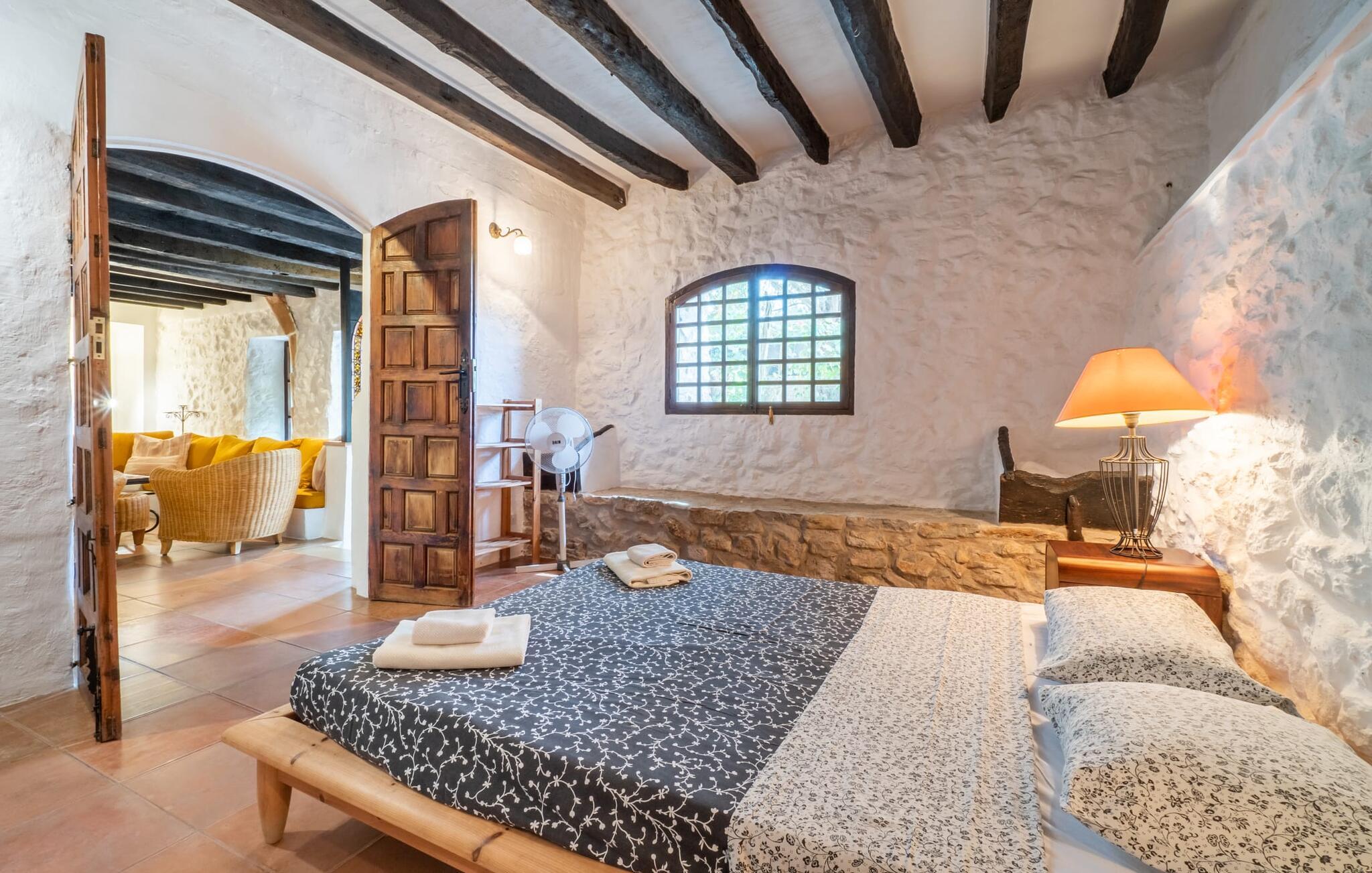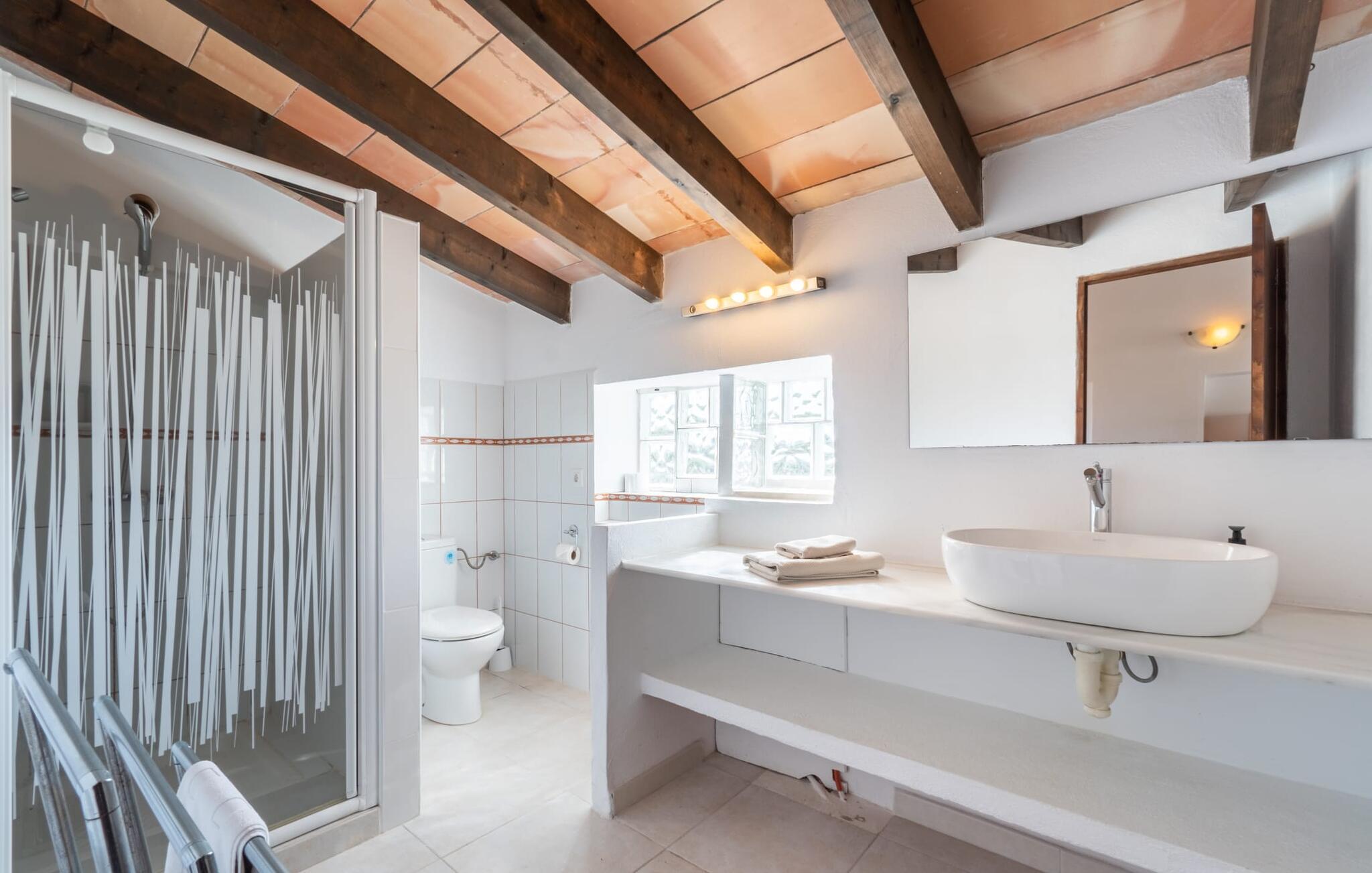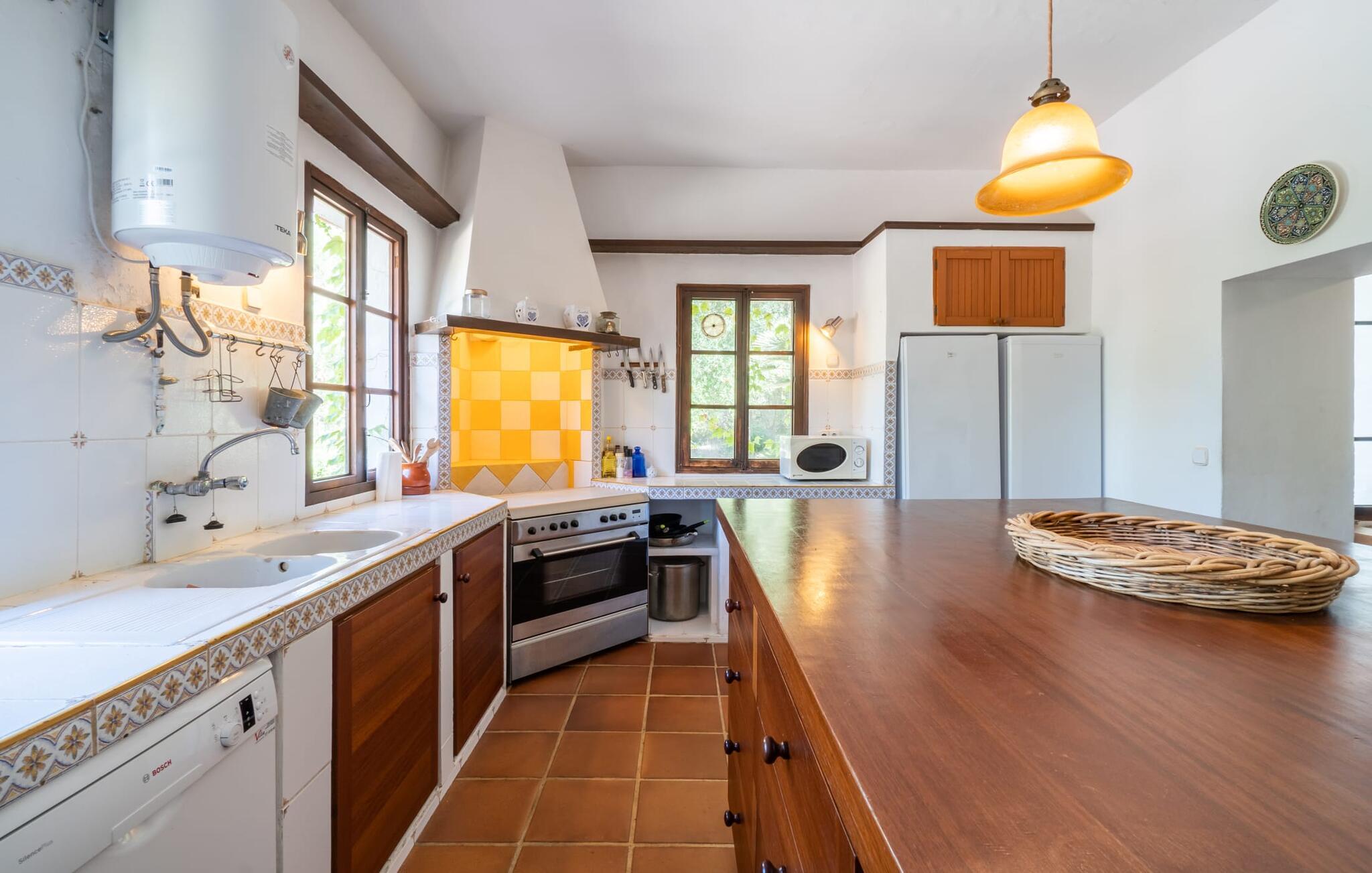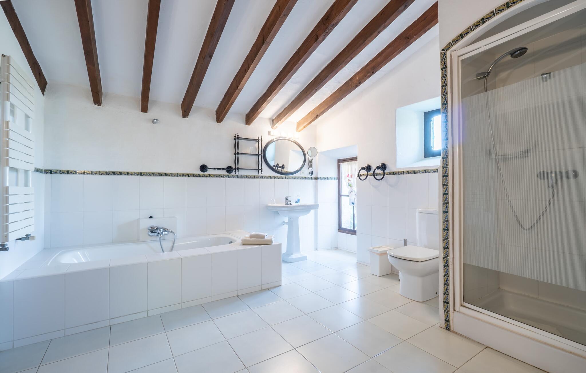 Das Innere des Hauses verfügt über einen sehr großzügigen Wohnraum. Hohe Räume mit Sichtbalken, Terrakottafliesen, antiken Holztüren und zwei Kaminen in Kombination mit vielen charmanten Details schaffen ein antik-mallorquinisches Flair, in dem auch moderne Elemente nicht fehlen. Im Erdgeschoss des Haupthauses befinden sich die gemeinschaftlichen Wohn- und Essbereiche und die Küche sowie ein Doppelschlafzimmer mit eigenem Bad. Im Obergeschoss befindet sich eine Wohneinheit mit zwei verbundenen Doppelschlafzimmern und einem Badezimmer en Suite – ideal für eine kleine Familie. Drei weitere Doppelschlafzimmer, zwei davon mit Balkon, und ein zusätzliches Badezimmer befinden sich ebenfalls auf dieser Etage. Zwei weitere Wohneinheiten für jeweils vier bzw. fünf Urlauber befinden sich im angebauten Flügel und im Gästehaus, letzteres ist sogar mit einer eigenen Küche ausgestattet. Somit kann hier ein Urlaub mit einer großen Reisegruppe verbracht werden, wobei durch die insgesamt vier vorhandenen gemütlichen Wohneinheiten jeder Gast stets individuelle Rückzugsmöglichkeiten hat. Darüber hinaus gibt es einen sehr schönen Gruppenraum mit Holzboden, der sich hervorragend zum Beispiel für Yoga oder Meditation nutzen lässt. Unser Fazit: Dieses riesige Bauernhaus auf Mallorca ist ein Top-Domizil für Gruppenreisen, bei denen neben gemeinschaftlichen Aktivitäten auch Privatsphäre und Rückzug wichtig sind. Dieses charmante große Bauernhaus auf Mallorca liegt in ländlicher Lage auf einem großen, wunderschönen Gebiet zwischen Pollenca (7 km) und Alcúdia (4 km). Besonders familienfreundlich sind die feinen Sandstrände in der Nähe von Pollenca und Alcúdia, zum Beispiel Can Cap de Bou (9 km), mit ihrem flachen Einstieg.