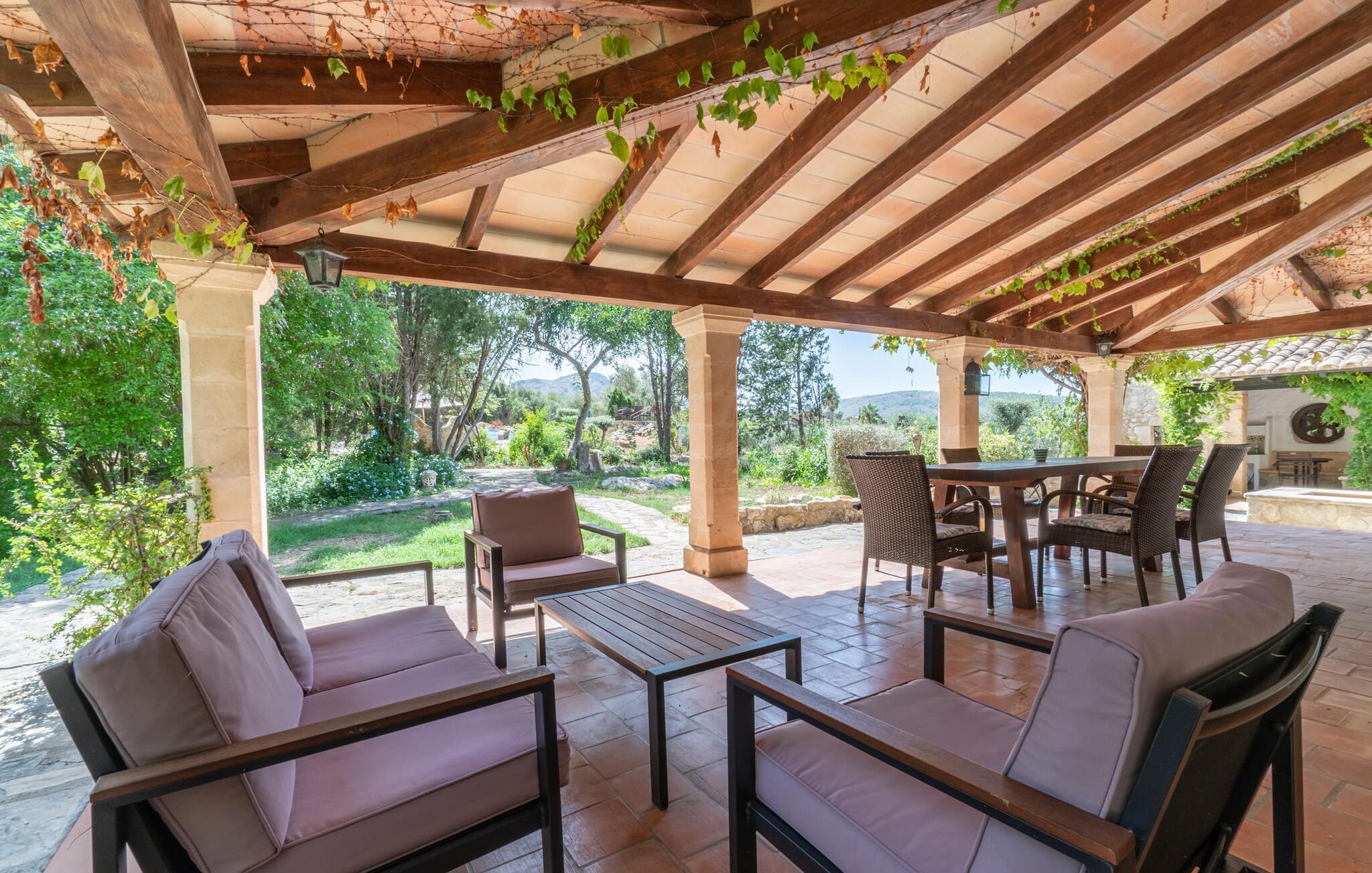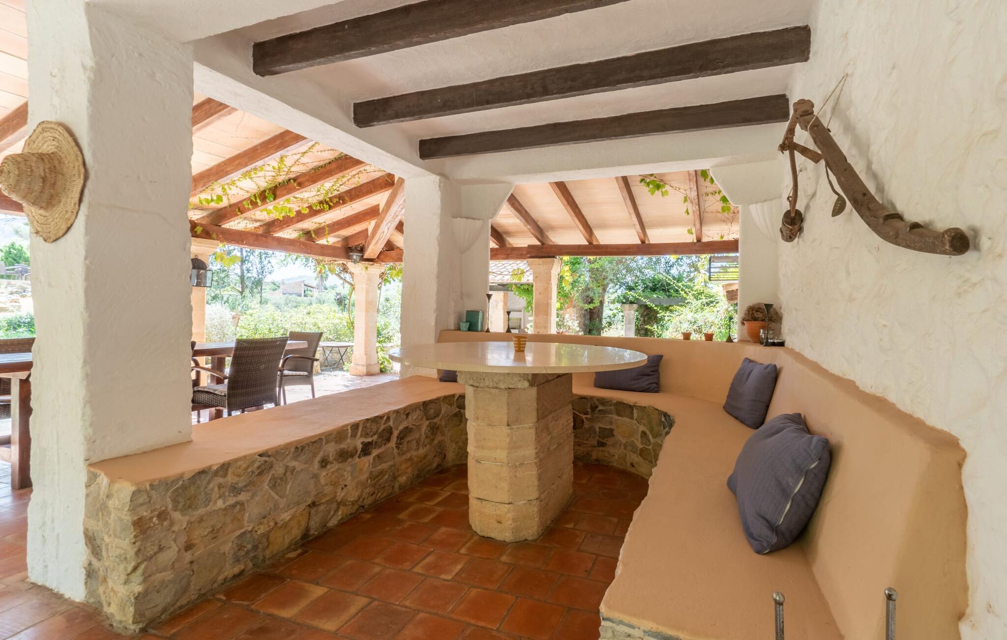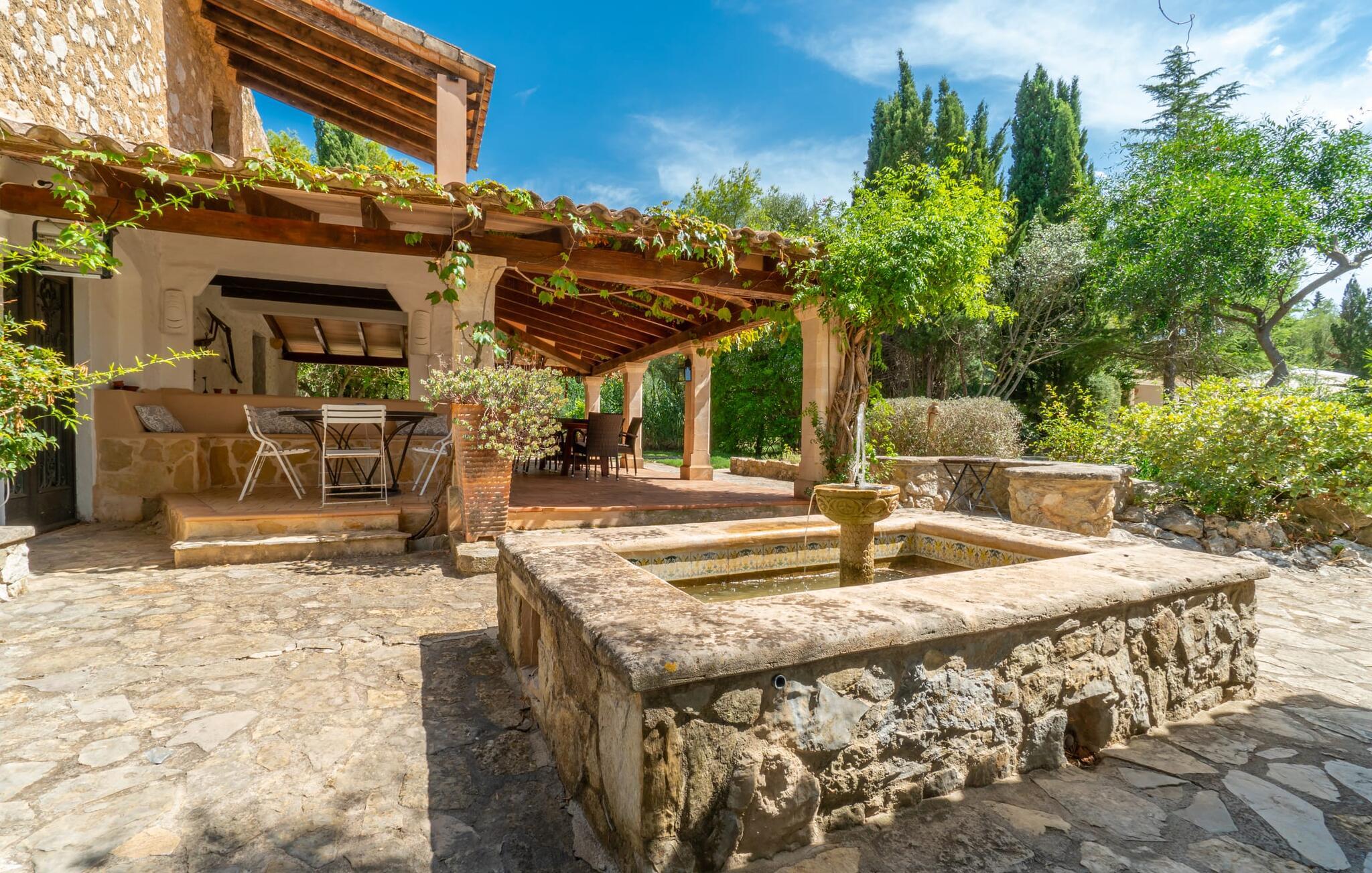 Das über 300 Jahre alte „Ca Na Siona Històric“ liegt auf einem sehr weitläufigen Grundstück, das aus einem Garten sowie einem angrenzenden Naturgrundstück besteht. Die vielfältige mediterrane Vegetation, darunter auch alte Bäume, bildet einen wunderschönen Rahmen für die liebevoll angelegten Bereiche, in denen Sie Zeit im Freien verbringen können. Direkt neben dem Ferienhaus befindet sich die große überdachte Terrasse, auf der Sie eine einladende Auswahl an Sitzgelegenheiten auf gemauerten Bänken, einer Lounge und am Esstisch finden. Von hier aus führt ein kleiner Weg zum großen Pool, der sehr ästhetisch in die Landschaft integriert wurde. Von hier aus genießen Sie einen sensationellen Blick auf das Tramuntana-Gebirge. Das angrenzende Poolhaus mit weiteren Sitzgelegenheiten lädt zum Entspannen ein. Wer die Aussicht noch exklusiver genießen möchte, kann sich auf den erhöhten Außensitzplatz neben dem Pool begeben. Für Fitness und Spaß steht eine Tischtennisplatte zur Verfügung. Das Barcebue-Haus ist bei jedem Wetter ein toller Ort zum Grillen.