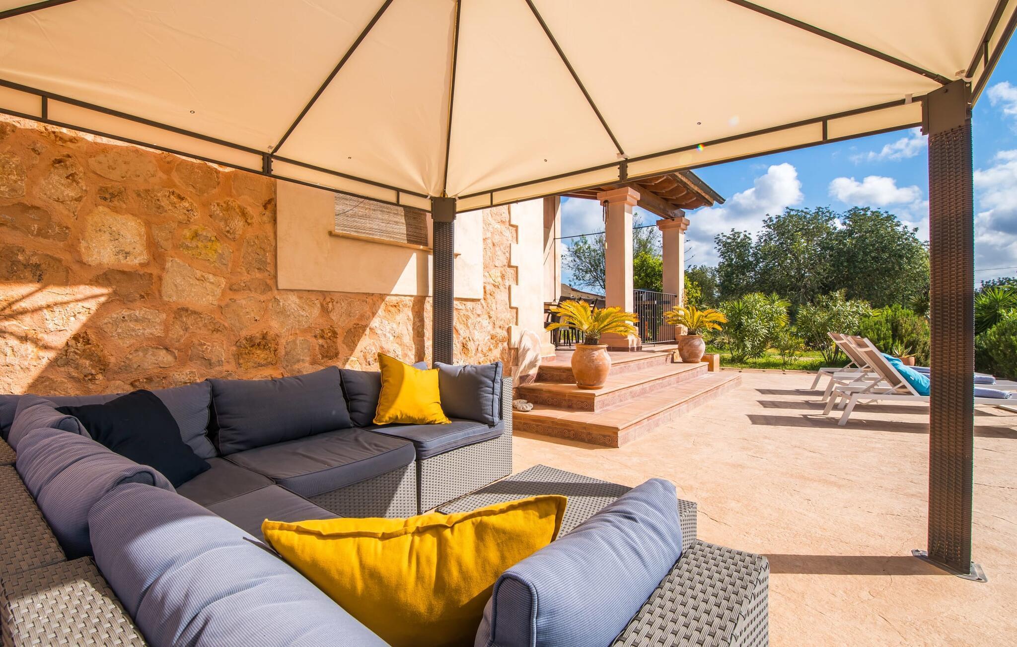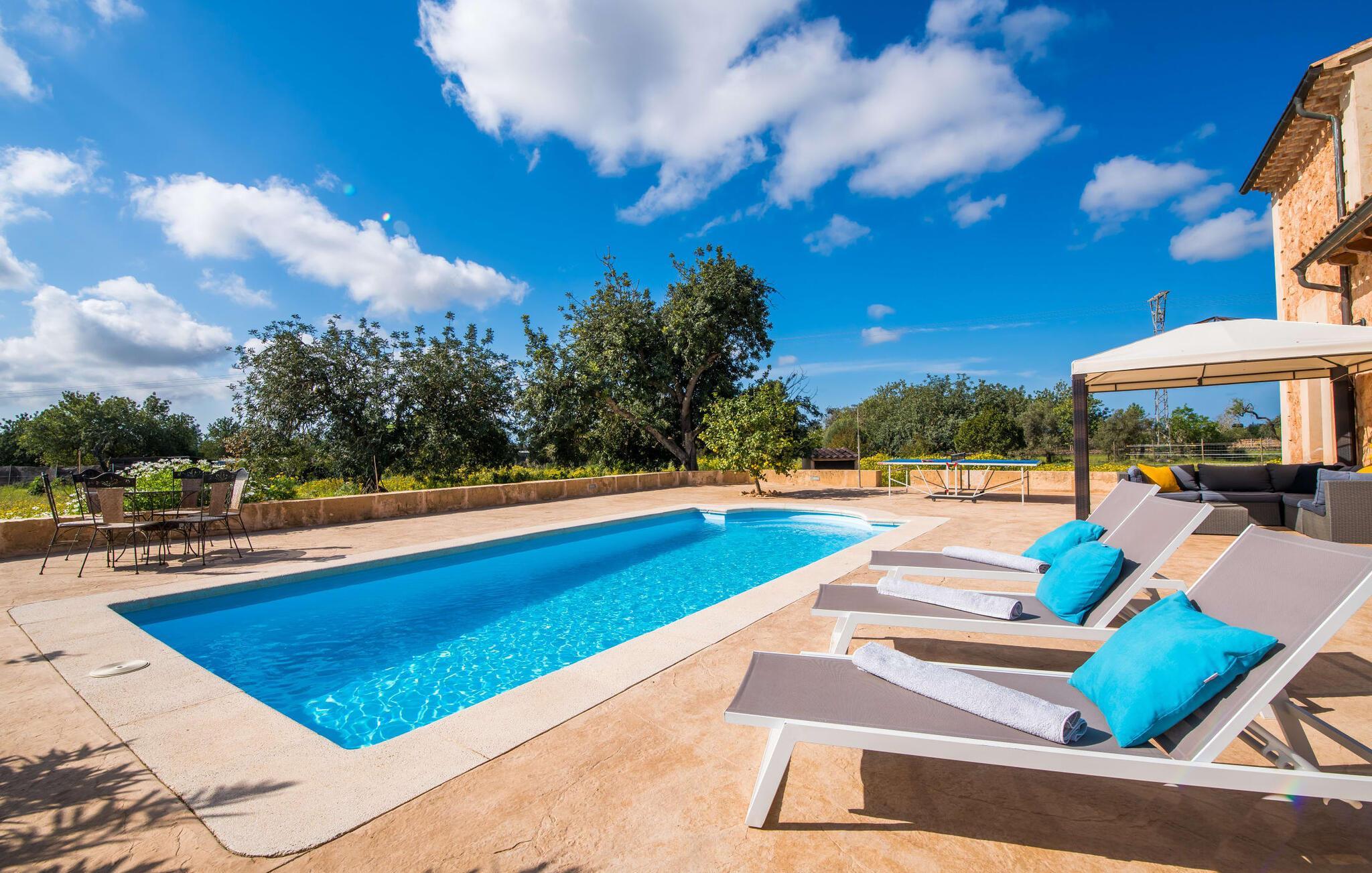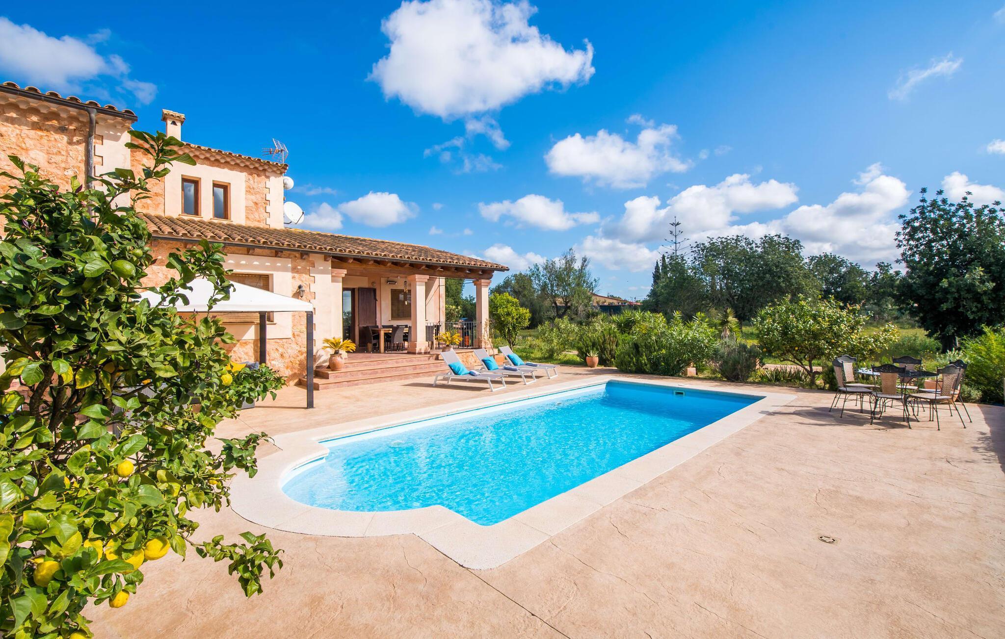 Viel Platz, Ruhe, Natur, genügend Möglichkeiten für aktive Familien und noch viel mehr: Das bietet die Finca „Can Alba de Llucmajor“ für bis zu sechs Personen, ein schönes Ferienhaus im Süden Mallorcas. Die Finca mit Pool liegt auf einem großen, grünen Grundstück in ruhiger Lage ohne direkte Nachbarn. Ihre Finca verfügt über einen sehr gepflegten, großzügigen und teilweise überdachten Terrassenbereich: Hier können Sie entweder gemeinsam am Esstisch frisch gegrillte Speisen genießen, mit einem guten Buch auf dem bequemen Outdoor-Sofa Platz nehmen, den langen und reichlichen Sonnenschein genießen Sonnenliegen am Pool dank Südausrichtung oder spielen Sie eine Partie Tischtennis am hauseigenen Tisch.