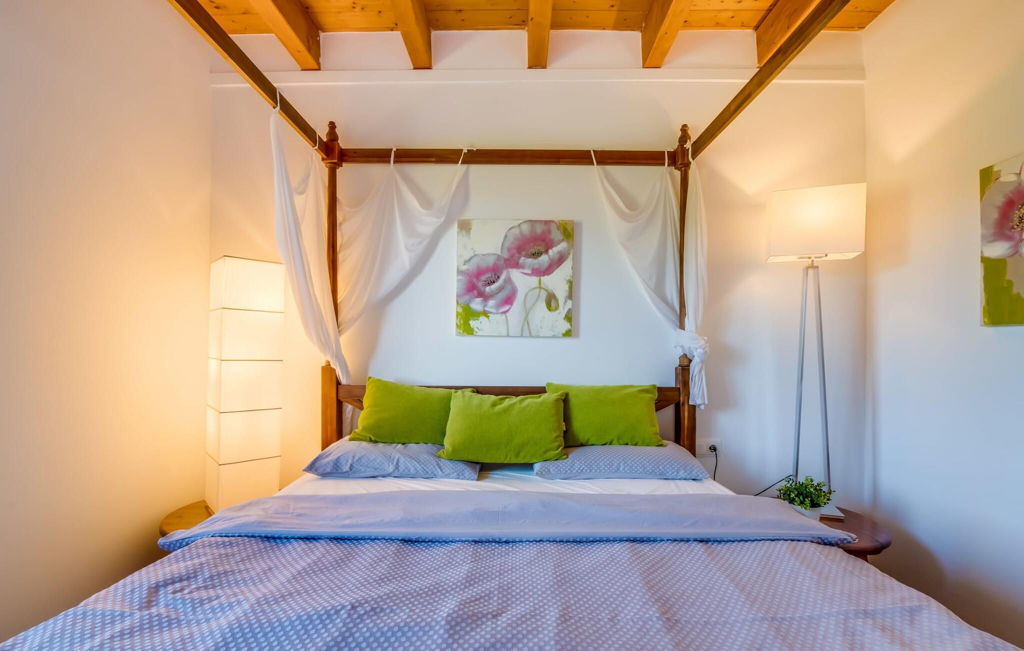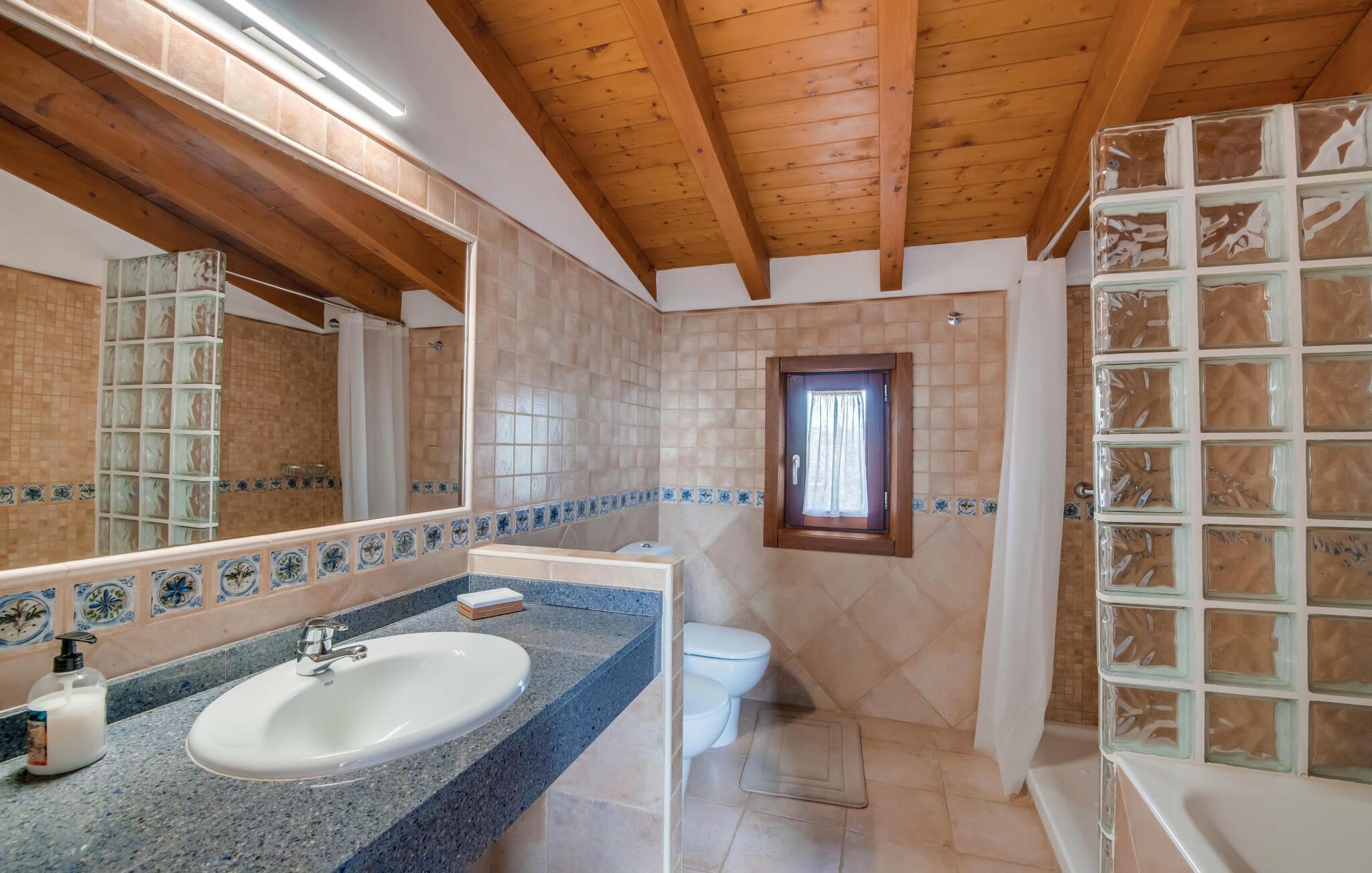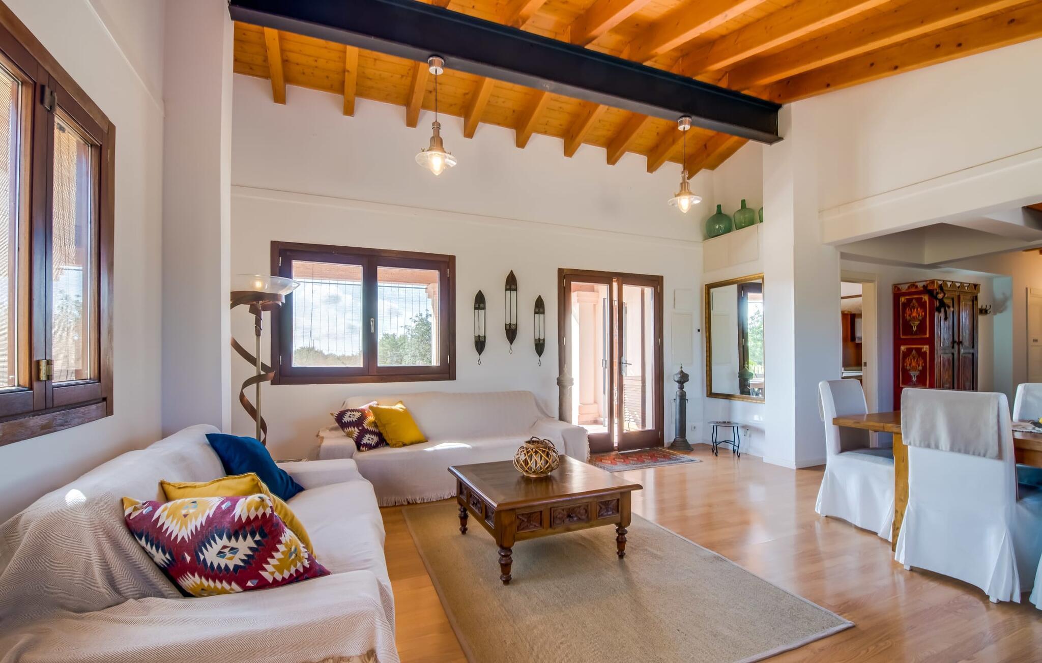 Die Finca empfängt Sie im klassischen mediterranen Stil mit modernem Touch, freundlich und hell. Viele Fenster, Holzdecken und eine geschmackvolle Inneneinrichtung prägen die sehr gepflegte, angenehme Atmosphäre. Auch die Aufteilung lässt keine Wünsche offen: Im Erdgeschoss gibt es nicht nur ein großzügiges, offenes Wohn- und Esszimmer mit Kamin, das ein kuscheliges Flair verbreitet, sondern auch eine große Küche mit einem weiteren Esstisch, an dem man gemütlich zusammensitzen kann wunderbares Frühstück. Die drei Doppelzimmer im Haus versprechen erholsame Nächte, eines im Erdgeschoss und zwei im Obergeschoss. Je ein modernes Badezimmer unten und oben runden den Wohnkomfort Ihrer Traumfinca auf Mallorca ab. Mallorquinisches Landleben gepaart mit viel Komfort drinnen und draußen: Das ist die Finca „Can Alba de Llucmajor“ im sonnigen Süden der Insel. Trotz der ruhigen Lage auf einem riesigen Grundstück ist Ihr Ferienhaus nur 4 km von Llucmajor entfernt. Das charmante Dorf mit vielen Einkaufsmöglichkeiten, Restaurants und Cafés ist bequem über die Landstraße zu erreichen, die je nach Windrichtung akustisch zu hören ist. Strände wie S'Arenal oder Racó de S'Arena sind nur 16 bzw. 18 km entfernt.