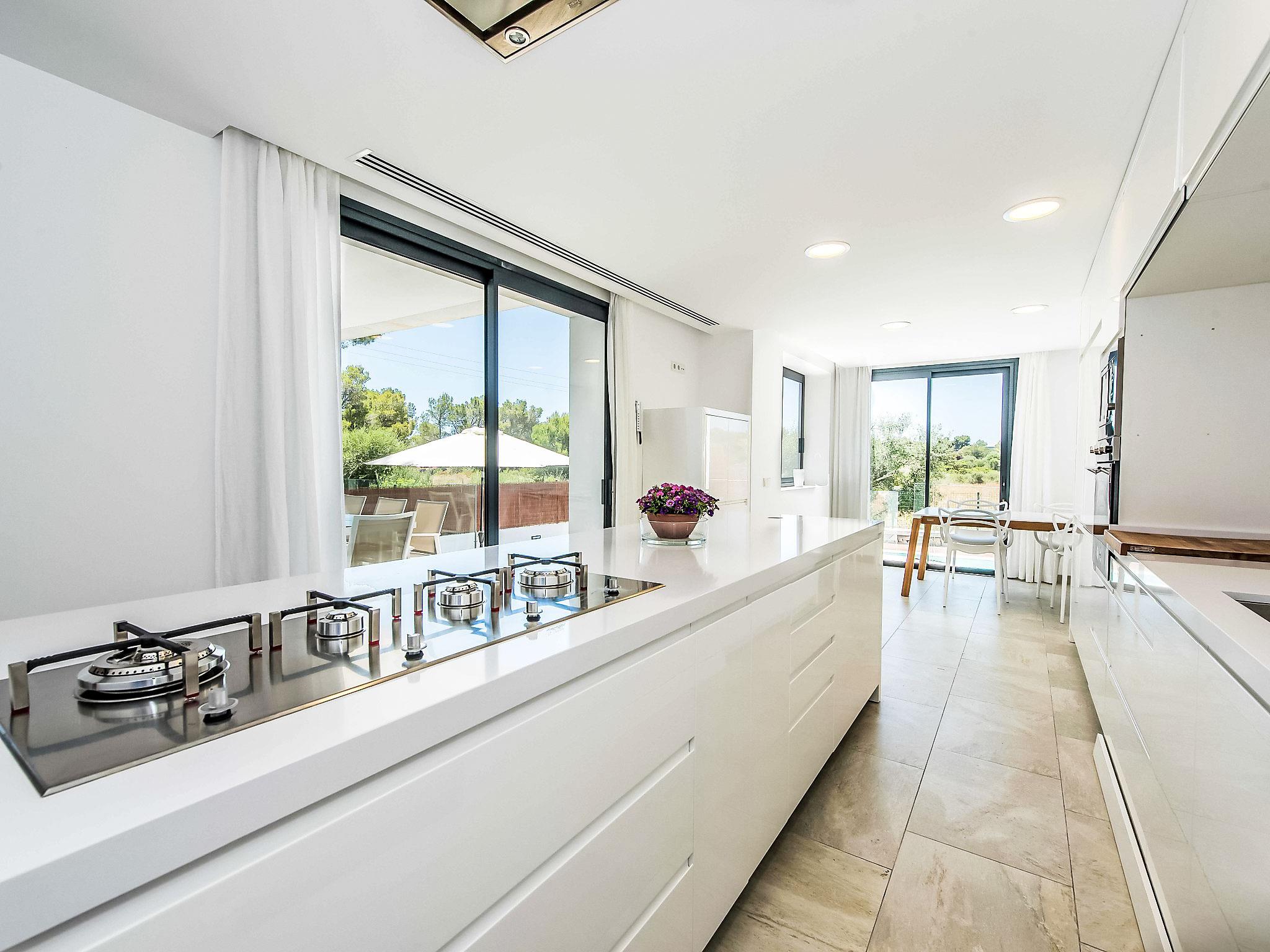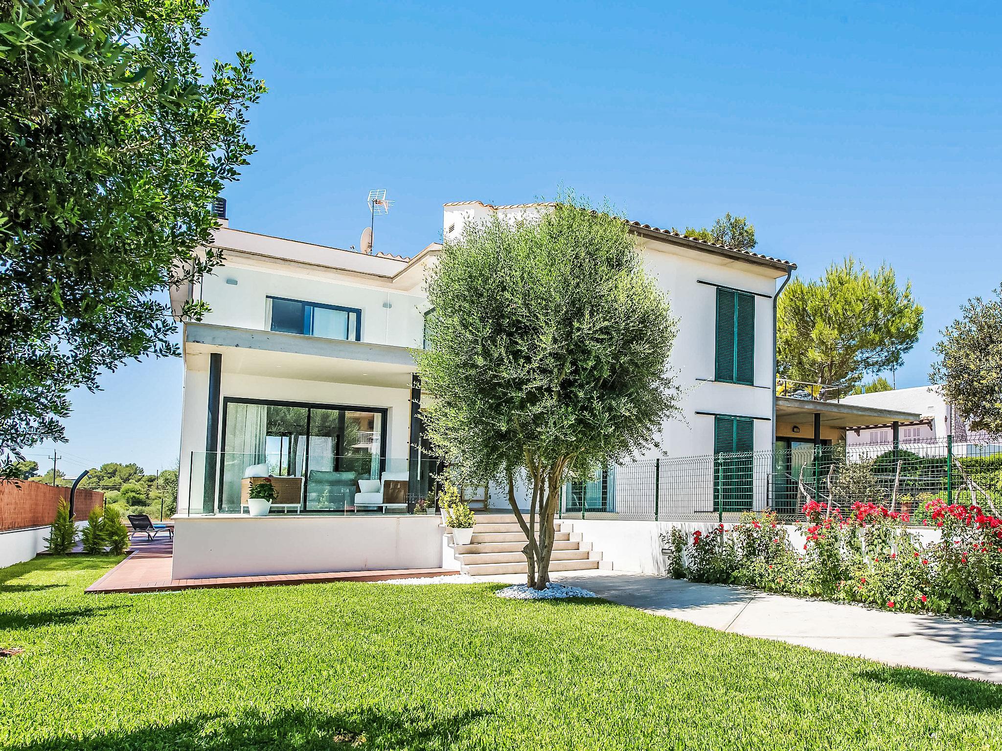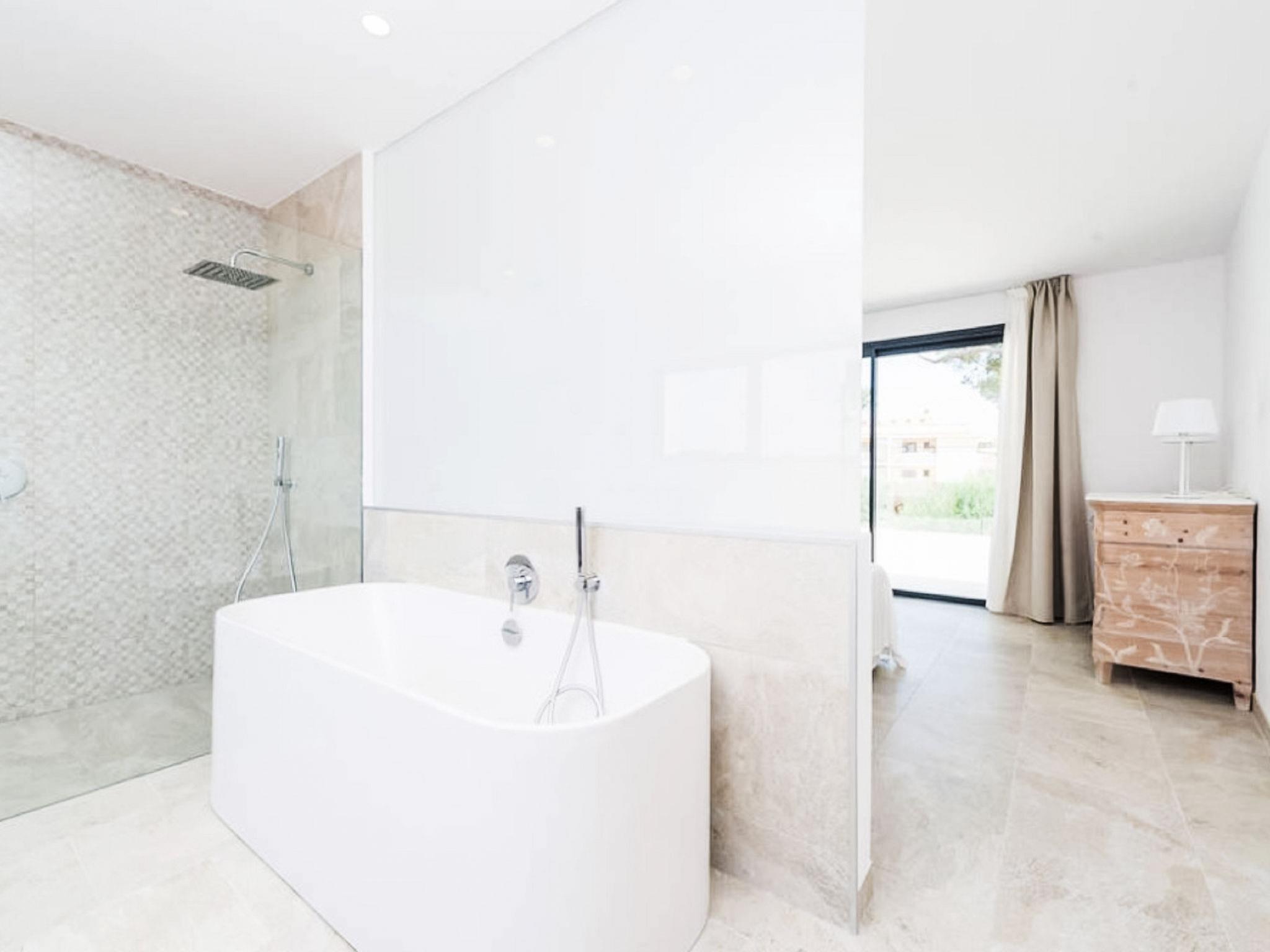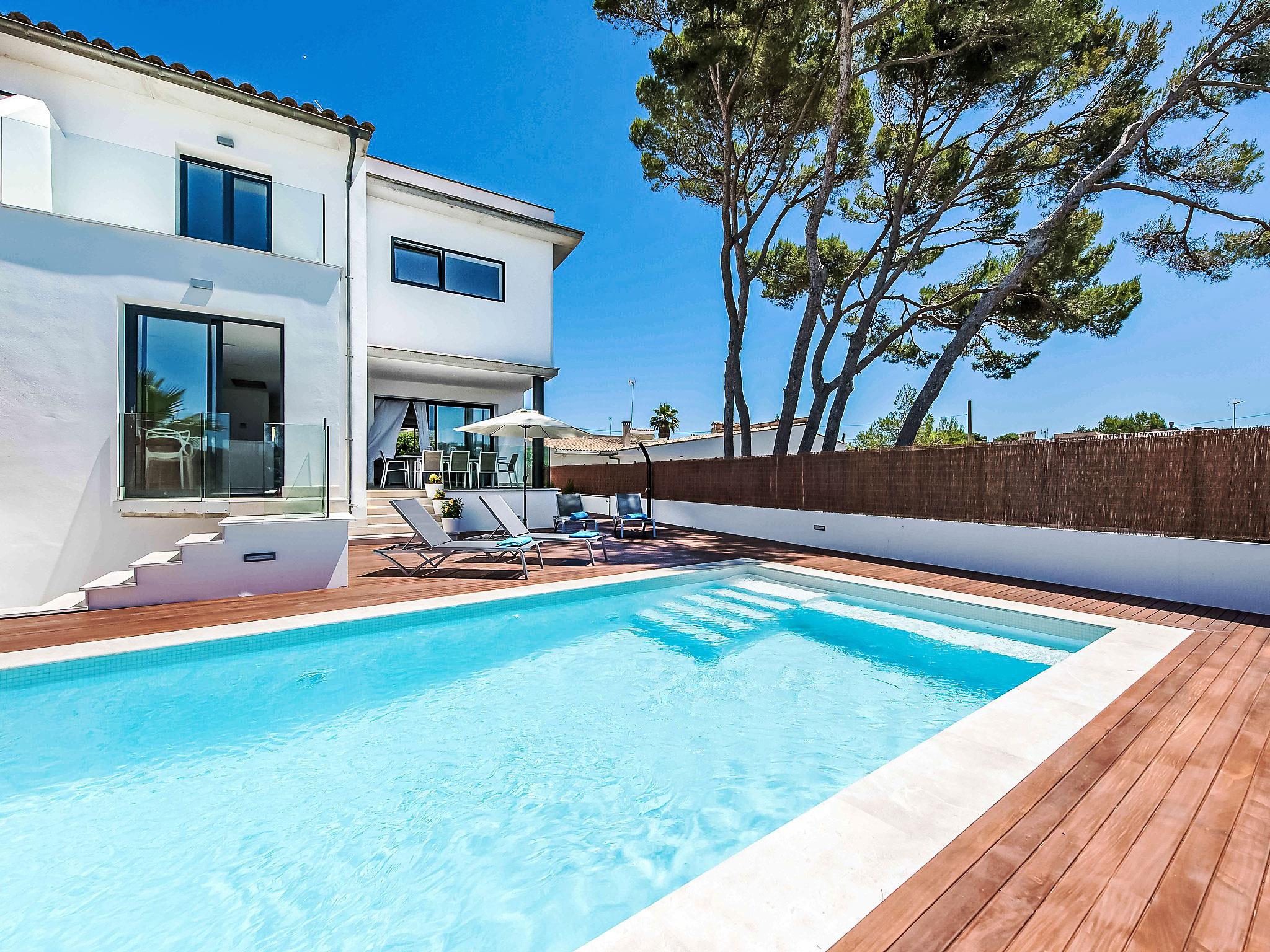 Can Picafort: Very large, modern, comfortable house "Marianne", 2 storeys, built in 2016. In the resort 250 m from the centre of Son Baulo, in a quiet position residential area (villas), 450 m from the sea, 450 m from the beach. Private: garden with lawn, swimming pool (8 x 4 m, seasonal availability: 01.Apr. - 31.Oct.) with salt-electrolysis pool-cleaning system. Outdoor shower, terrace, garden furniture, barbecue. In the house: central heating system, air conditioning, washing machine. Parking at the house. Shop 400 m, supermarket 800 m, restaurant 400 m, bus stop 1.6 km, sandy beach 400 m. Golf course (18 hole) 6 km, riding stable 500 m, children's playground 300 m. Nearby attractions: Playa y parque natural Son Real 600 m. Groups of teenagers on request only.