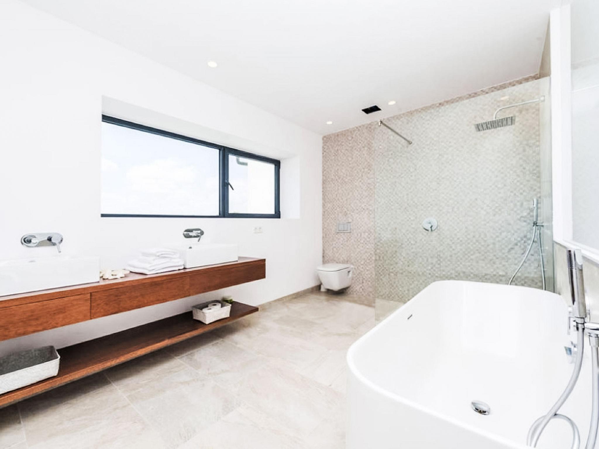 "Marianne", 5-room house 180 m2. Object suitable for 8 adults. Bright, comfortable and tasteful furnishings: living/dining room with satellite TV and air conditioning. Exit to the patio. 1 double bedroom with 2 beds (90 cm, length 200 cm), air conditioning. Large kitchen (oven, dishwasher, 4 ceramic glass hob hotplates, toaster, kettle, microwave, electric coffee machine). Exit to the terrace. Shower/WC. Upper floor: 1 double bedroom with 1 french bed (180 cm, length 200 cm), bath/shower/WC and air conditioning. Exit to the balcony. 2 double bedrooms, each room with 2 beds (90 cm, length 200 cm), air conditioning. Shower/WC. Terrace furniture, balcony furniture, barbecue, deck chairs (8), sitting area. Facilities: washing machine, iron, children's high chair, baby cot for up to 2 year olds, hair dryer. Internet (WiFi, free). Suitable for families. ETV/7167 // Reg. Nr.: ESFCTU00000701100073835300000000000000000000ETV/71673