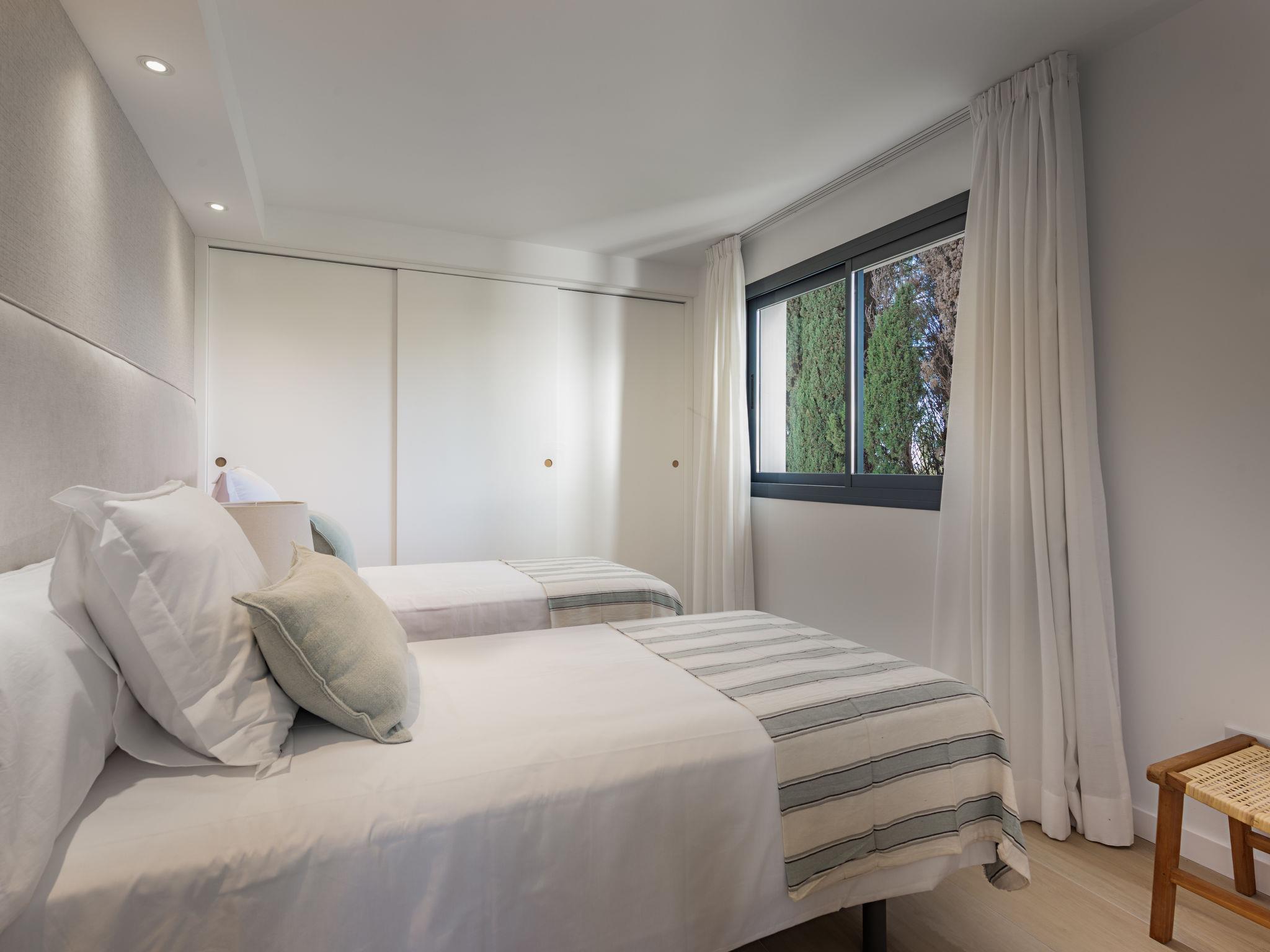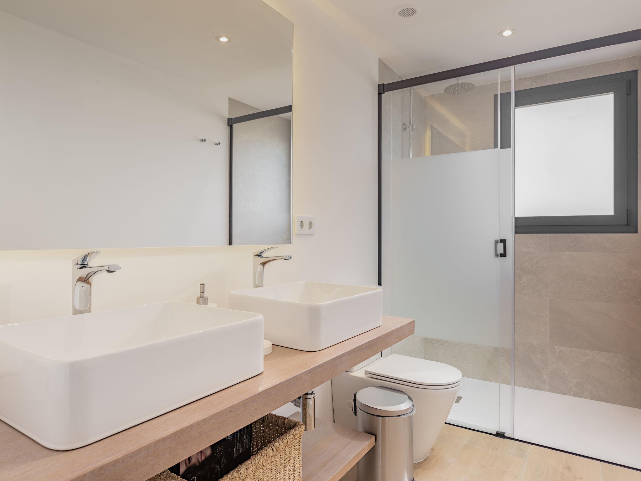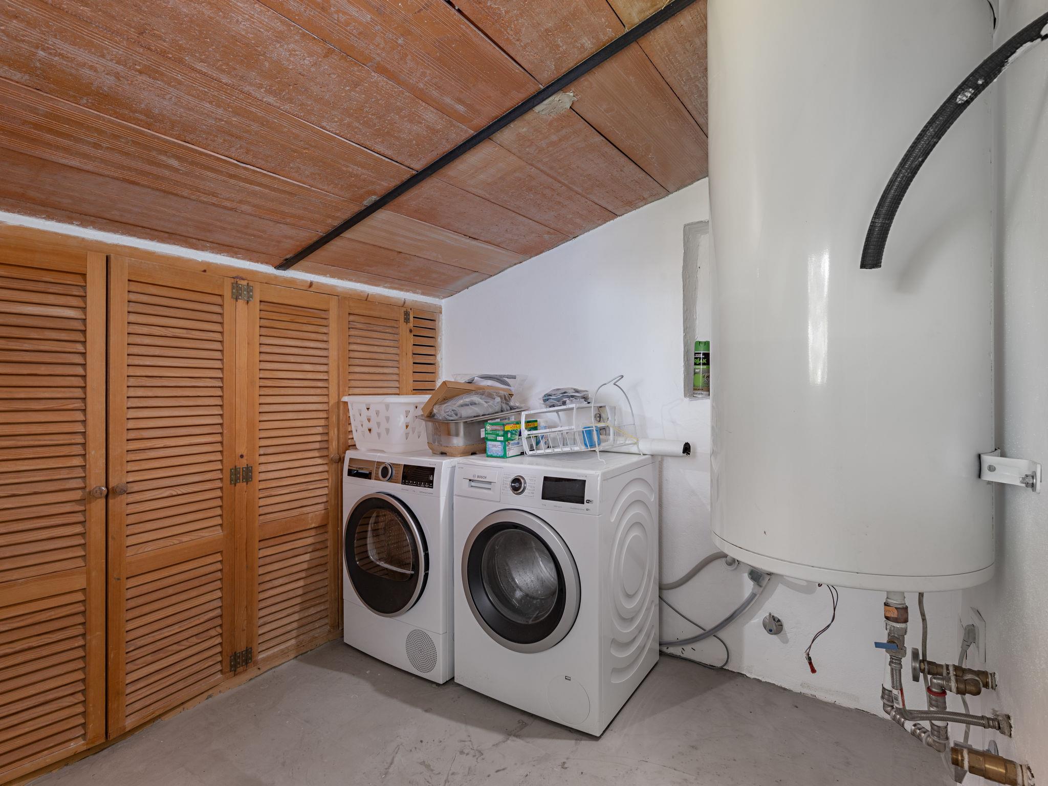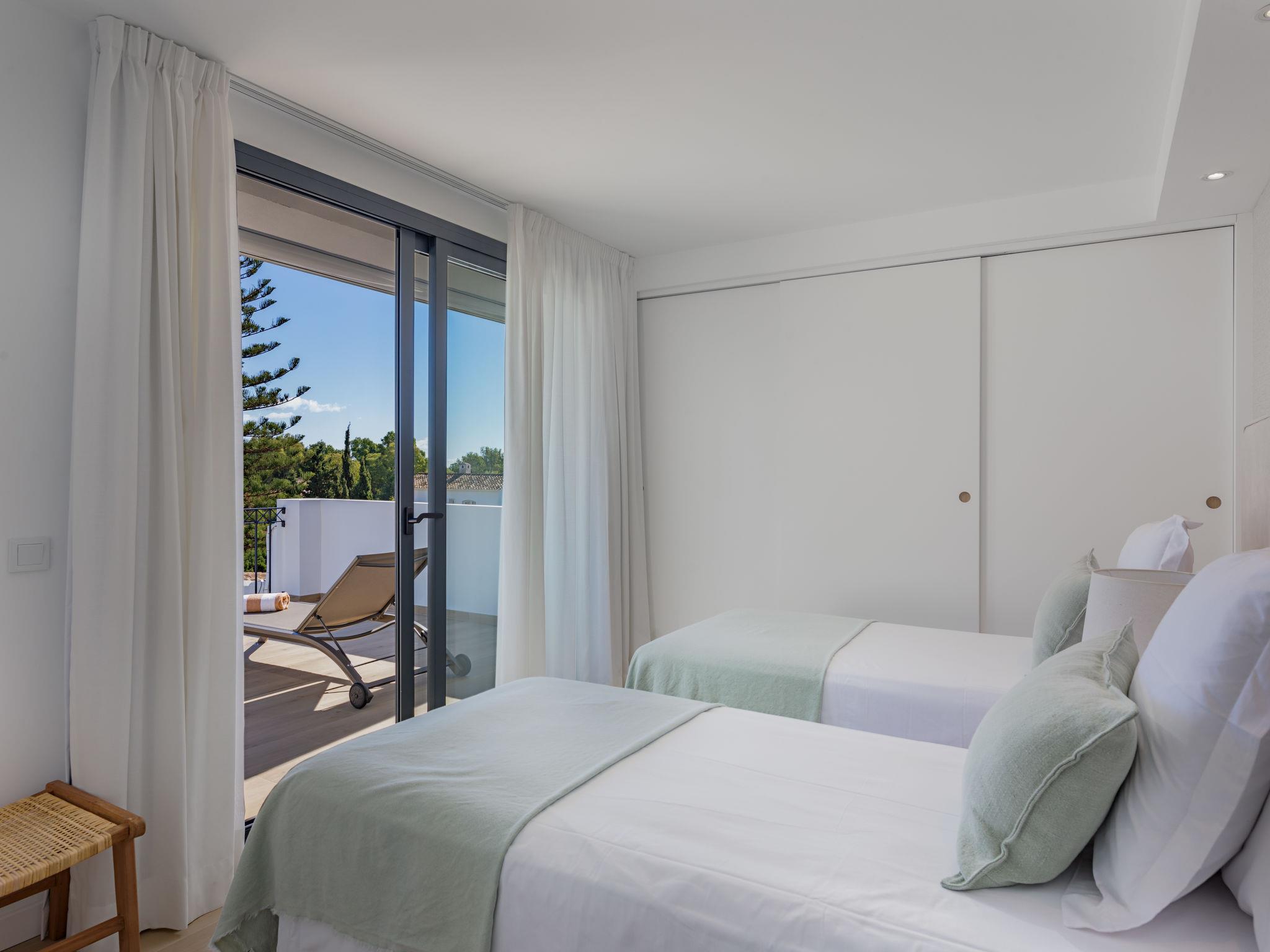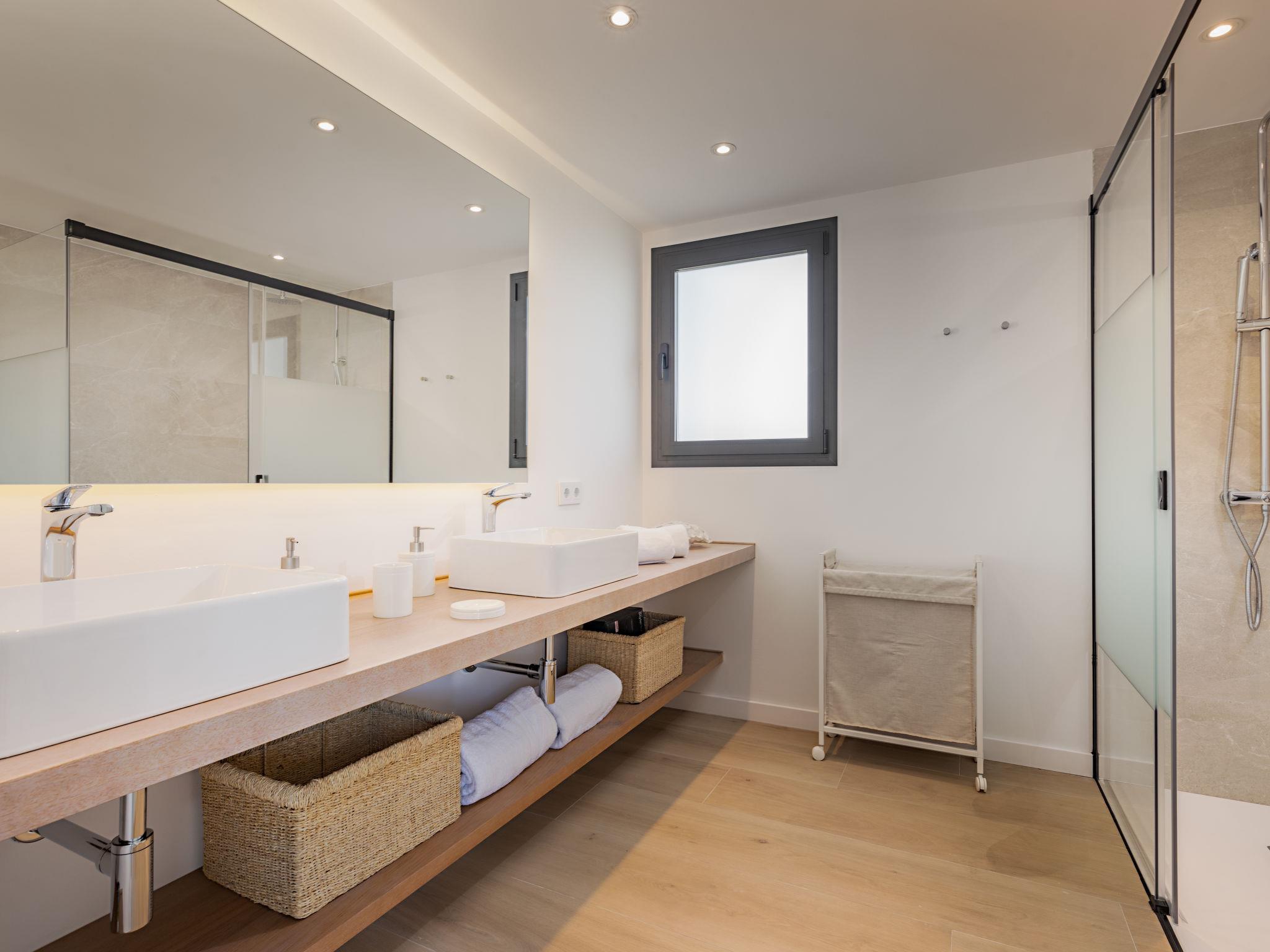 "Casa Bonita", 4-room villa 180 m2 on 3 levels. Practical furnishings: living/dining room with digital TV, air conditioning, fan and forced-air heating. Exit to the patio, to the swimming pool. Open kitchen (oven, dishwasher, 4 induction hot plates, toaster, kettle, microwave, electric coffee machine, Capsules for coffee machine (Dolce Gusto) extra) with bar. Exit to the terrace. Sep. WC. Upper floor: 1 room with Dressing room with 1 french bed (180 cm, length 200 cm), bath/WC, double hand-basin, digital TV, air conditioning and forced-air heating. Exit to the balcony. 1 room with 2 beds (90 cm, length 200 cm), air conditioning and forced-air heating. Exit to the terrace. 1 room with 2 beds (90 cm, length 200 cm), air conditioning and forced-air heating. Shower/WC, double hand-basin. 2 balconies, 2 terraces. Terrace furniture, barbecue, deck chairs (6), covered balcony. View of the swimming pool and the garden. Facilities: washing machine, dryer, iron, children's high chair, baby cot, hair dryer. Internet (WiFi, free). Please note: non-smoking house. Maximum 1 pet/ dog allowed. TV only ES. Smoke alarm, fire extinguisher. VUT/MA/90460 // Reg. Nr.: ESFCTU0000290370001515740000000000000000VUT/MA/904600