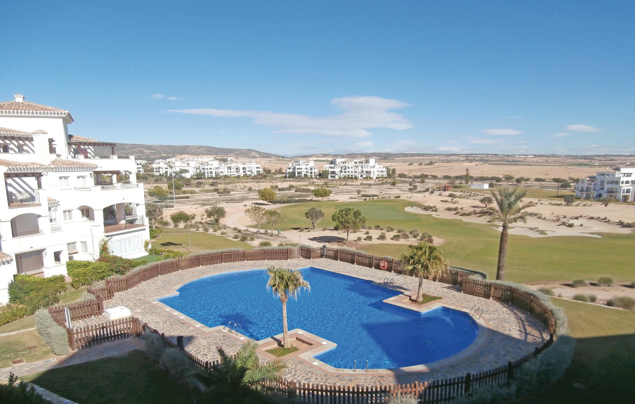 Gemütliches Ferienapartment mit mit Terrasse und Blick auf Abschlag Loch 13. des Golfplatzes. Mit Klimaanlage im Wohn- und den Schlafzimmern. Der Pool befindet sich direkt am Gebäude und nur wenige Meter von den Sportplätzen wie z.B. Paddle, Boccia und Basketball entfernt.
