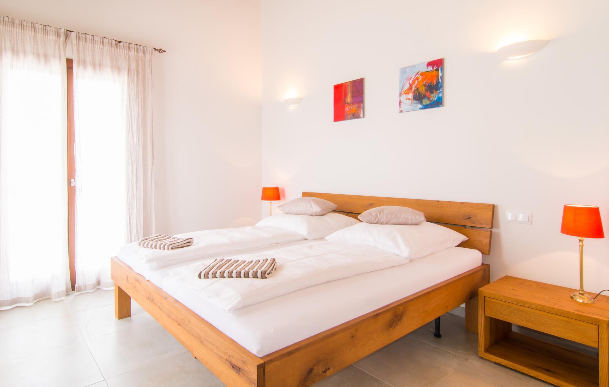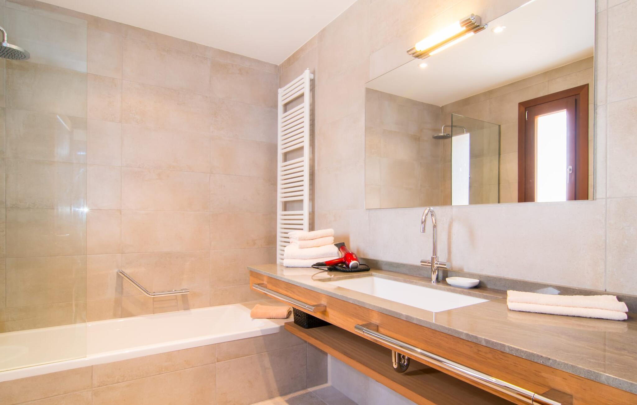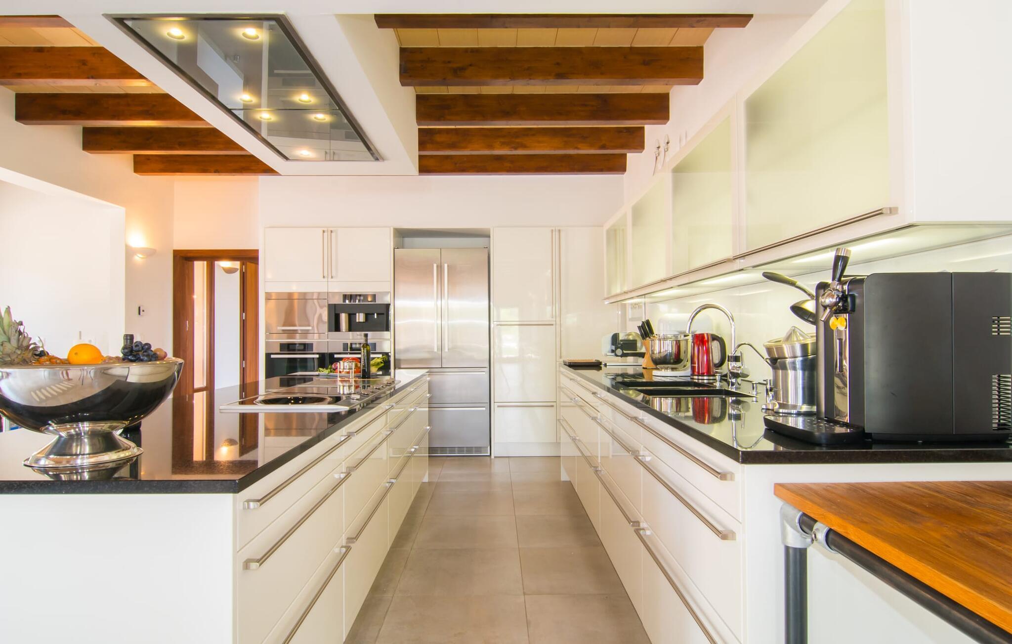 Das Innere des Hauses offenbart viele Schätze. Und es gibt viele. Wie zum Beispiel die professionelle „Hochglanz“-Küche, die aussieht, als wäre sie einer Miele-Werbung entsprungen: weiße Farbe, Arbeitsplatten, auf denen man sich selbst sehen kann, der lange Esstisch, der sich perfekt für Arbeitstreffen eignet, exklusive Accessoires wie ein Miele-Gerät Kaffeemaschine - hier wurde an alles gedacht. Sofas in stilvollem Grau oder warmem Himbeerrot laden zum Ausruhen, einer kurzen Siesta oder zum Fußballschauen im Fernsehen ein. Minimalistische Akzente und Holzelemente geben der schlichten Eleganz den richtigen Rahmen. Vom Eingang nach links gelangen Sie über einen langen Flur in die ersten, rollstuhlgerechten Schlafzimmer, jeweils mit einem hochmodernen Badezimmer (eines davon mit Badewanne), edlen Holzbetten und direktem Zugang zur Terrasse. Farbtupfer setzen die dezente Ausstattung perfekt in Szene. Im Obergeschoss befinden sich fünf weitere Schlafzimmer mit Badezimmern, alle en-suite, und drei mit Zugang zu einer großen Terrasse. Das Haus verfügt über zwei weitere Apartments auf der Poolebene mit jeweils zwei Schlafzimmern und eigenem Bad für acht weitere Personen. Diese Einheiten können zusätzlich gebucht werden – weitere Informationen auf Anfrage. Gegen eine eventuelle Gebühr können Sie in der Villa auch Feierlichkeiten aller Art wie Hochzeiten und andere Veranstaltungen abhalten, diese bedürfen jedoch der vorherigen Zustimmung und Zustimmung des Eigentümers.