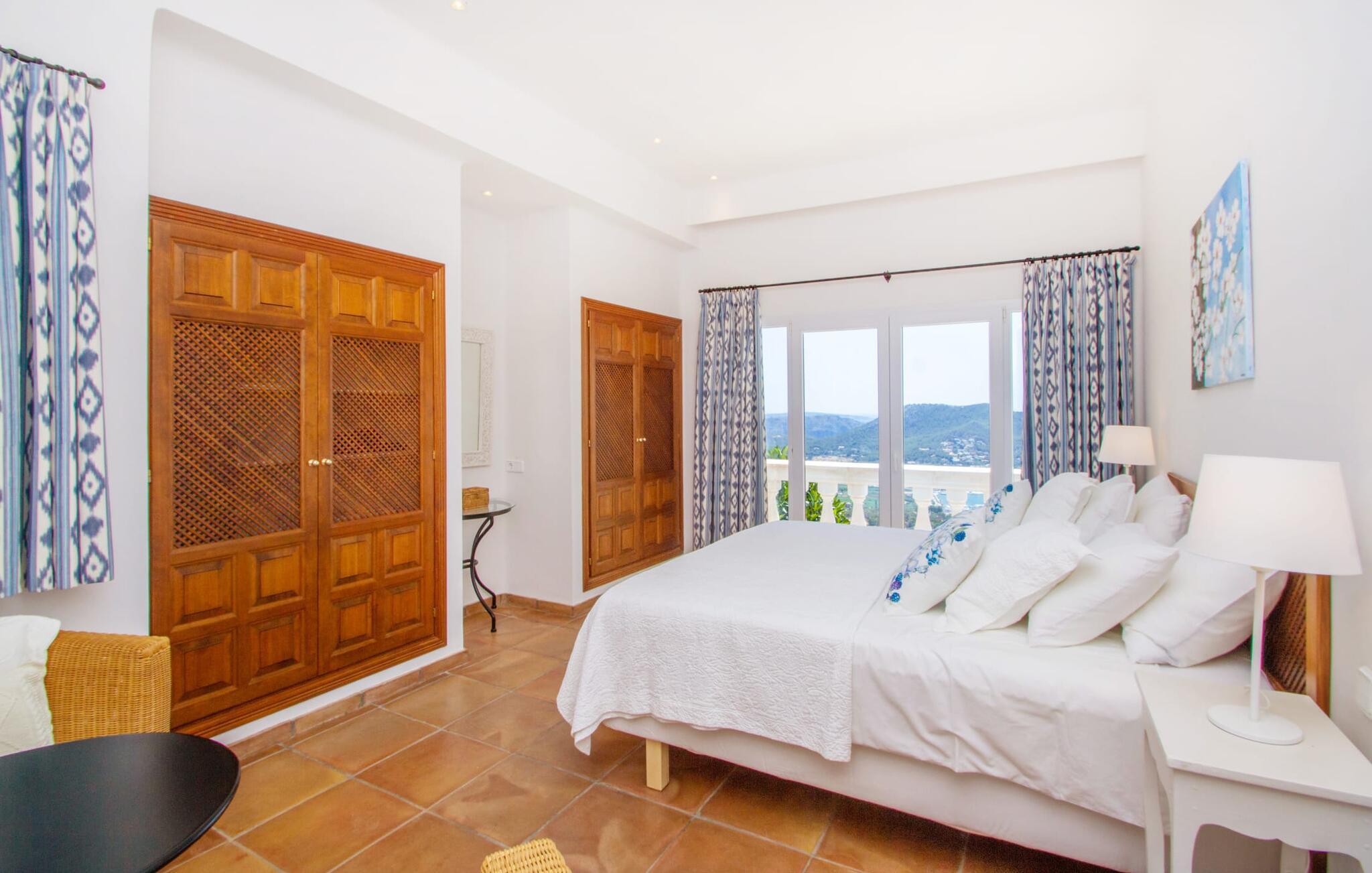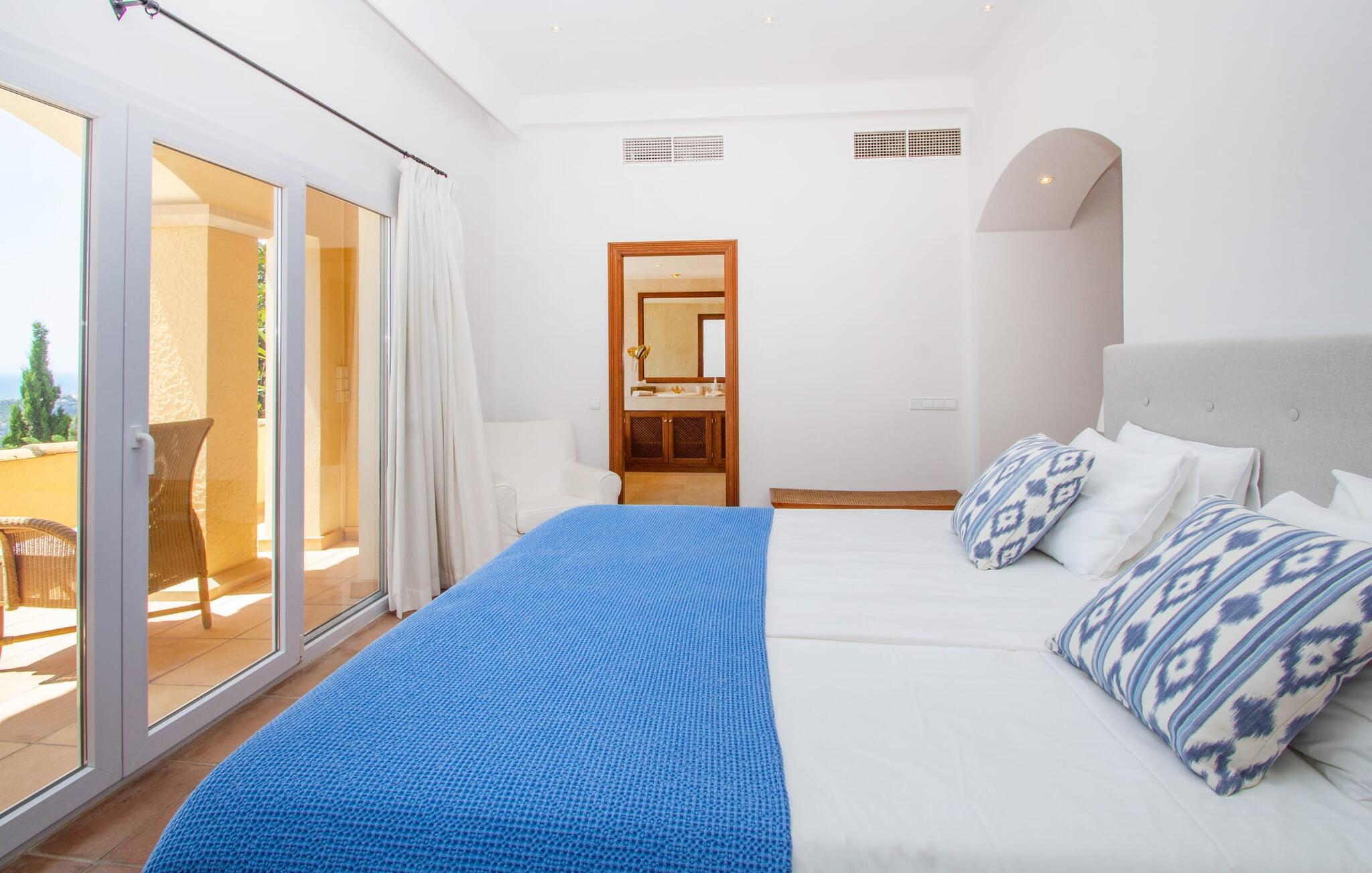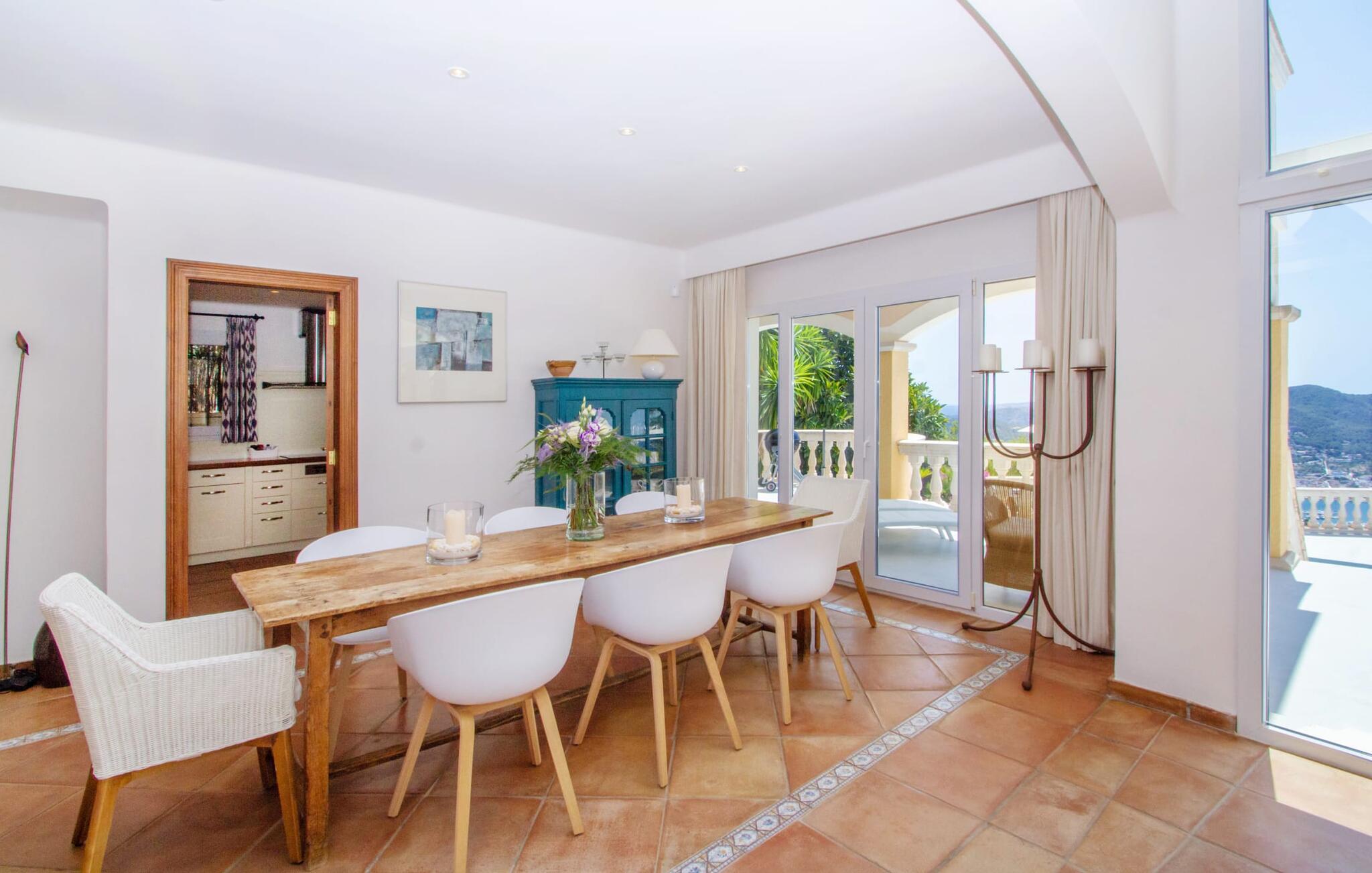 Auf luxuriösen 463 m² Wohnfläche erwartet Sie ein lichtdurchfluteter Wohnbereich mit zahlreichen Terrassenaustrittsmöglichkeiten. Die Einrichtung ist in natürlichen Farben und im modernen Landhausstil gestaltet. Terrakotta-Bodenfliesen, weiße Wände und Einbaustrahler schaffen eine angenehme Atmosphäre, in der Sie sich sofort wohlfühlen werden. Eine voll ausgestattete Küche ist selbstverständlich ebenfalls vorhanden. Die Schlafzimmer liegen alle im Obergeschoss. Sie sind über eine halboffene Galerie erreichbar, die den Blick auf die interessante Architektur dieses einzigartigen Hauses freigibt. Jedes Schlafzimmer ist klimatisiert und bietet Zugang zu einem Balkon. Alle Zimmer blicken auf den Hafen und das Meer. Drei Badezimmer stehen zur Verfügung und vervollständigen Ihren Wohnkomfort, wobei das Hauptschlafzimmer ein kleines Extra in Form eines En-Suite-Badezimmers mit großer Badewanne und goldenen Armaturen erhält. Da Sie die Vorteile einer Fußbodenheizung genießen können, ist das Haus ganzjährig nutzbar. Und natürlich dürfen wir nicht vergessen, dass die „gute Sonne“ neben dem beheizten Pool auch eine Innensauna bietet, ein winterlicher Charme, dem man sich kaum entziehen kann.