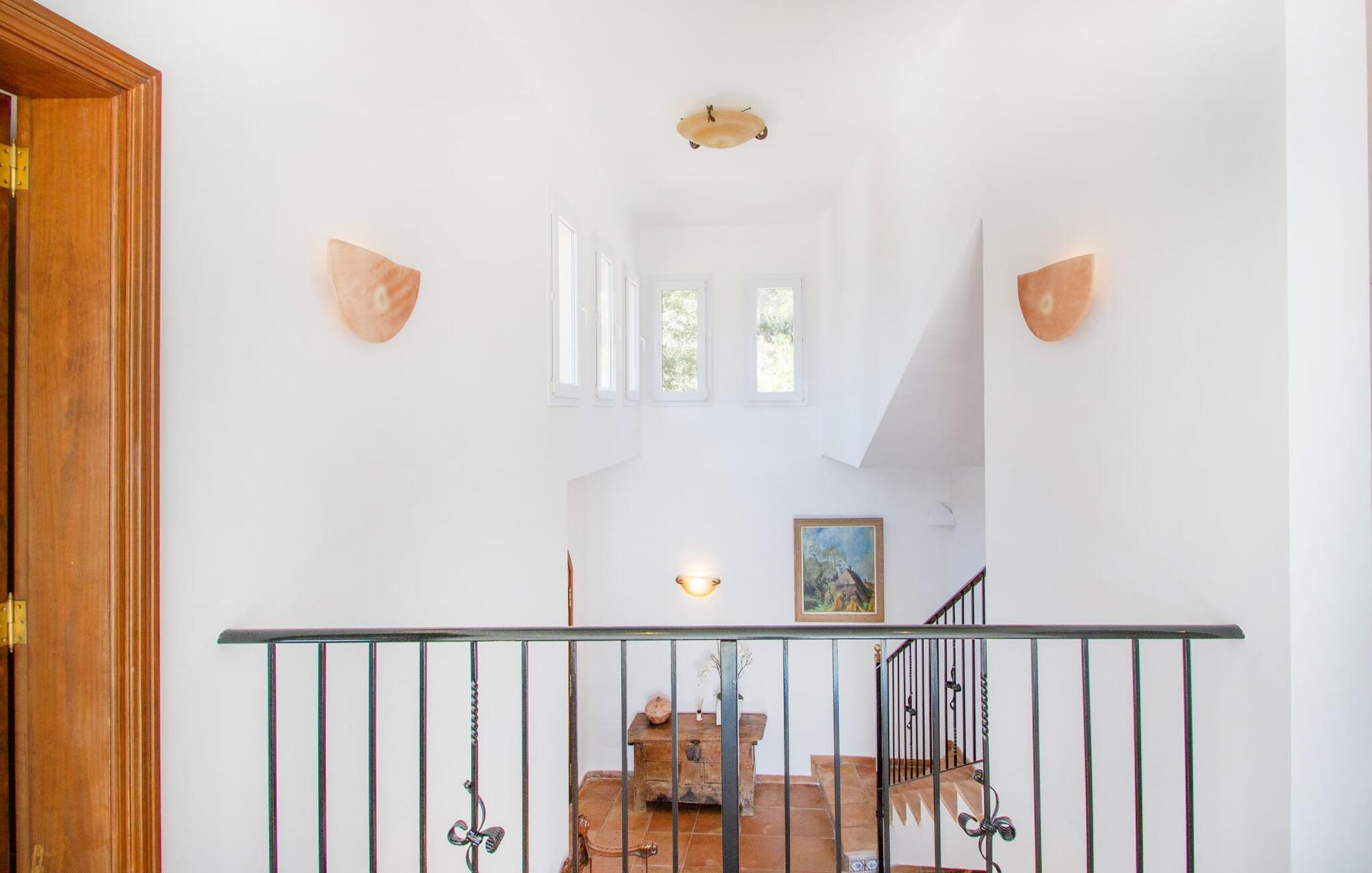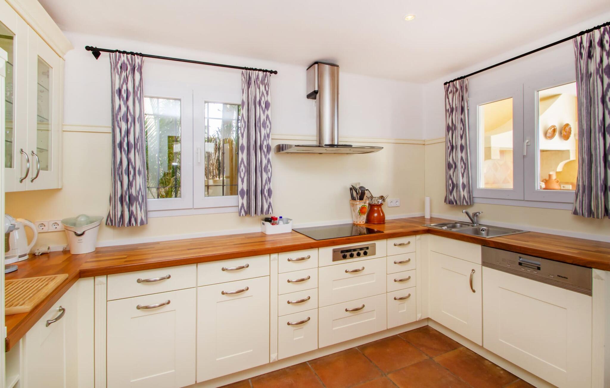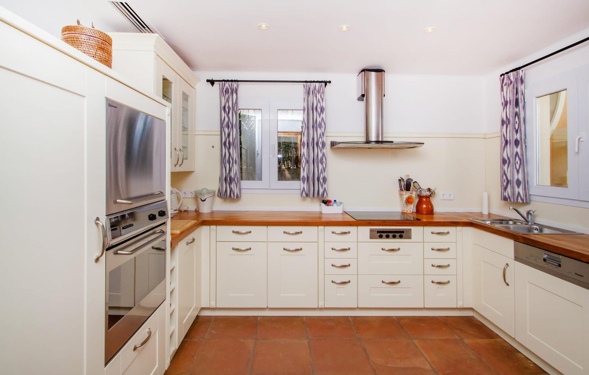 Auf luxuriösen 463 m² Wohnfläche erwartet Sie ein lichtdurchfluteter Wohnbereich mit zahlreichen Terrassenaustrittsmöglichkeiten. Die Einrichtung ist in natürlichen Farben und im modernen Landhausstil gestaltet. Terrakotta-Bodenfliesen, weiße Wände und Einbaustrahler schaffen eine angenehme Atmosphäre, in der Sie sich sofort wohlfühlen werden. Eine voll ausgestattete Küche ist selbstverständlich ebenfalls vorhanden. Die Schlafzimmer liegen alle im Obergeschoss. Sie sind über eine halboffene Galerie erreichbar, die den Blick auf die interessante Architektur dieses einzigartigen Hauses freigibt. Jedes Schlafzimmer ist klimatisiert und bietet Zugang zu einem Balkon. Alle Zimmer blicken auf den Hafen und das Meer. Drei Badezimmer stehen zur Verfügung und vervollständigen Ihren Wohnkomfort, wobei das Hauptschlafzimmer ein kleines Extra in Form eines En-Suite-Badezimmers mit großer Badewanne und goldenen Armaturen erhält. Da Sie die Vorteile einer Fußbodenheizung genießen können, ist das Haus ganzjährig nutzbar. Und natürlich dürfen wir nicht vergessen, dass die „gute Sonne“ neben dem beheizten Pool auch eine Innensauna bietet, ein winterlicher Charme, dem man sich kaum entziehen kann.