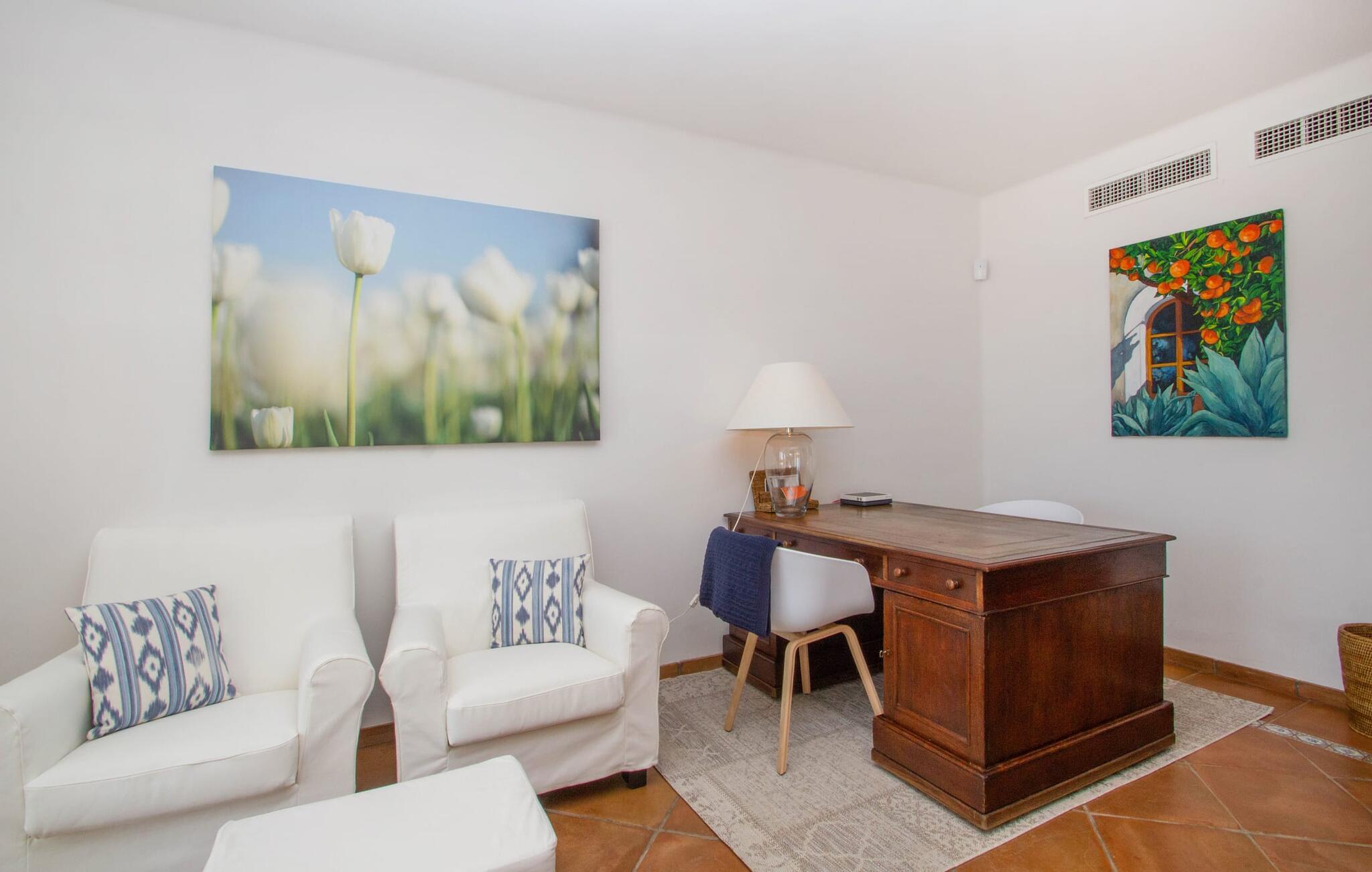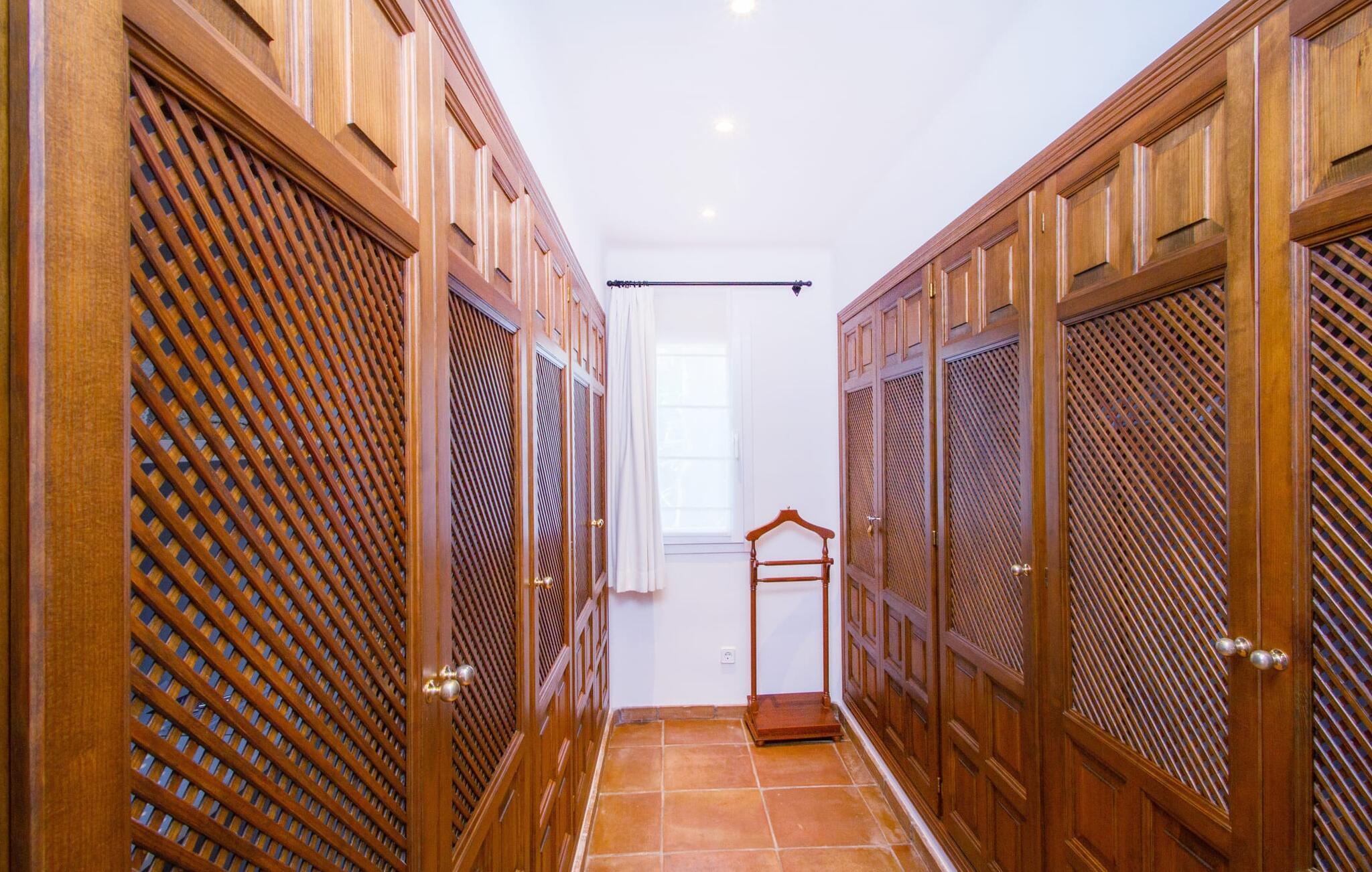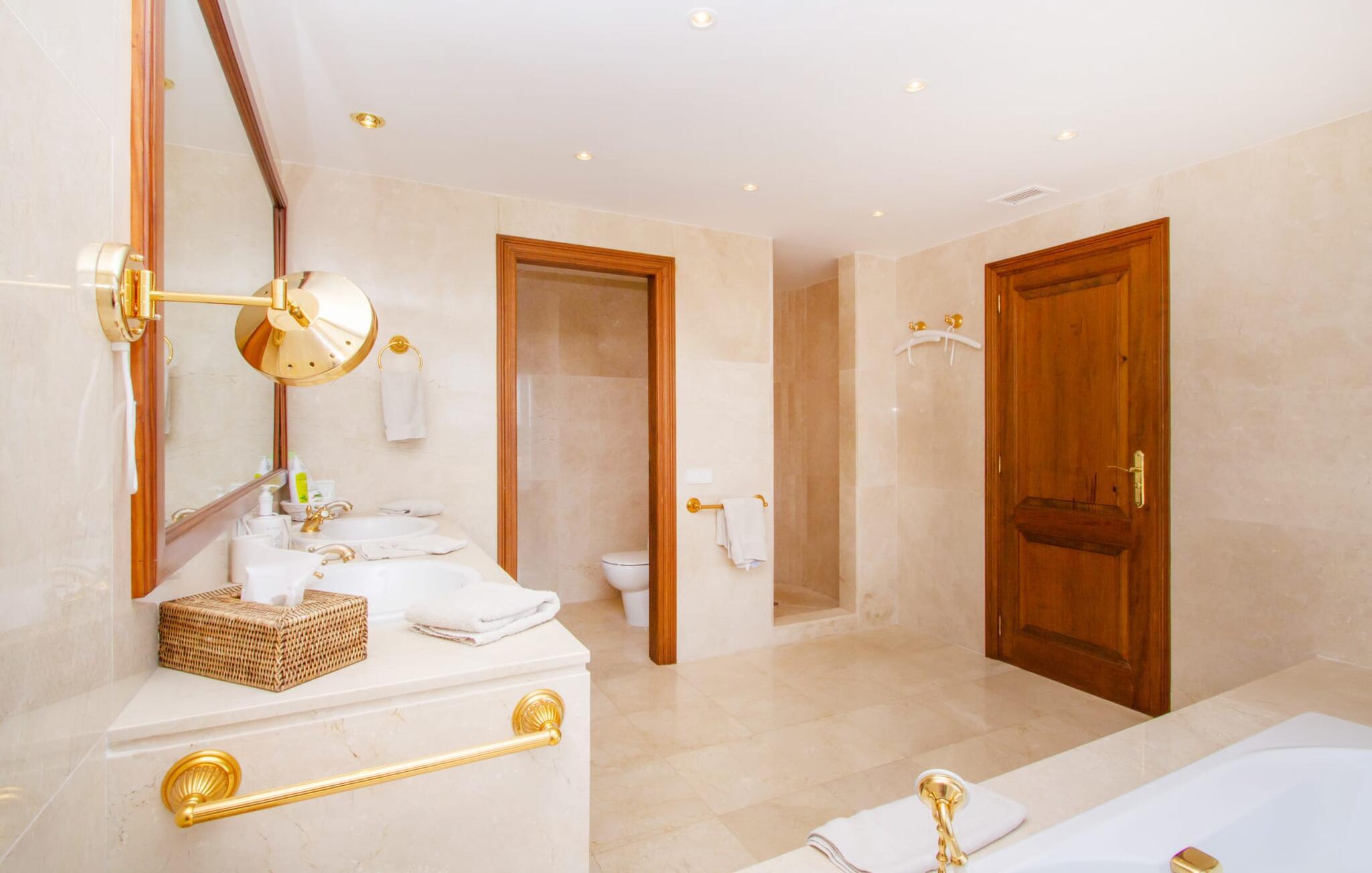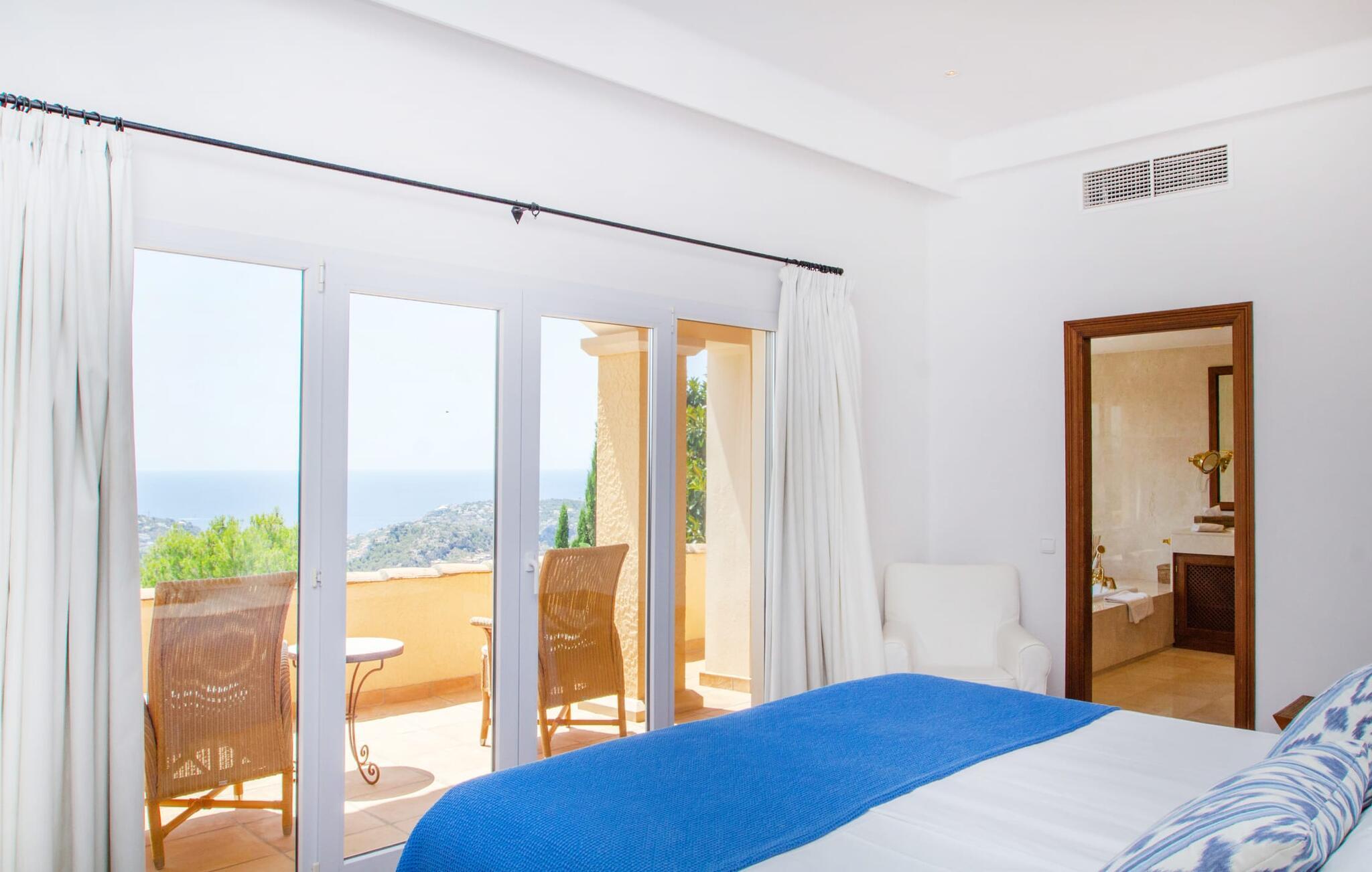 Von der Villa „Ferienvilla Port d'Andratx“ kann man nur in Superlativen sprechen: Eine der stilvollsten Villen thront in hervorragender Alleinlage in einem der vornehmsten Villenviertel Mallorcas, in Mont Ports, oberhalb des schicksten Hafens Stadt, die die Insel Mallorca zu bieten hat. Die gelb-weiße Residenz bietet absoluten Luxus mit zahlreichen Terrassen und Balkonen, umgeben von üppiger mediterraner Vegetation. Majestätische Palmen, Veilchen, schimmernde Bougainvilleen, Zypressen, Olivenbäume, das Mittelmeer und das Tramuntana-Gebirge bilden ein unvergessliches Panorama, das Sie von dieser unglaublichen Villa aus genießen können. Und absolute Privatsphäre genießen Sie bei einem Sprung in den organisch geformten Pool, der auch beheizbar ist und somit auch über die Hochsaison hinaus genutzt werden kann. Beim Ausruhen auf einer der bequemen Liegen unter dem Sonnenschirm finden Sie ultimative Entspannung. Großartig, oder? Aufgrund der Hanglage auf dem sogenannten Millionärshügel führt eine Außentreppe vom Poolbereich zu den überdachten Terrassen am Haus. Hier finden Sie zusätzliche Liegen sowie Lounge-Sitz- und Essbereiche. So richtig gemütlich können Sie es sich im Außenküchenbereich machen, wo Sie Ihre Mahlzeiten zubereiten und von bequemen Korbstühlen aus das eindrucksvolle Abendpanorama der beleuchteten Hafenstadt genießen können.