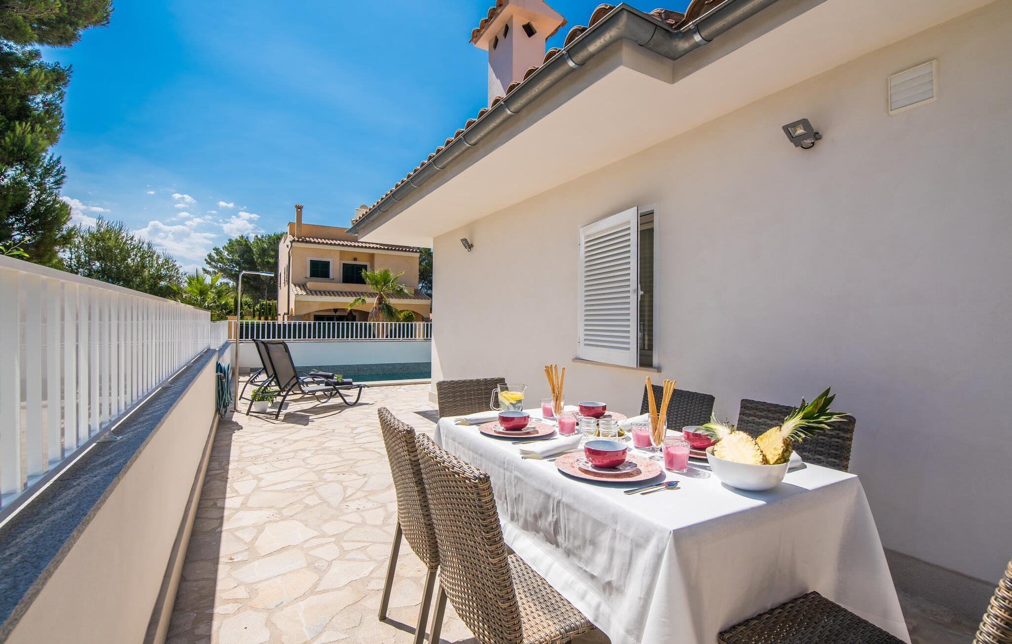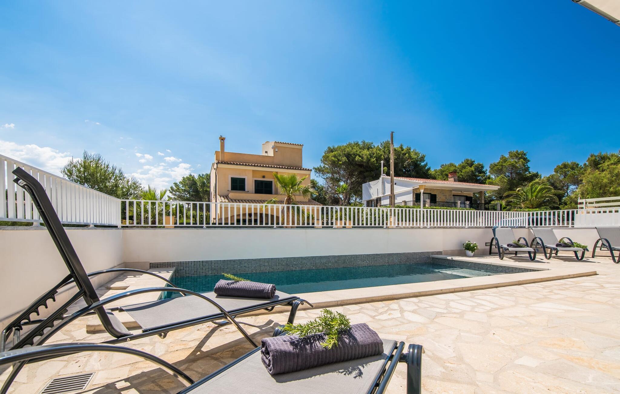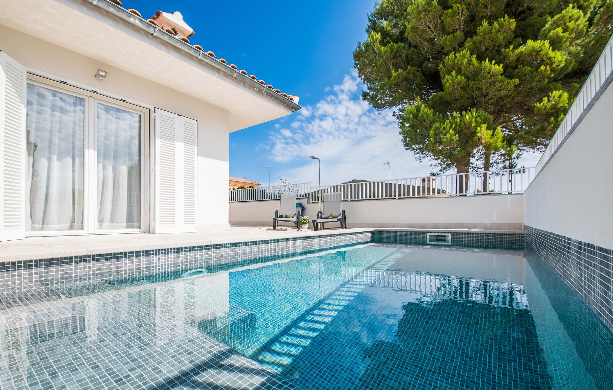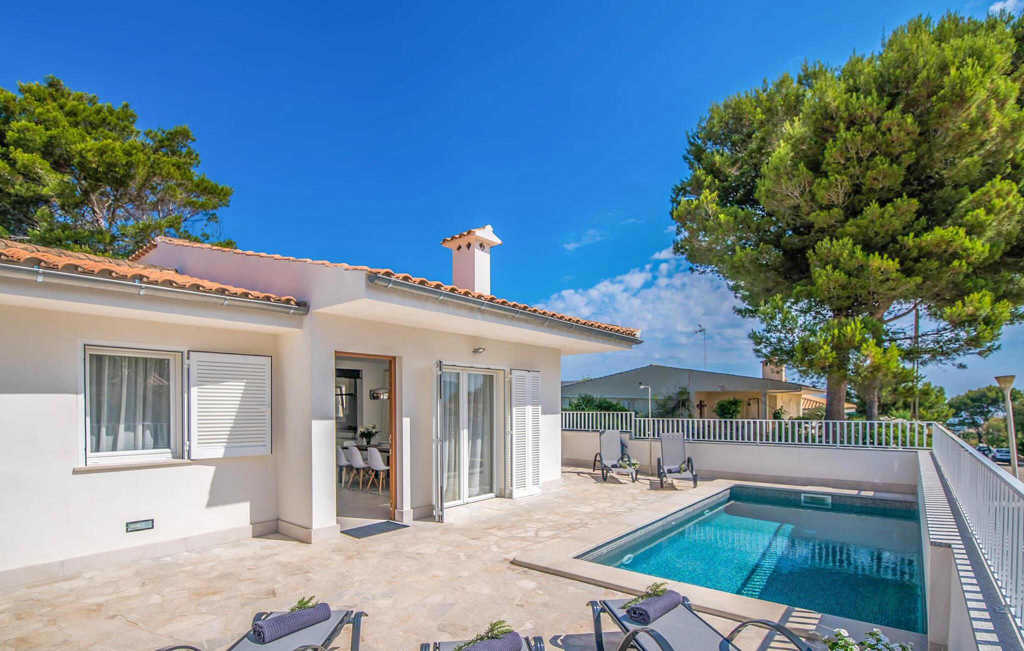 Die Villa „Isabel Son Serra de Marina“ liegt auf einem komplett eingezäunten Grundstück von 315 m². Zwei große Sonnenterrassen vor und hinter dem Haus sind mit modernen, hochwertigen Outdoor-Möbeln ausgestattet. Klare geometrische Formen und ein minimalistisch gestalteter Außenbereich verkörpern eine moderne Interpretation der elementaren und puristischen Tendenzen der 80er Jahre, einen bewussten Bruch mit dem Trend der Wellen von Farben und Formen – dieser Designstil gilt bis heute als wegweisend für beide Richtungen funktional und cool. Ein großer Pool unterschiedlicher Tiefe mit Außendusche direkt neben dem Haus sorgt an warmen Tagen für die nötige Erfrischung; Zum Entspannen stehen bequeme Sonnenliegen bereit. Auf der anderen Seite des Hauses befindet sich eine Terrasse mit eingebautem Holzkohlegrill, großem Esstisch und Sitzmöglichkeiten für bis zu sechs Personen. Genießen Sie ein ausgiebiges Frühstück im Freien oder verbringen Sie gemütliche Stunden bei Kerzenschein, während Sie dem sanften Rauschen der Wellen im Meer lauschen.