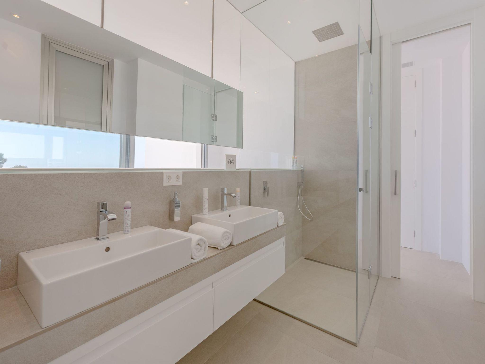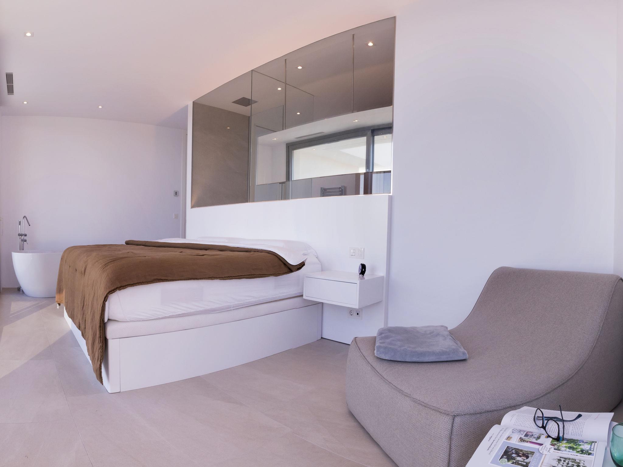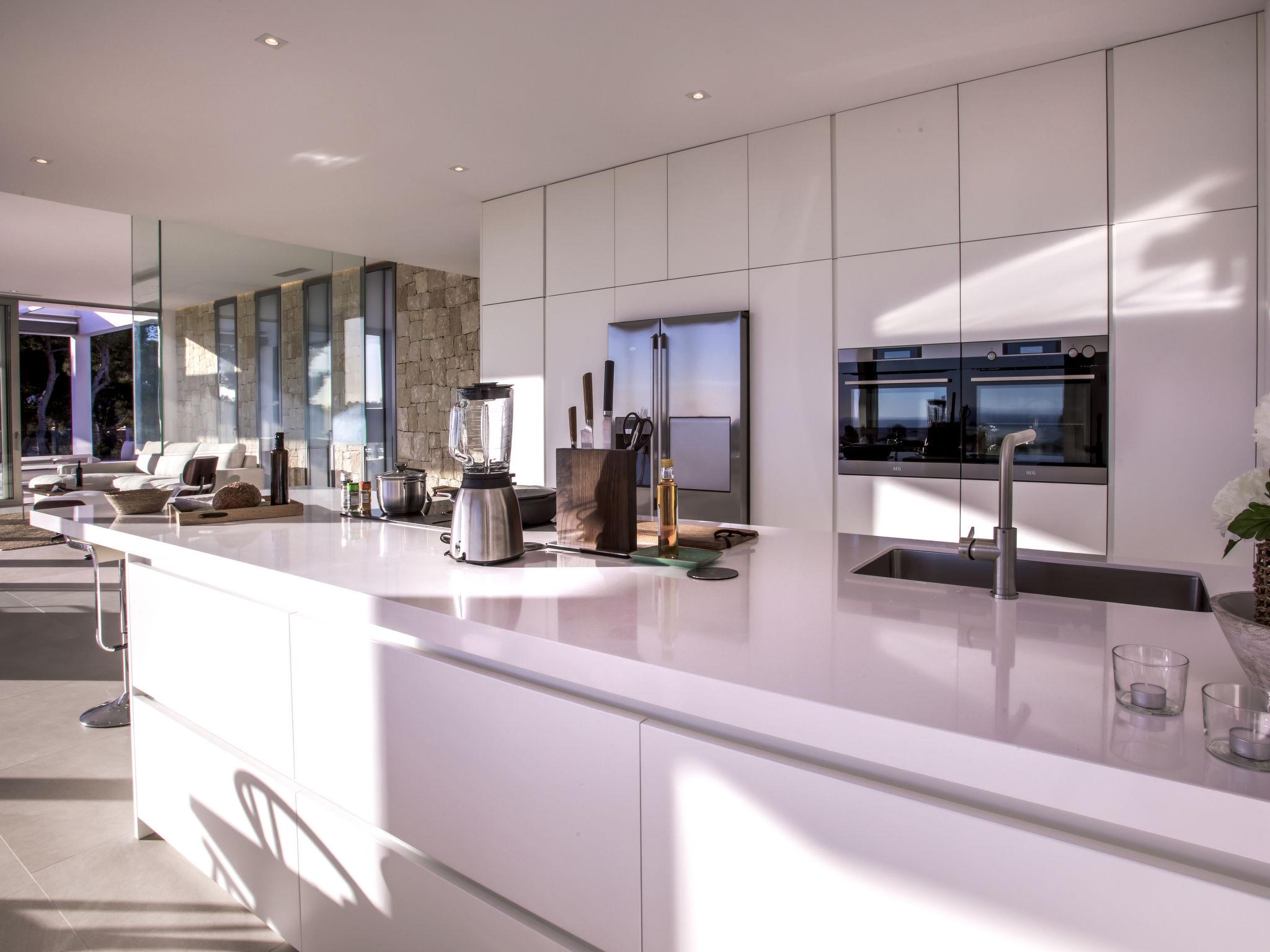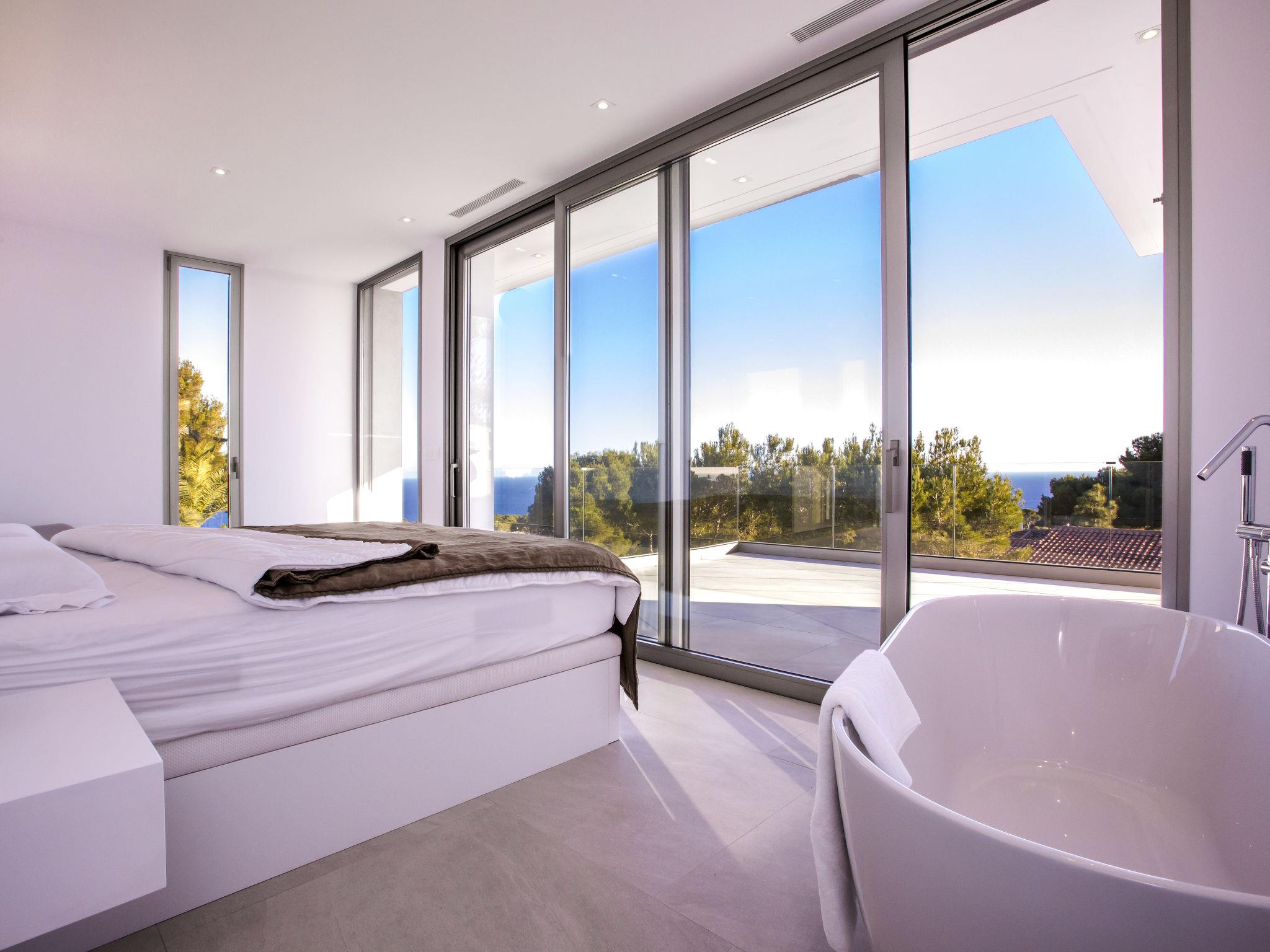 "Villa Halcon al Mar", 6-room villa 460 m2 on 2 levels. Spacious and bright, very modern and luxurious furnishings: living room with open-hearth fireplace, satellite TV, air conditioning and forced-air heating. Exit to the terrace. Dining room with air conditioning and forced-air heating. Exit to the terrace. Luggage room. 1 room with 1 french bed (200 cm, length 200 cm), bathroom, shower/WC, double hand-basin, air conditioning and forced-air heating. Exit to the terrace. Large, open kitchen (oven, dishwasher, 4 induction hot plates, toaster, kettle, freezer, electric coffee machine, combination microwave) with bar, dining table. Exit to the terrace. Sep. WC. Floor heating. On the lower ground floor: 1 room with 1 french bed (200 cm, length 200 cm), shower/WC, satellite TV, air conditioning and forced-air heating. Exit to the patio, to the swimming pool. 1 room with 1 french bed (160 cm, length 200 cm), shower/WC, satellite TV, air conditioning and forced-air heating. Exit to the patio, to the swimming pool. 1 room with 1 french bed (160 cm, length 200 cm), satellite TV, air conditioning and forced-air heating. Exit to the patio, to the swimming pool. Luggage room with hand-basin. Exit to the terrace. Open kitchen (2 induction hot plates, microwave, electric coffee machine). Sep. WC. Floor heating. Large terrace 190 m2, large terrace 160 m2, large garden, lawn. Terrace furniture, barbecue, deck chairs, covered balcony. Marvellous panoramic view of the sea and the countryside. Facilities: washing machine, dryer, iron, children's high chair, baby cot, hair dryer. Internet (WiFi, free). Parking (3 cars), garage. E-charging station. VT-441177-A // Reg. Nr.: ESFCTU00000307100098832900000000000000000VT-488279-A7