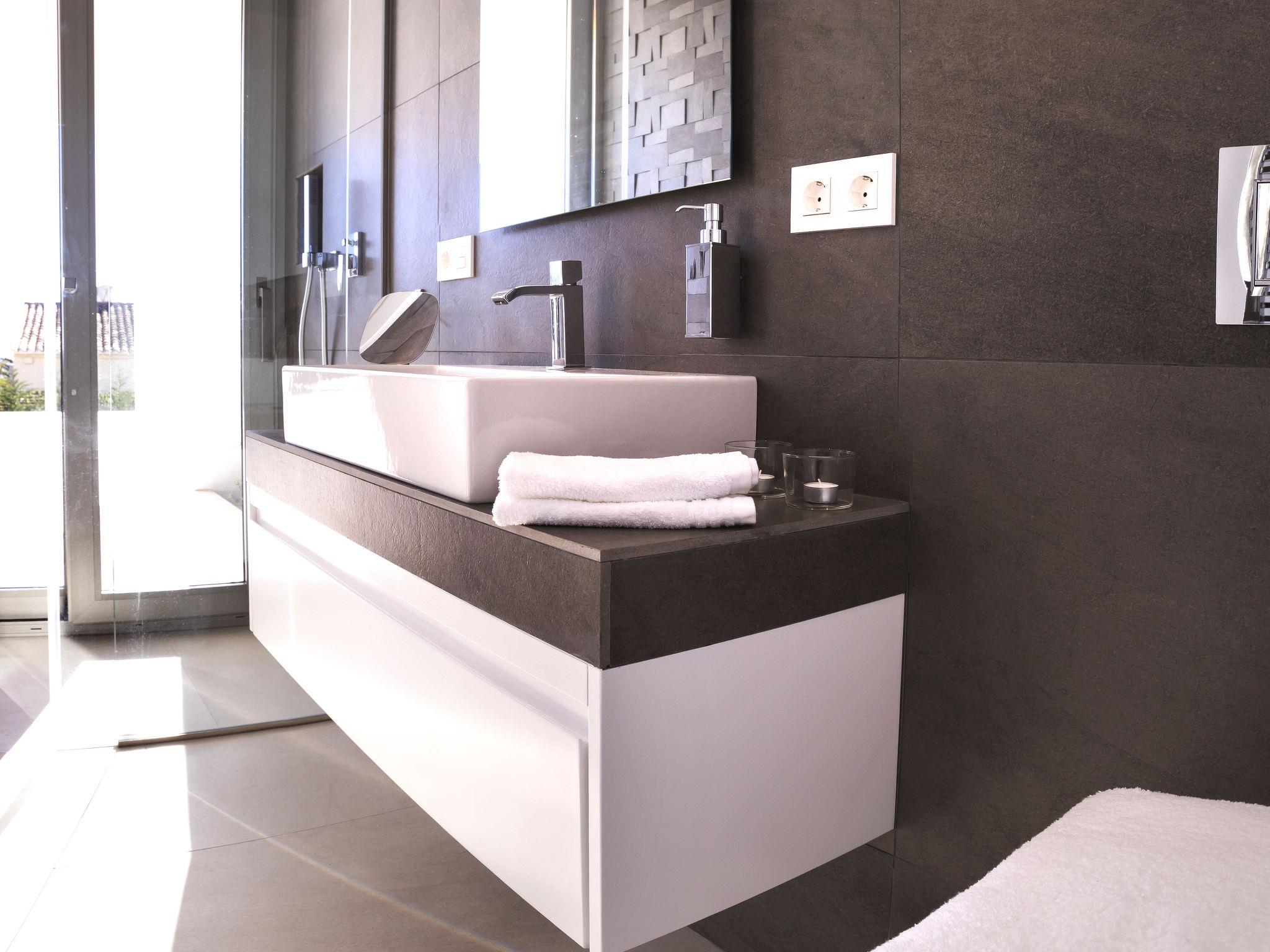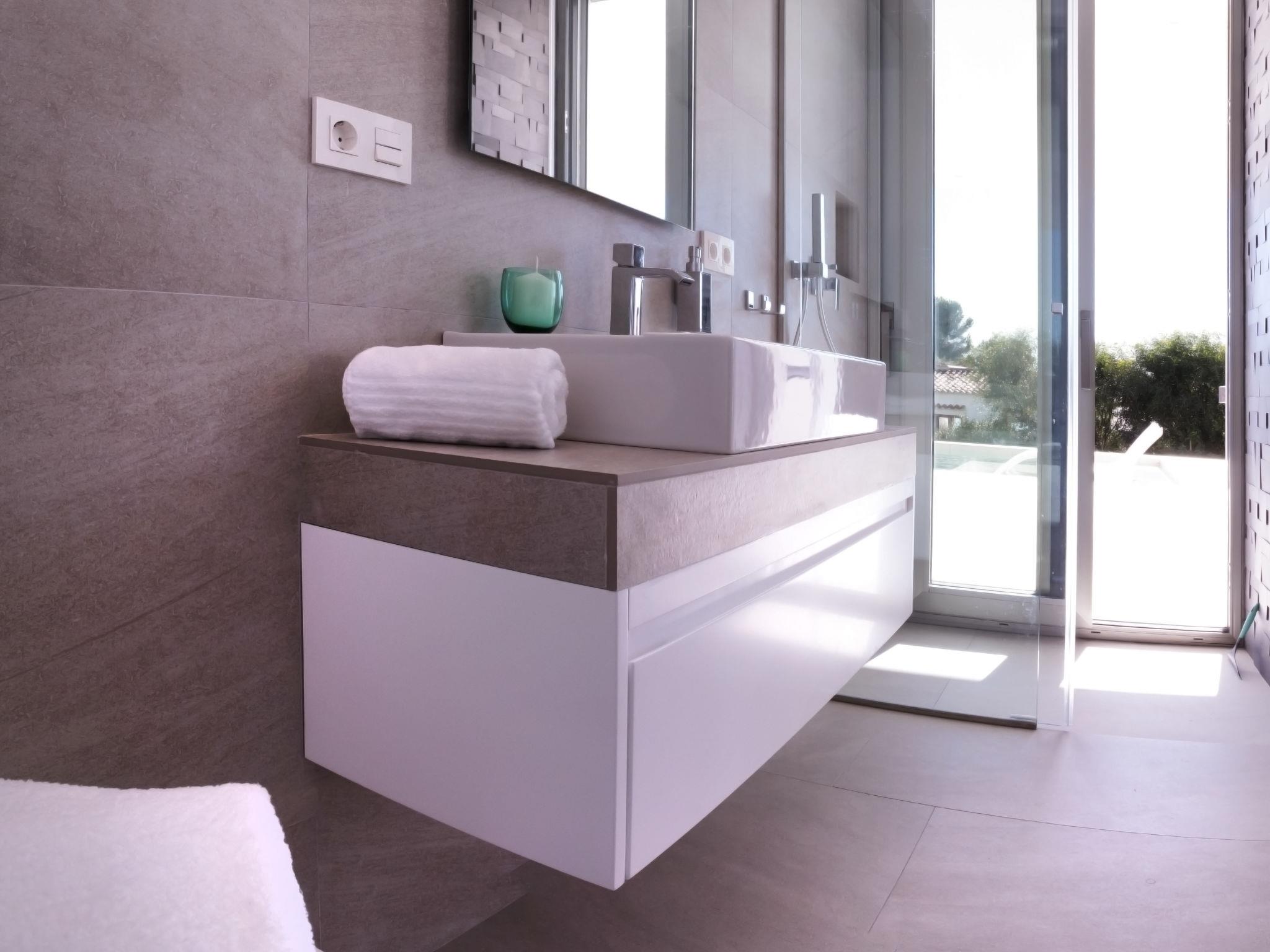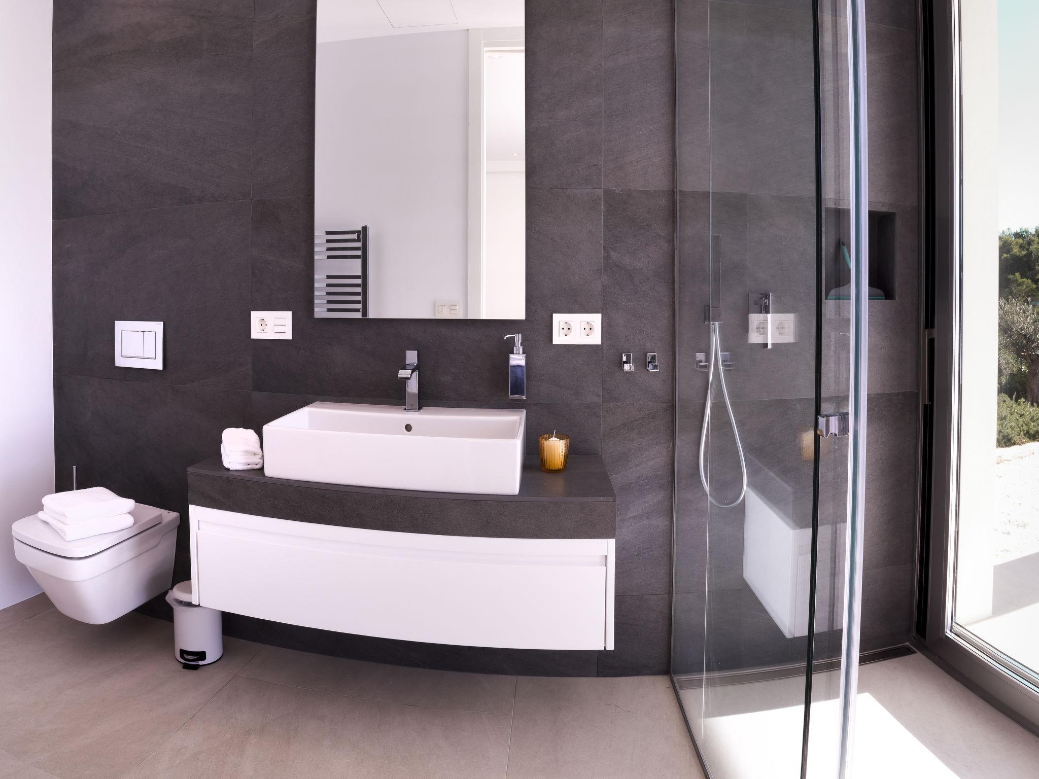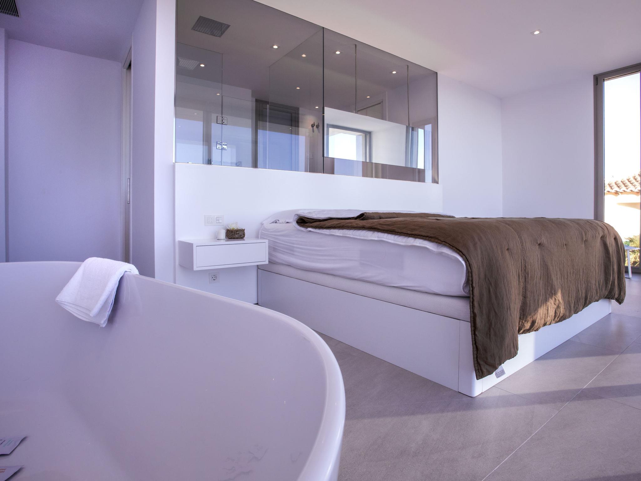 "Villa Halcon al Mar", 6-room villa 460 m2 on 2 levels. Spacious and bright, very modern and luxurious furnishings: living room with open-hearth fireplace, satellite TV, air conditioning and forced-air heating. Exit to the terrace. Dining room with air conditioning and forced-air heating. Exit to the terrace. Luggage room. 1 room with 1 french bed (200 cm, length 200 cm), bathroom, shower/WC, double hand-basin, air conditioning and forced-air heating. Exit to the terrace. Large, open kitchen (oven, dishwasher, 4 induction hot plates, toaster, kettle, freezer, electric coffee machine, combination microwave) with bar, dining table. Exit to the terrace. Sep. WC. Floor heating. On the lower ground floor: 1 room with 1 french bed (200 cm, length 200 cm), shower/WC, satellite TV, air conditioning and forced-air heating. Exit to the patio, to the swimming pool. 1 room with 1 french bed (160 cm, length 200 cm), shower/WC, satellite TV, air conditioning and forced-air heating. Exit to the patio, to the swimming pool. 1 room with 1 french bed (160 cm, length 200 cm), satellite TV, air conditioning and forced-air heating. Exit to the patio, to the swimming pool. Luggage room with hand-basin. Exit to the terrace. Open kitchen (2 induction hot plates, microwave, electric coffee machine). Sep. WC. Floor heating. Large terrace 190 m2, large terrace 160 m2, large garden, lawn. Terrace furniture, barbecue, deck chairs, covered balcony. Marvellous panoramic view of the sea and the countryside. Facilities: washing machine, dryer, iron, children's high chair, baby cot, hair dryer. Internet (WiFi, free). Parking (3 cars), garage. E-charging station. VT-441177-A // Reg. Nr.: ESFCTU00000307100098832900000000000000000VT-488279-A7