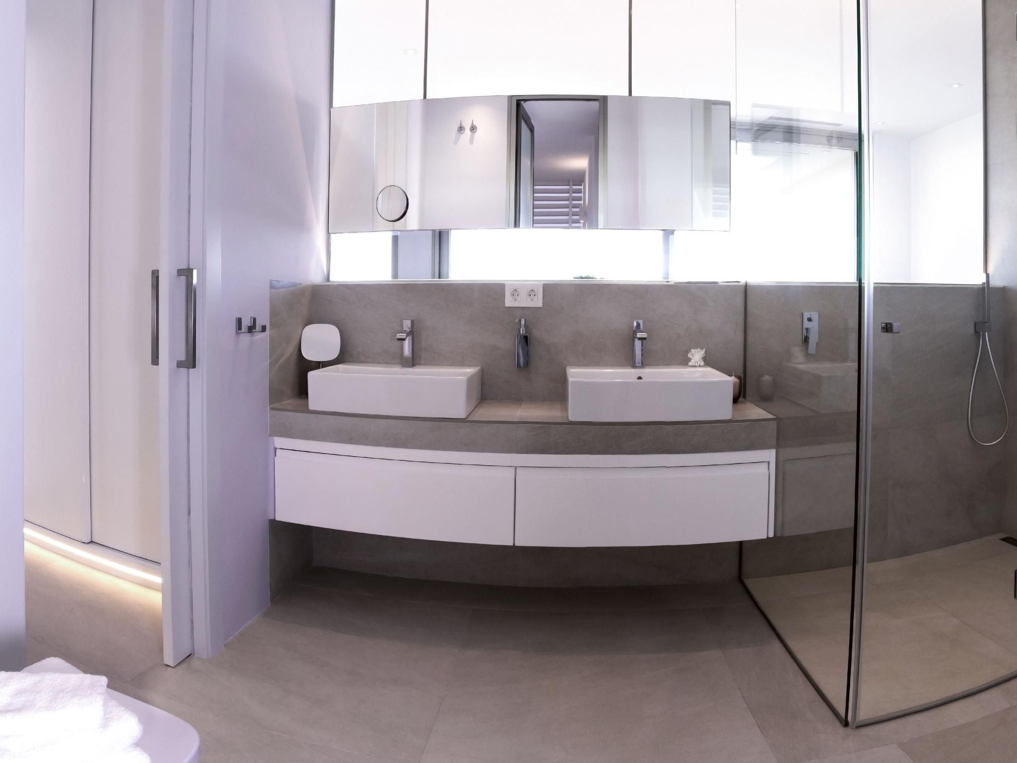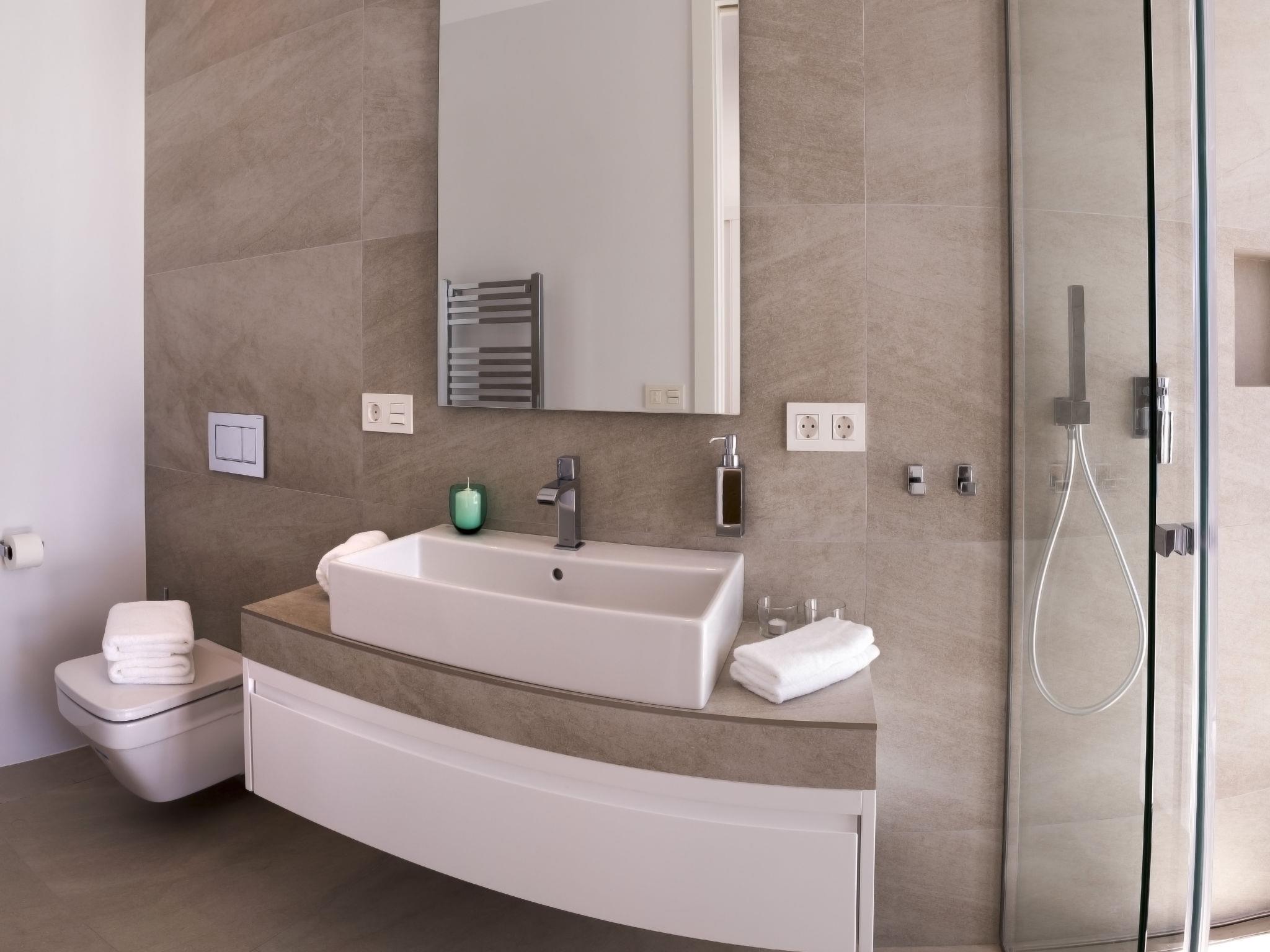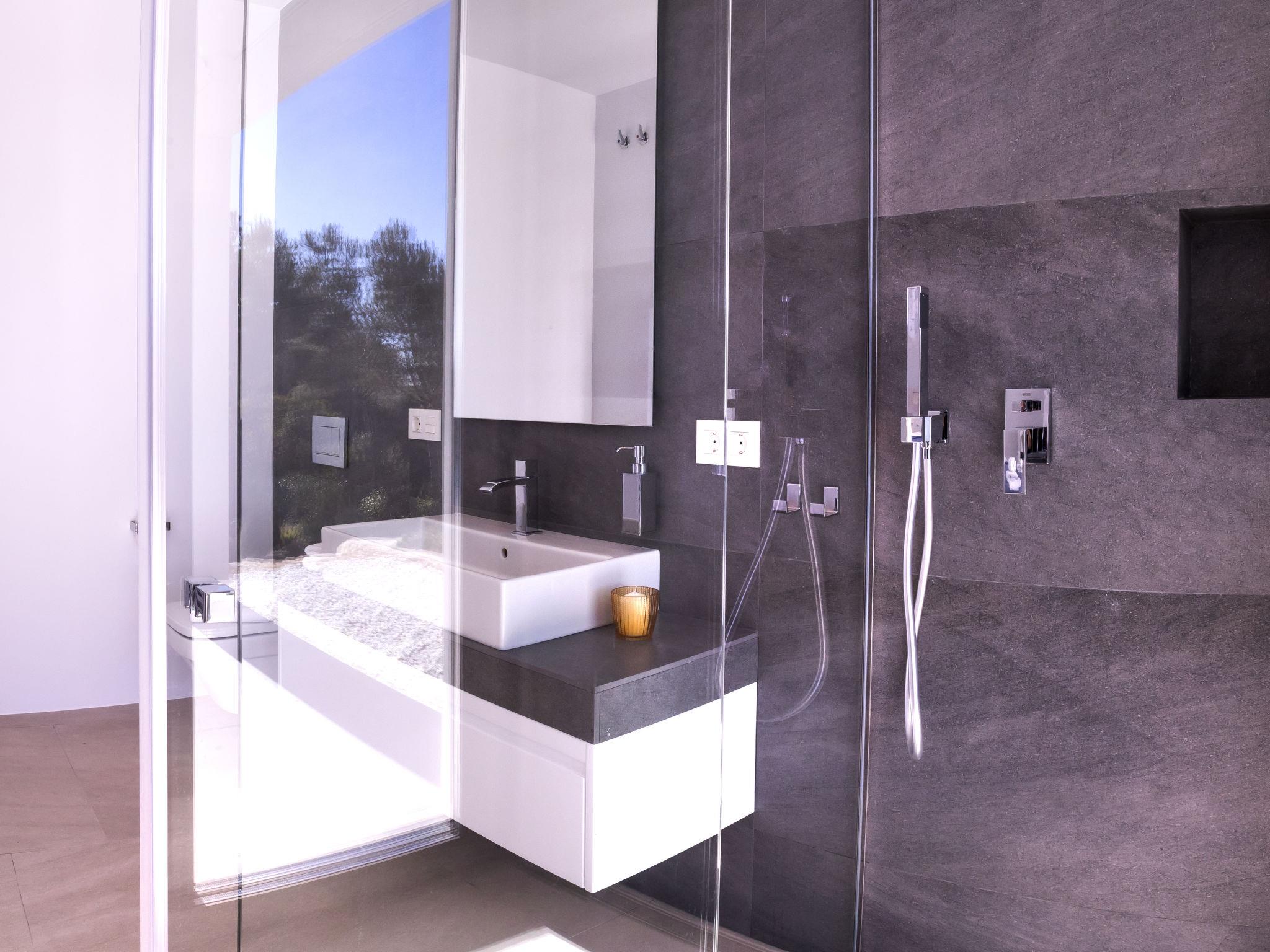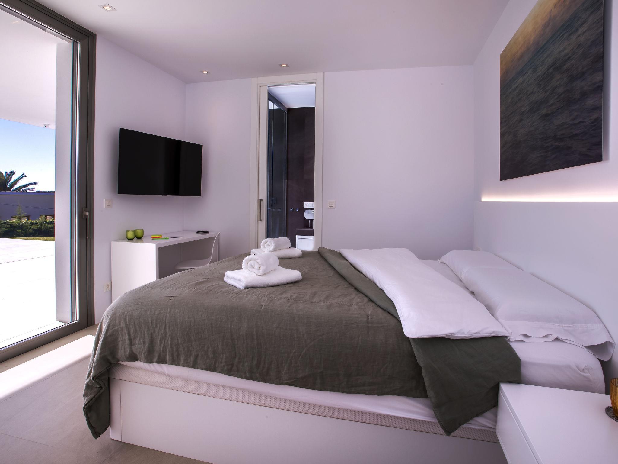 "Villa Halcon al Mar", 6-room villa 460 m2 on 2 levels. Spacious and bright, very modern and luxurious furnishings: living room with open-hearth fireplace, satellite TV, air conditioning and forced-air heating. Exit to the terrace. Dining room with air conditioning and forced-air heating. Exit to the terrace. Luggage room. 1 room with 1 french bed (200 cm, length 200 cm), bathroom, shower/WC, double hand-basin, air conditioning and forced-air heating. Exit to the terrace. Large, open kitchen (oven, dishwasher, 4 induction hot plates, toaster, kettle, freezer, electric coffee machine, combination microwave) with bar, dining table. Exit to the terrace. Sep. WC. Floor heating. On the lower ground floor: 1 room with 1 french bed (200 cm, length 200 cm), shower/WC, satellite TV, air conditioning and forced-air heating. Exit to the patio, to the swimming pool. 1 room with 1 french bed (160 cm, length 200 cm), shower/WC, satellite TV, air conditioning and forced-air heating. Exit to the patio, to the swimming pool. 1 room with 1 french bed (160 cm, length 200 cm), satellite TV, air conditioning and forced-air heating. Exit to the patio, to the swimming pool. Luggage room with hand-basin. Exit to the terrace. Open kitchen (2 induction hot plates, microwave, electric coffee machine). Sep. WC. Floor heating. Large terrace 190 m2, large terrace 160 m2, large garden, lawn. Terrace furniture, barbecue, deck chairs, covered balcony. Marvellous panoramic view of the sea and the countryside. Facilities: washing machine, dryer, iron, children's high chair, baby cot, hair dryer. Internet (WiFi, free). Parking (3 cars), garage. E-charging station. VT-441177-A // Reg. Nr.: ESFCTU00000307100098832900000000000000000VT-488279-A7