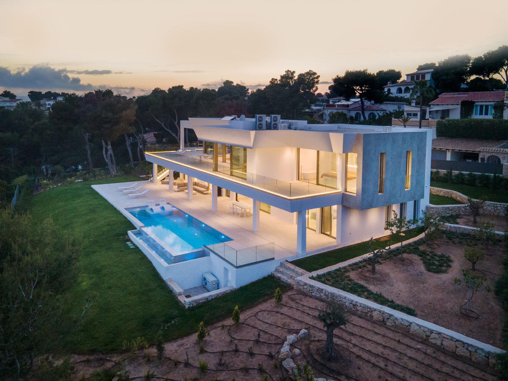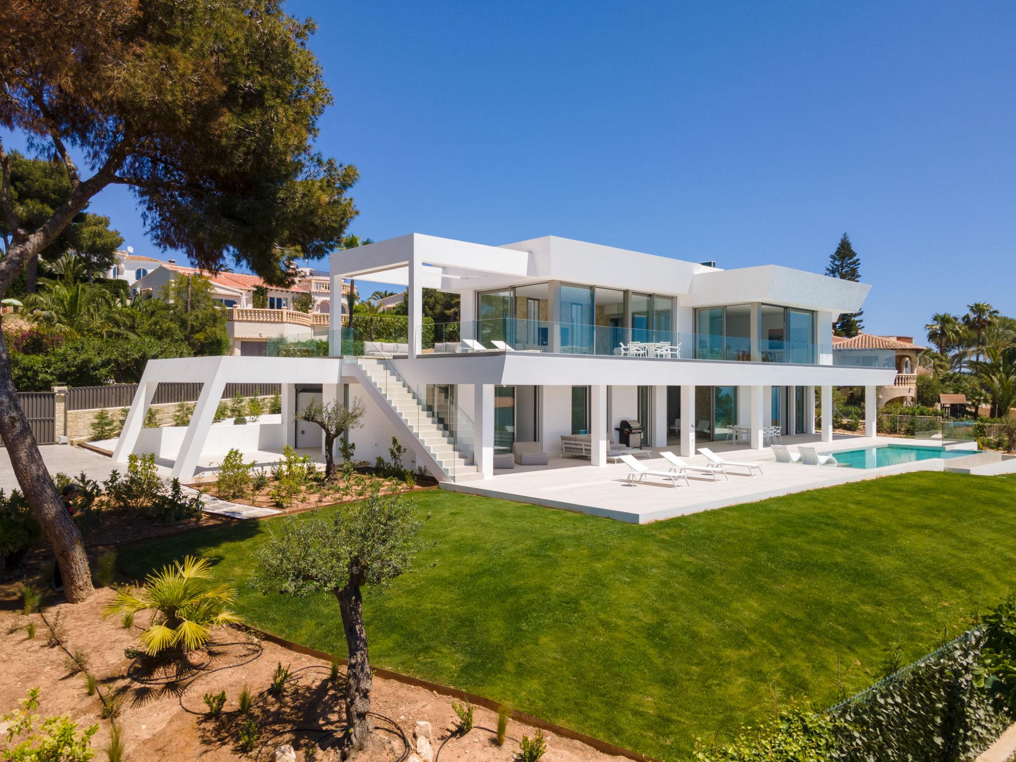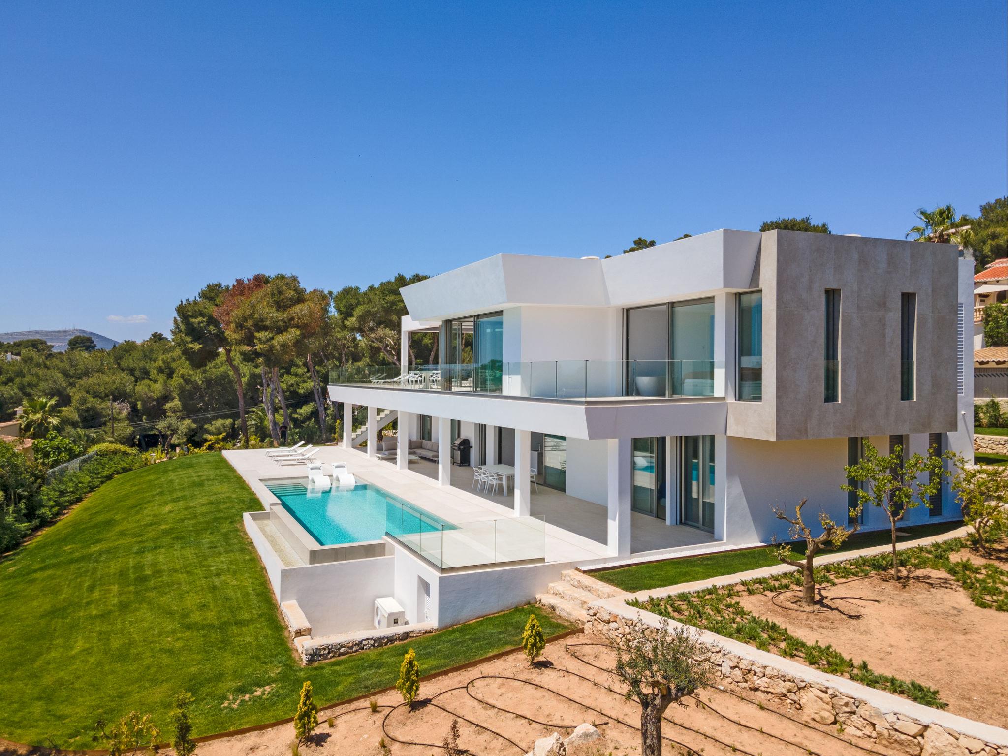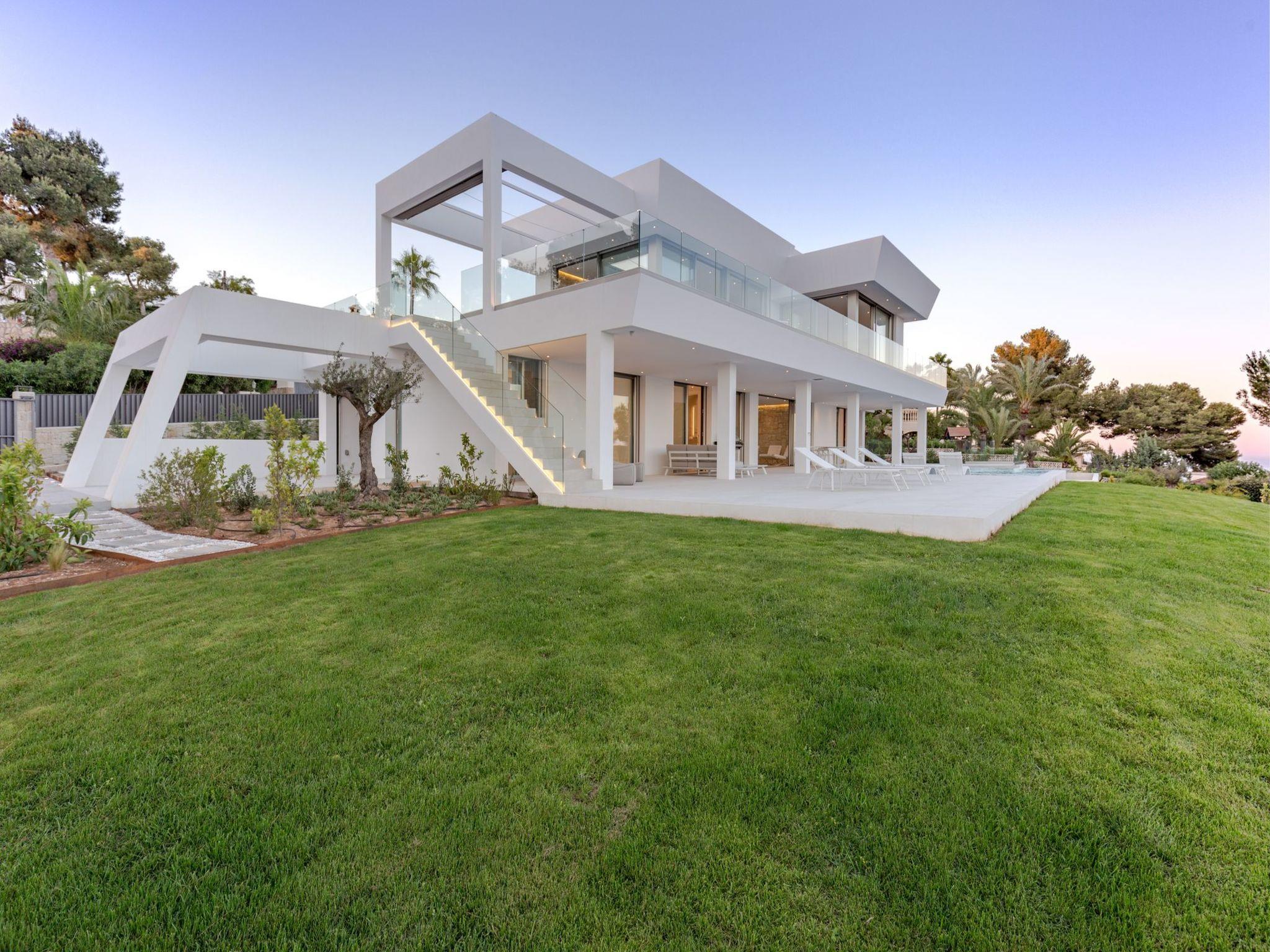 Very large, very modern, very luxurious villa "Halcon al Mar", 2 storeys, built in 2021. In the resort Jávea - Balcón al Mar, in a quiet, sunny position, 1 km from the sea, 3.5 km from the beach. Private: property with lawn and trees, beautiful garden to relax, swimming pool angular, heated (12 x 4 m, depth 100 - 200 cm, seasonal availability: 01.Jan. - 31.Dec.) with internal staircase. Outdoor shower, patio (190 m2), garden furniture, barbecue. In the house: lift, central heating system, air conditioning. Parking on the premises, single garage. E-charging station. Supermarket 600 m, restaurant 400 m, bus stop "Toscamar" 4.3 km, sandy beach "El Arenal" 6 km, shingle beach "Cala Granadella" 4.8 km, rocky beach "Cala Portitxol - La Barraca" 3.5 km. Sports harbour 6 km, golf course (9 hole) 10 km, surf school 3.5 km, sailing school 3.5 km, tennis 600 m. The owner does not accept any youth groups.