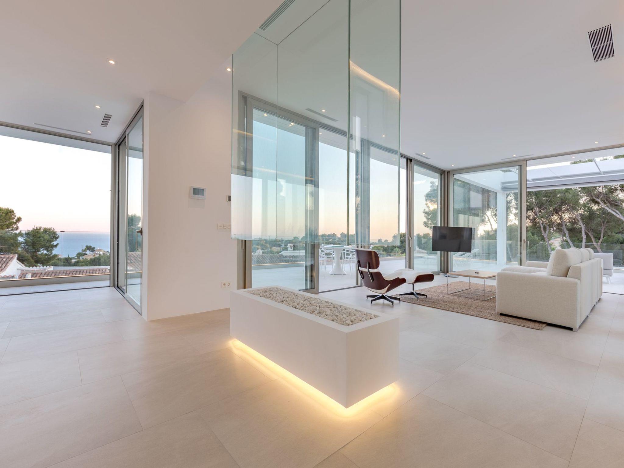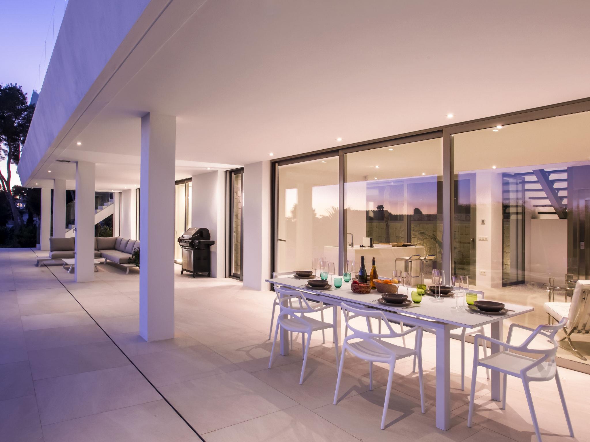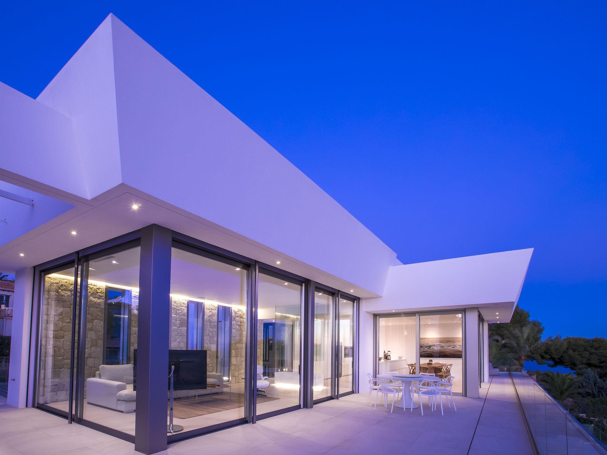 Very large, very modern, very luxurious villa "Halcon al Mar", 2 storeys, built in 2021. In the resort Jávea - Balcón al Mar, in a quiet, sunny position, 1 km from the sea, 3.5 km from the beach. Private: property with lawn and trees, beautiful garden to relax, swimming pool angular, heated (12 x 4 m, depth 100 - 200 cm, seasonal availability: 01.Jan. - 31.Dec.) with internal staircase. Outdoor shower, patio (190 m2), garden furniture, barbecue. In the house: lift, central heating system, air conditioning. Parking on the premises, single garage. E-charging station. Supermarket 600 m, restaurant 400 m, bus stop "Toscamar" 4.3 km, sandy beach "El Arenal" 6 km, shingle beach "Cala Granadella" 4.8 km, rocky beach "Cala Portitxol - La Barraca" 3.5 km. Sports harbour 6 km, golf course (9 hole) 10 km, surf school 3.5 km, sailing school 3.5 km, tennis 600 m. The owner does not accept any youth groups.